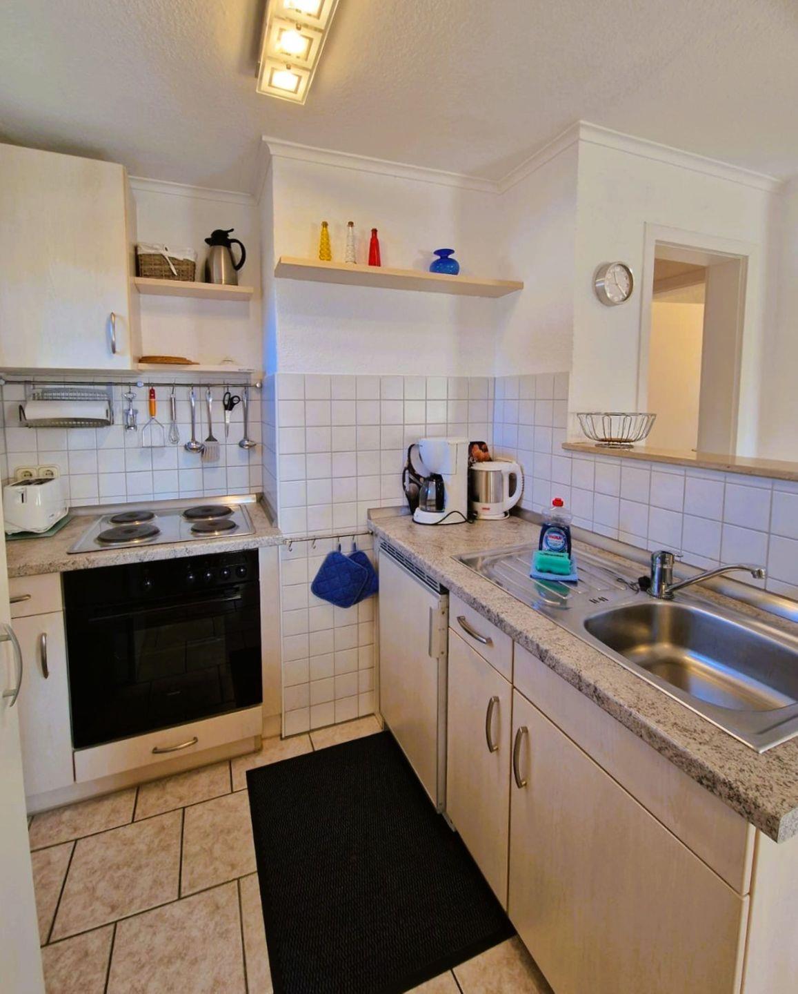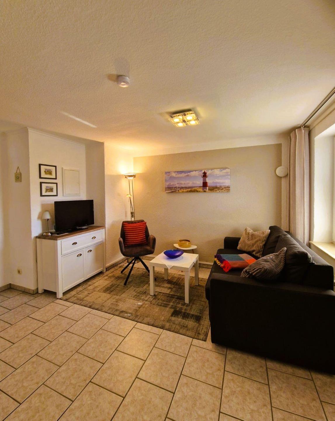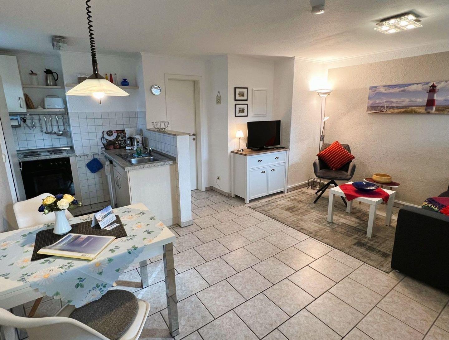 Wohnzimmer mit Schlafsofa, SAT-TV, Radio mit CD Player, Küchenzeile (E-Herd mit Backröhre, Kaffeemaschine, Toaster, Wasserkocher, Kühlschrank mit Frostfach), Schlafzimmer mit Ehebett, Dusche/WC, Fön, Kosmetikspiegel, Handtuchtrockner, Schranksafe, eine Aufbettung mit einem Kinderreisebett ist leider nicht möglich.