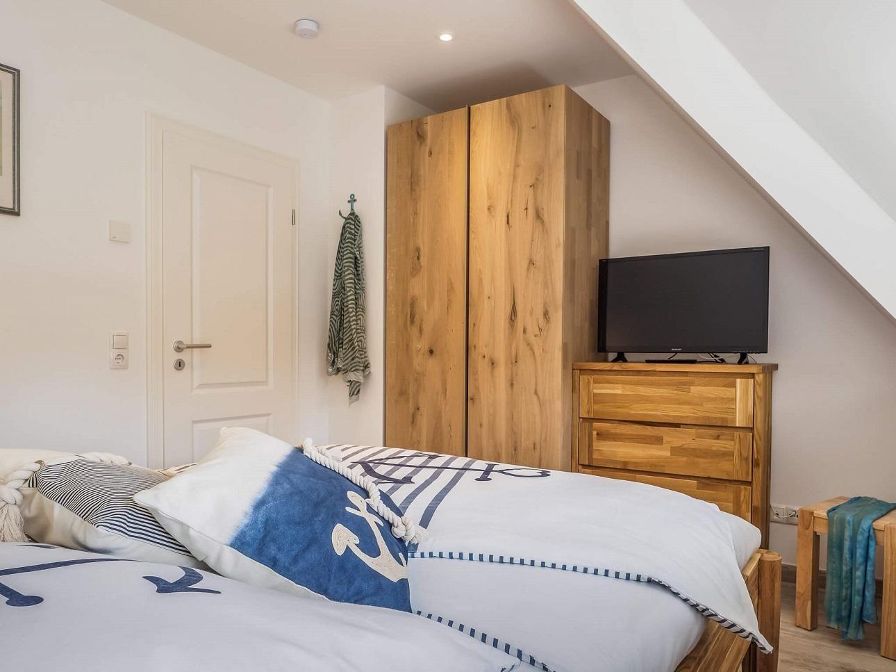 Im Obergeschoss befinden sich ein großes Schlafzimmer mit einem Doppelbett (180 x 200 cm), zwei Nachttischen, ein Kleiderschrank, eine Kommode sowie ein Flachbildfernseher, das Gaubenzimmer mit einem Doppelbett (160 x 200 cm), zwei Nachttischen, einem Kleiderschrank, eine Kommode sowie einem Flachbildfernseher, das „Kinderzimmer“ mit zwei Einzelbetten (100 x 200 cm), Nachtkommode und zwei Kommodenschränken und ein großes Bad mit Badewanne, Dusche, Handtuchtrockner und Fön.