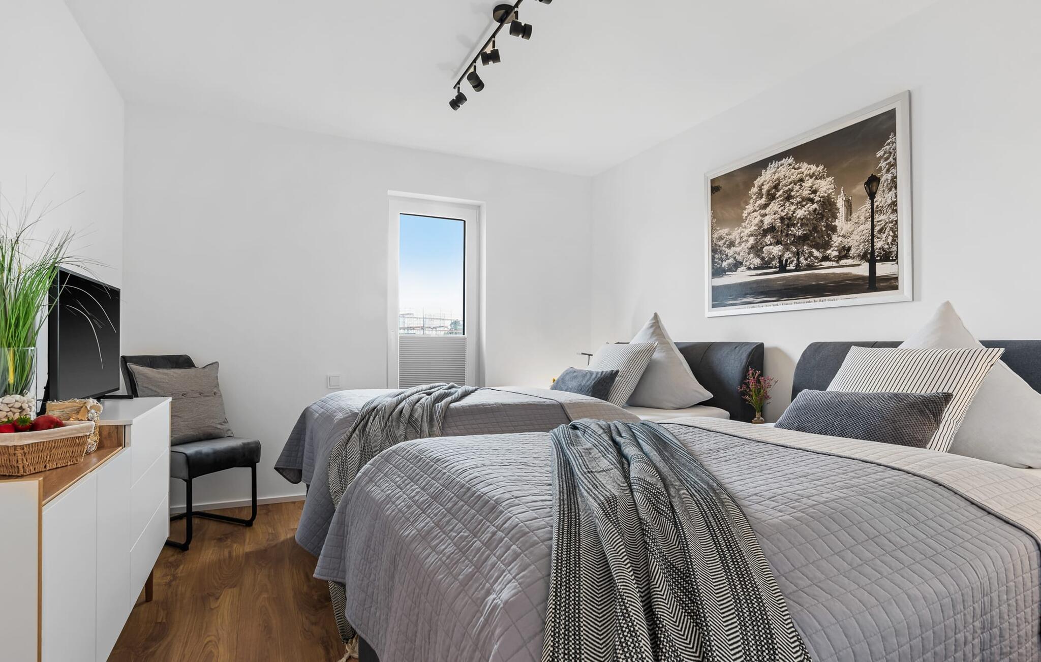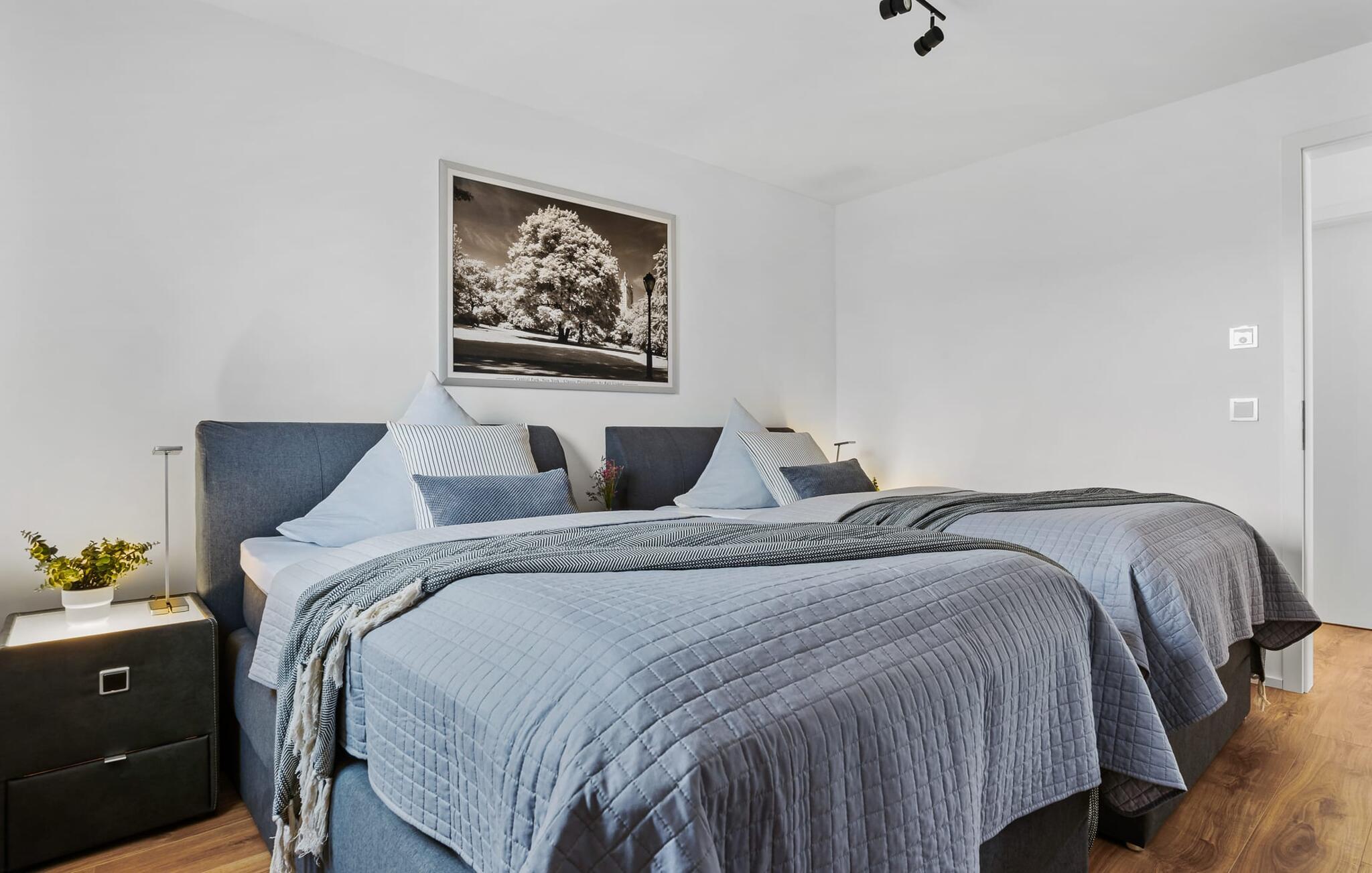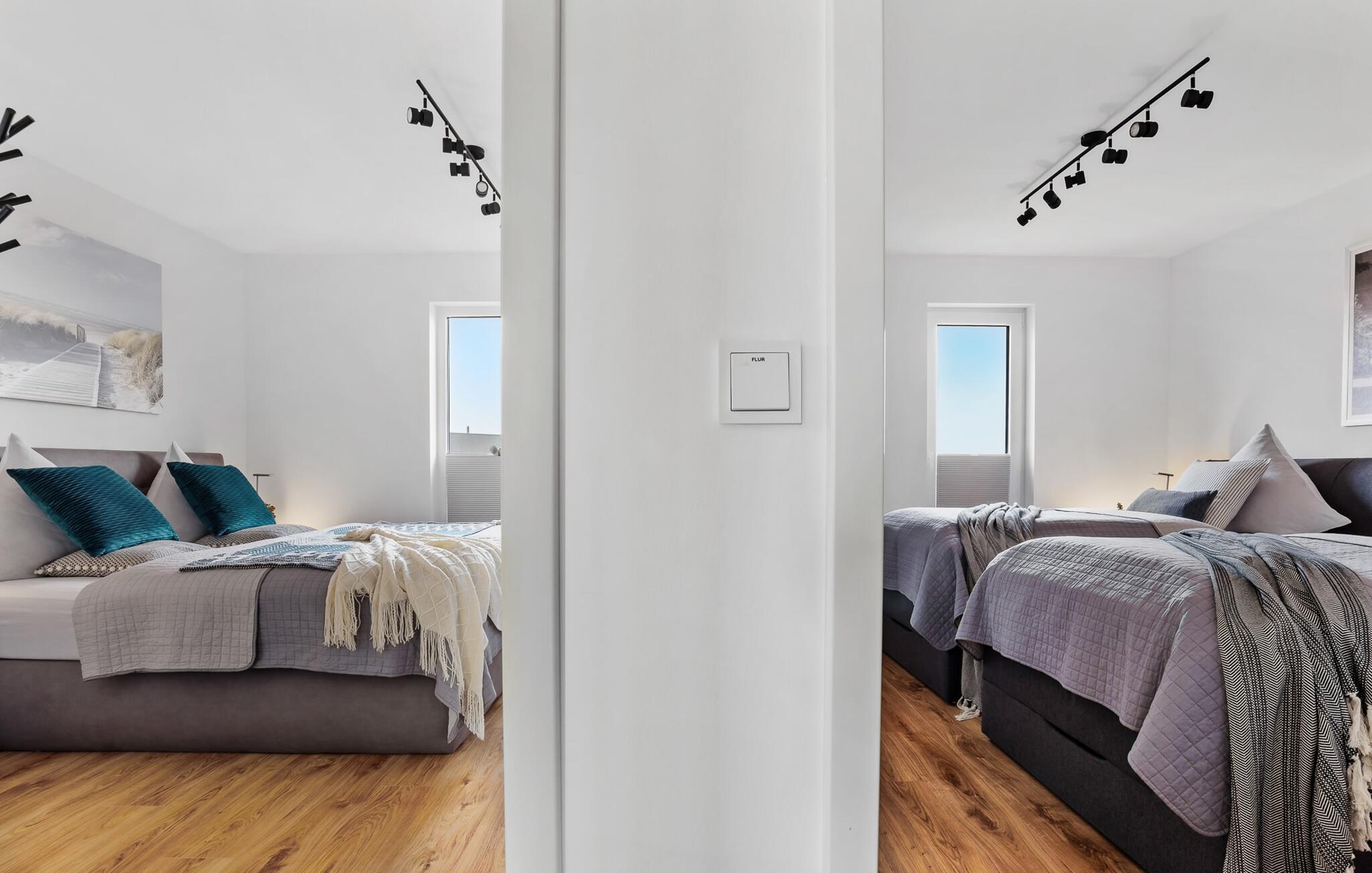Fu¨r die nächtliche Erholung stehen zwei Schlafzimmer mit komfortablen Boxspringbetten bereit. Das erste Schlafzimmer ist mit einem Doppelbett (180 x 200 cm) ausgestattet, während das zweite Schlafzimmer mit zwei großen Einzelbetten (120 x 200 cm) zu erholsamen Nächten einlädt. Zusätzlich besitzen beide Schlafzimmer abdunkelnde Plissees, die zu einem ungestörten Schlaf beitragen.