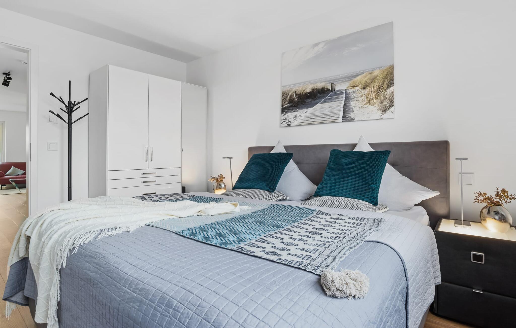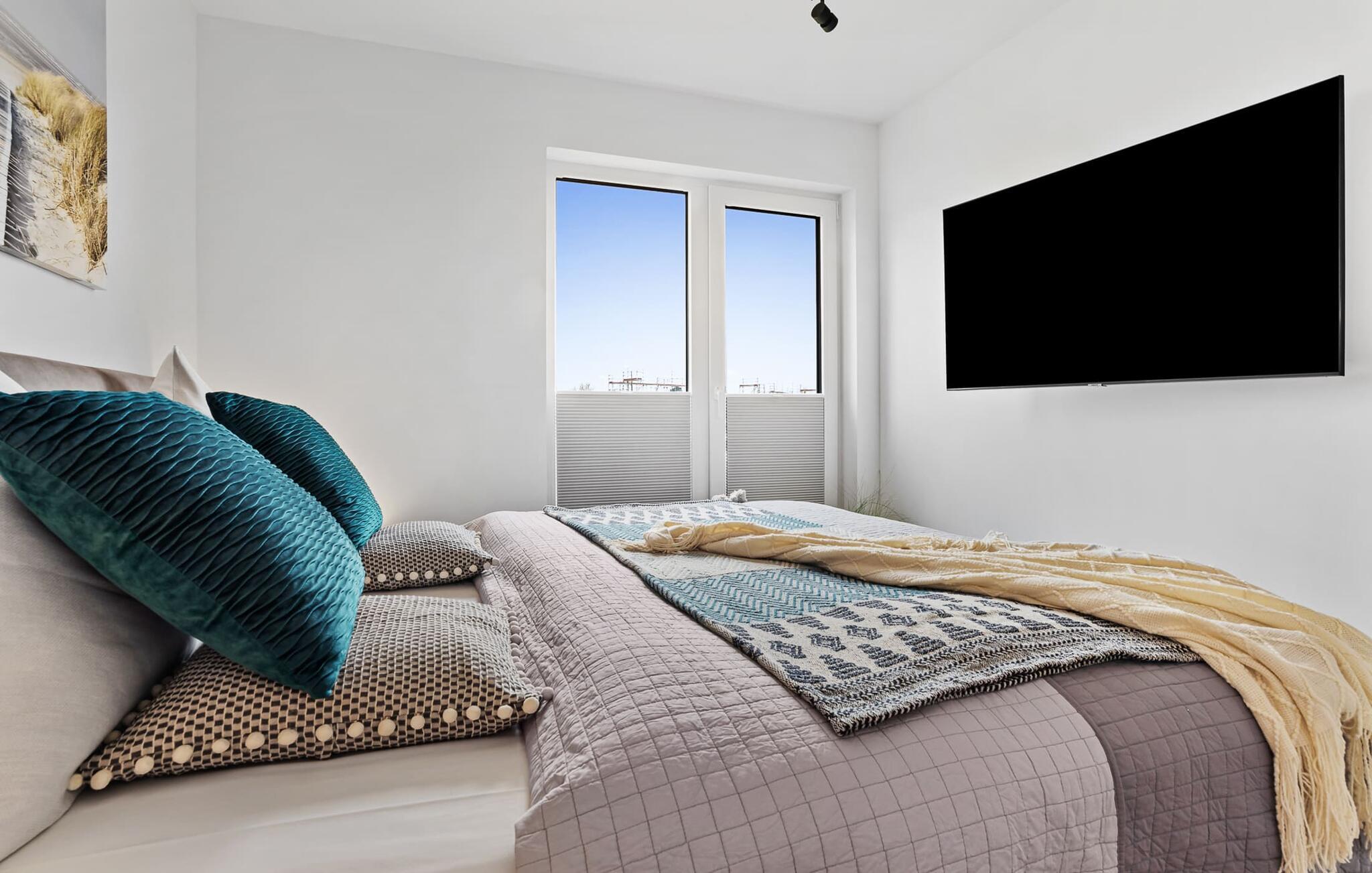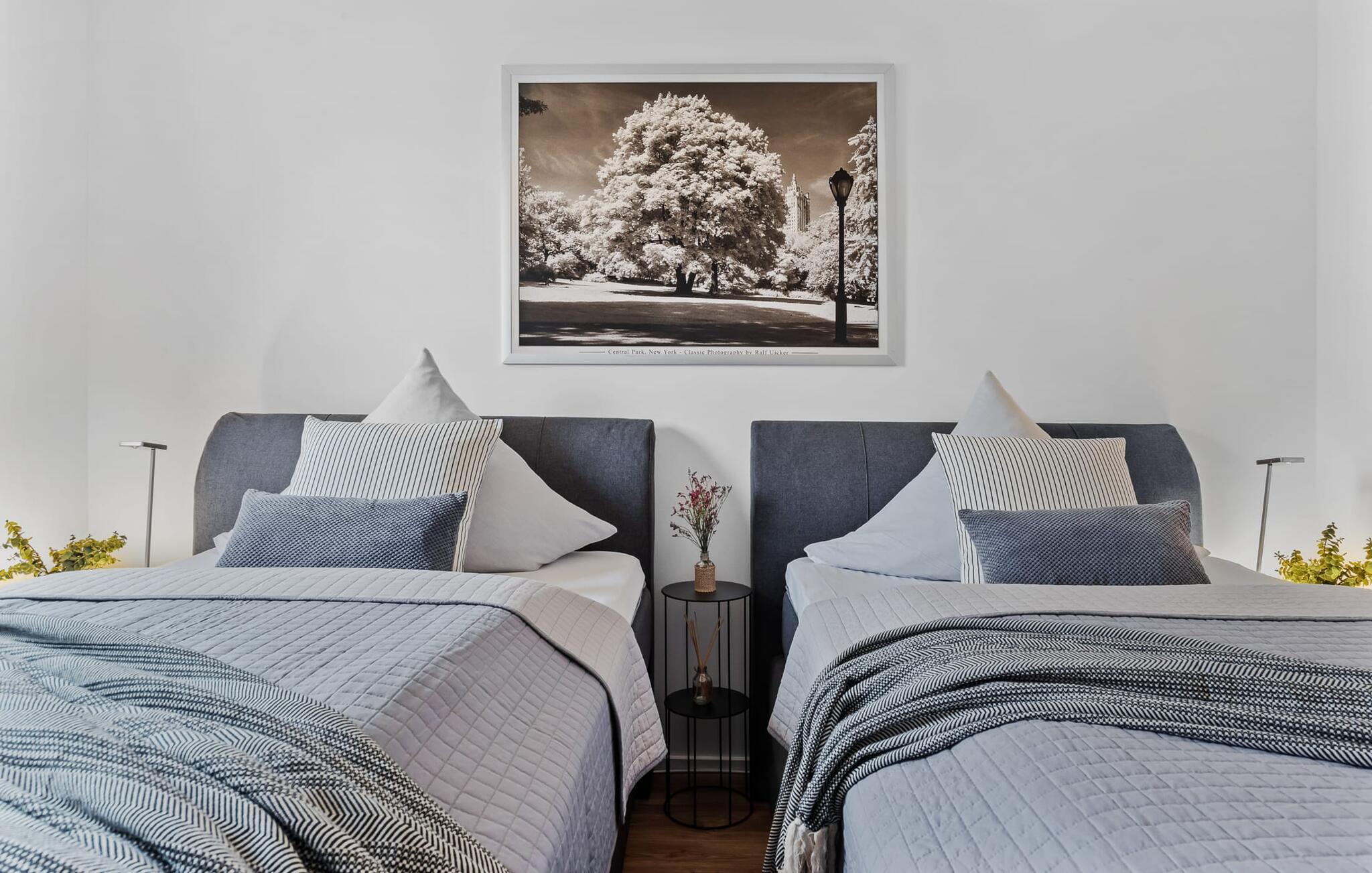Fu¨r die nächtliche Erholung stehen zwei Schlafzimmer mit komfortablen Boxspringbetten bereit. Das erste Schlafzimmer ist mit einem Doppelbett (180 x 200 cm) ausgestattet, während das zweite Schlafzimmer mit zwei großen Einzelbetten (120 x 200 cm) zu erholsamen Nächten einlädt. Zusätzlich besitzen beide Schlafzimmer abdunkelnde Plissees, die zu einem ungestörten Schlaf beitragen.