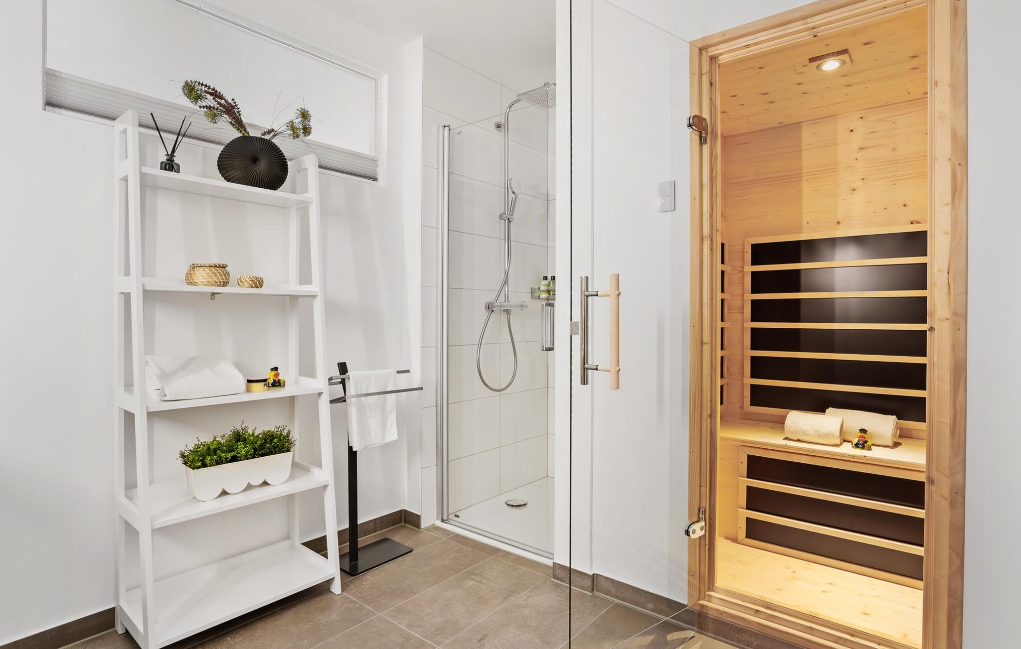 Das Duschbad mit bodengleicher Dusche und einer Infrarot-Kabine sorgt für unvergessliche Wellnessmomente von denen ihr noch lange zehren könnt.