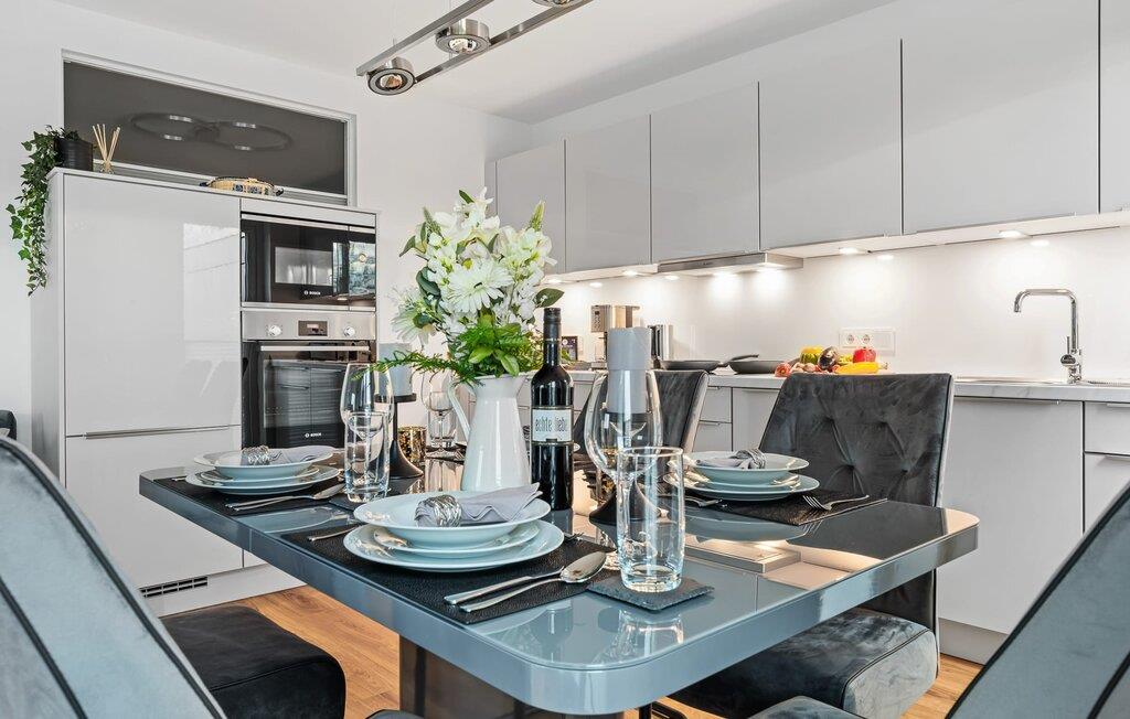 Mit seiner bodentiefen Fensterfront und der angrenzenden großen Terrasse ist der lichtdurchflutete offene Wohn/-Essbereich das Herz der Wohnung. Eintreten und sich sofort zuhause fu¨hlen! Ein gemütliches L-Sofa im Wohnbereich, ein Fernseher und ein Kaminofen verbreiten auch an nicht so schönen Tagen wohlige Wärme und Gemütlichkeit. Mit dem Blick in die Natur kommt ihr zur Ruhe .... Der Alltag entru¨ckt immer mehr.