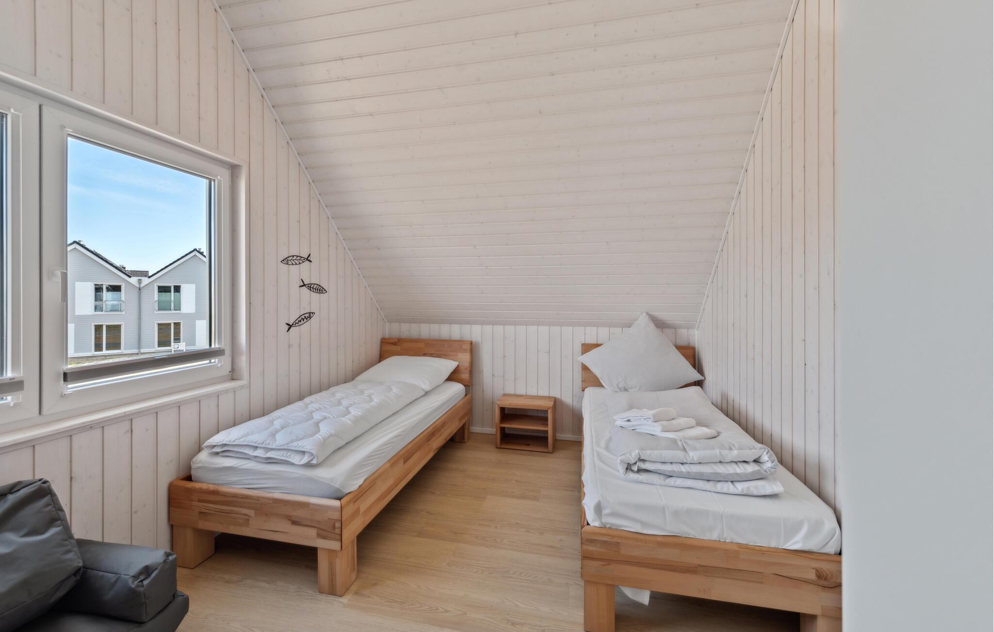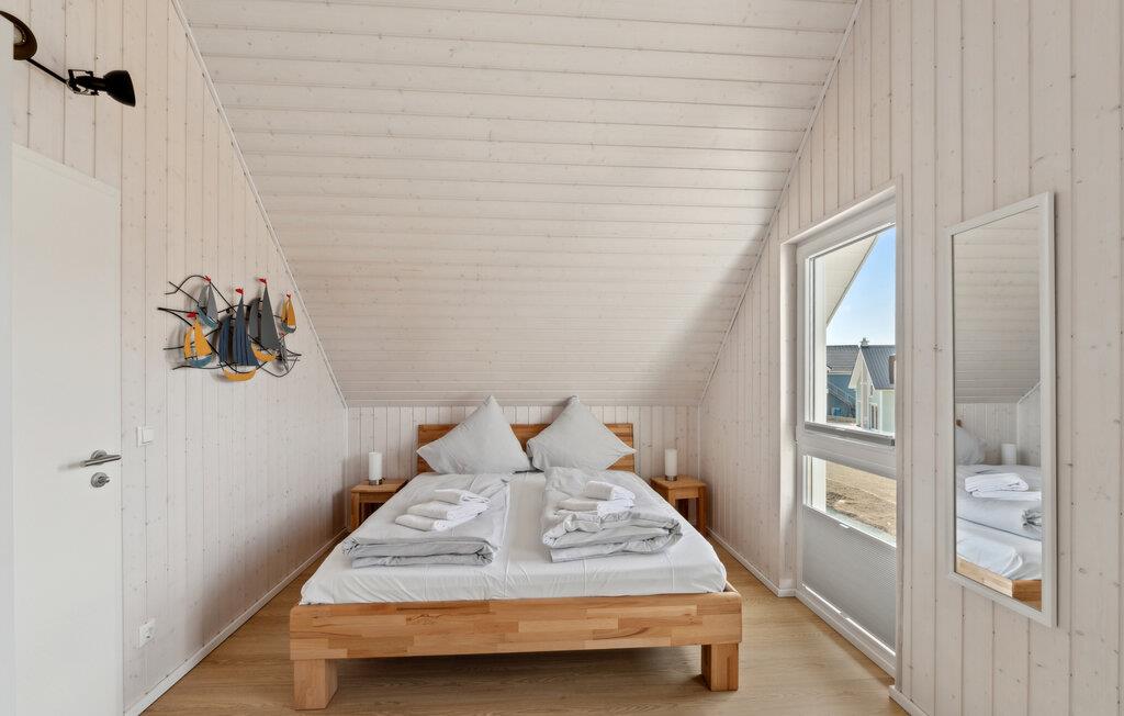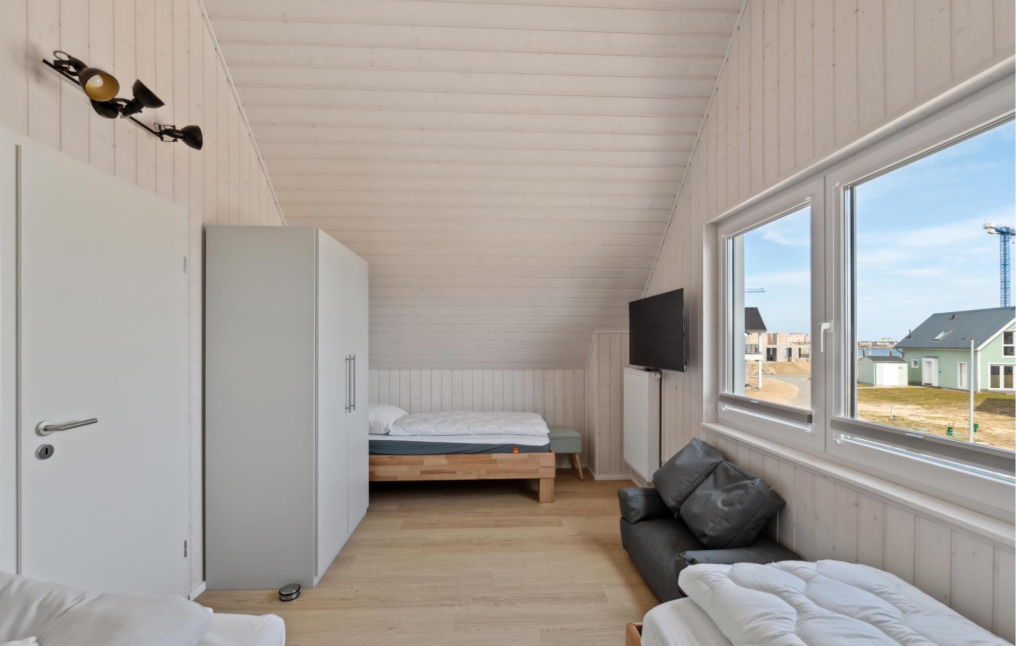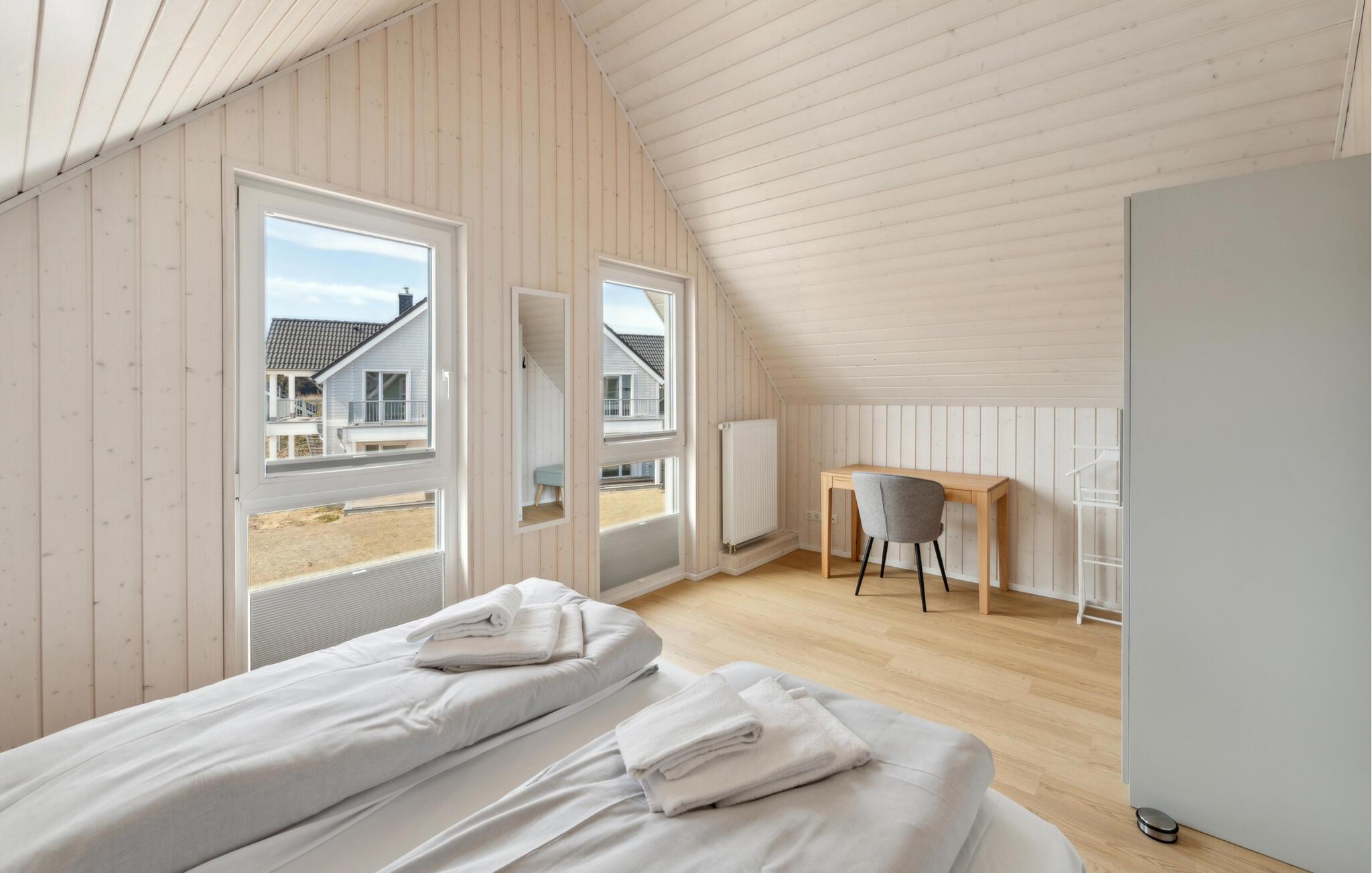 Über die Treppe im Flur gelangt man ins erste Obergeschoss, dem Ruhebereich des Hauses. Das Hauptschlafzimmer ist mit einem Doppelbett und einem TV ausgestattet, das zweite Schlafzimmer verfügt über drei bequeme Einzelbetten.