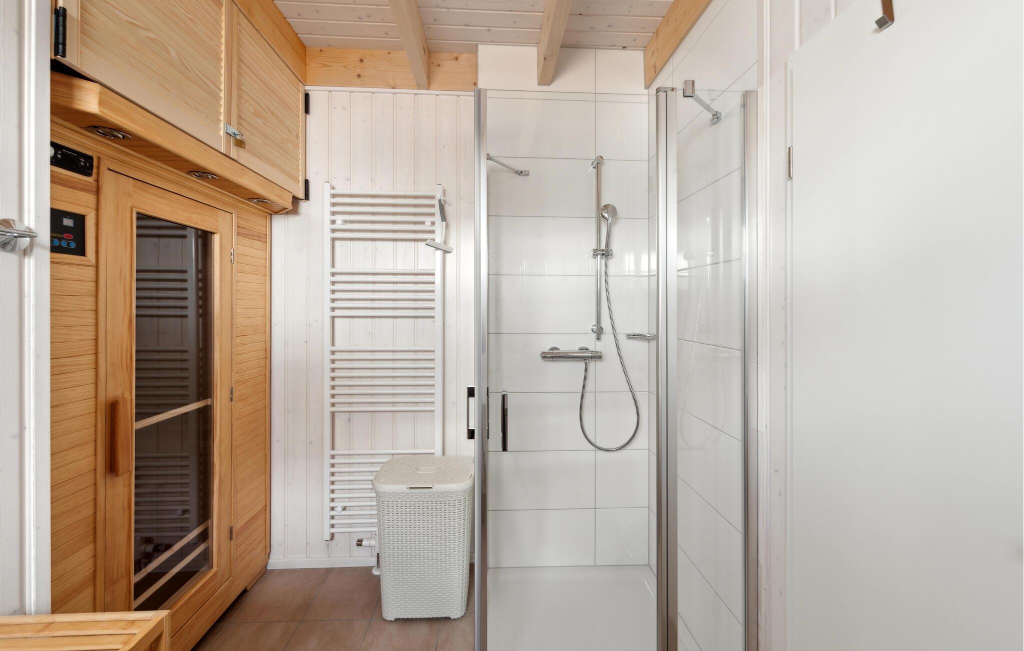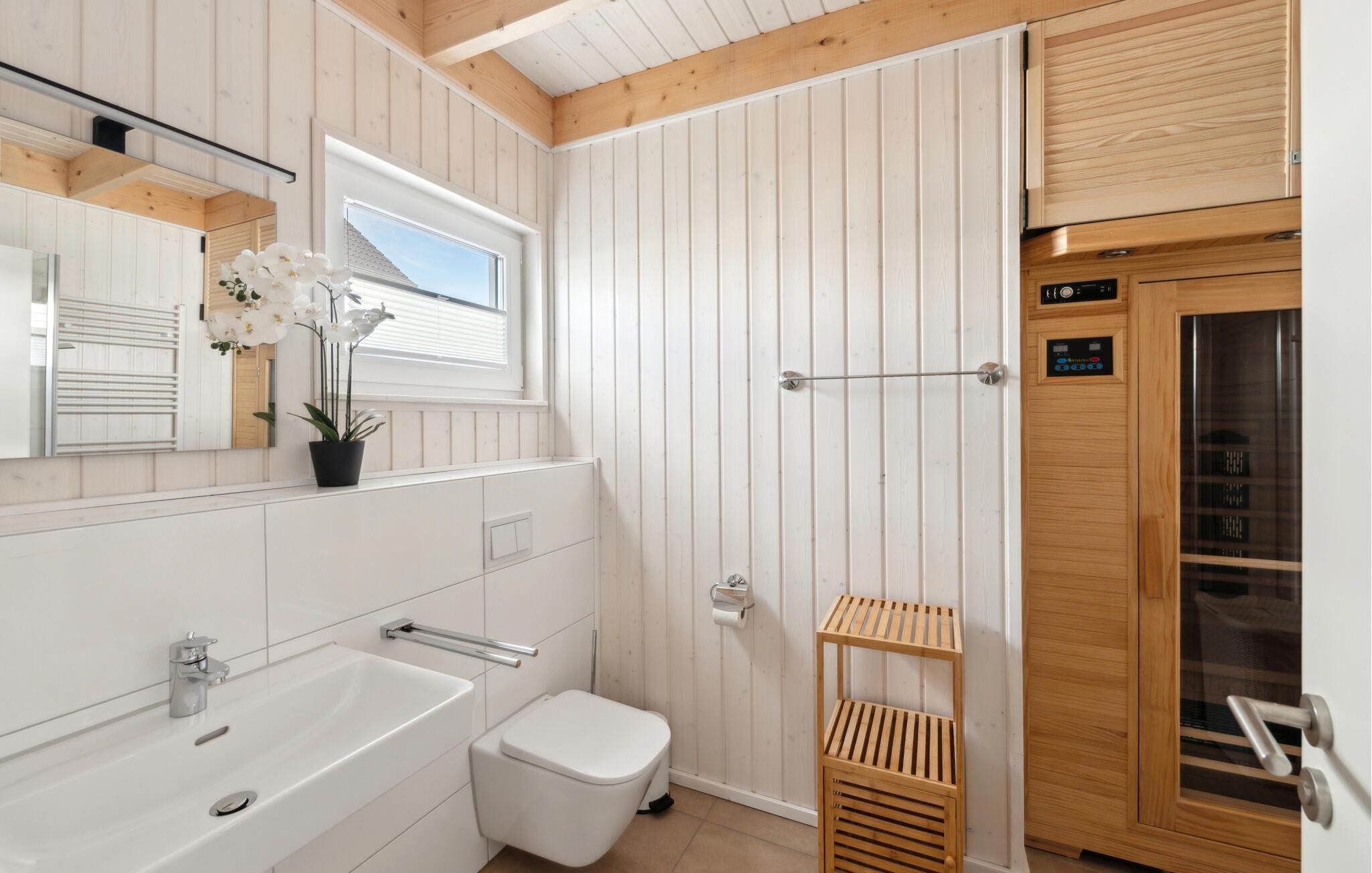 Wellnessliebhaber aufgepasst: Ebenfalls auf dieser Etage sorgt das großzügige Gästebad mit bodengleicher Dusche und einer Infrarot-Sauna für maximale Entspannung.