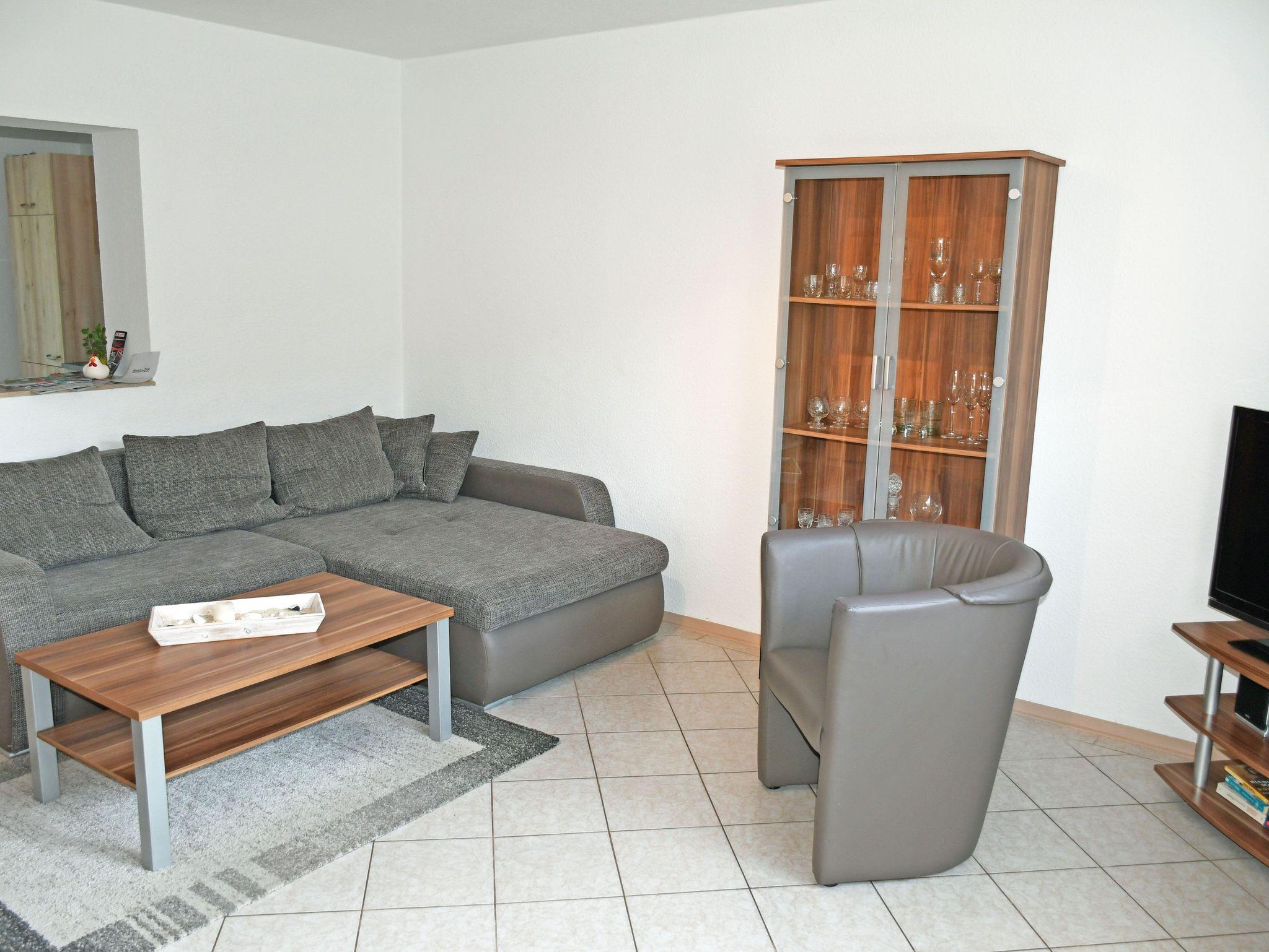Im Erdgeschoss betritt man die Appartements über einen Flur mit Garderobe. Im großen Wohnraum befinden sich eine Couch mit Sessel und Tisch, Schrank, Flachbild-TV und eine Musikanlage.