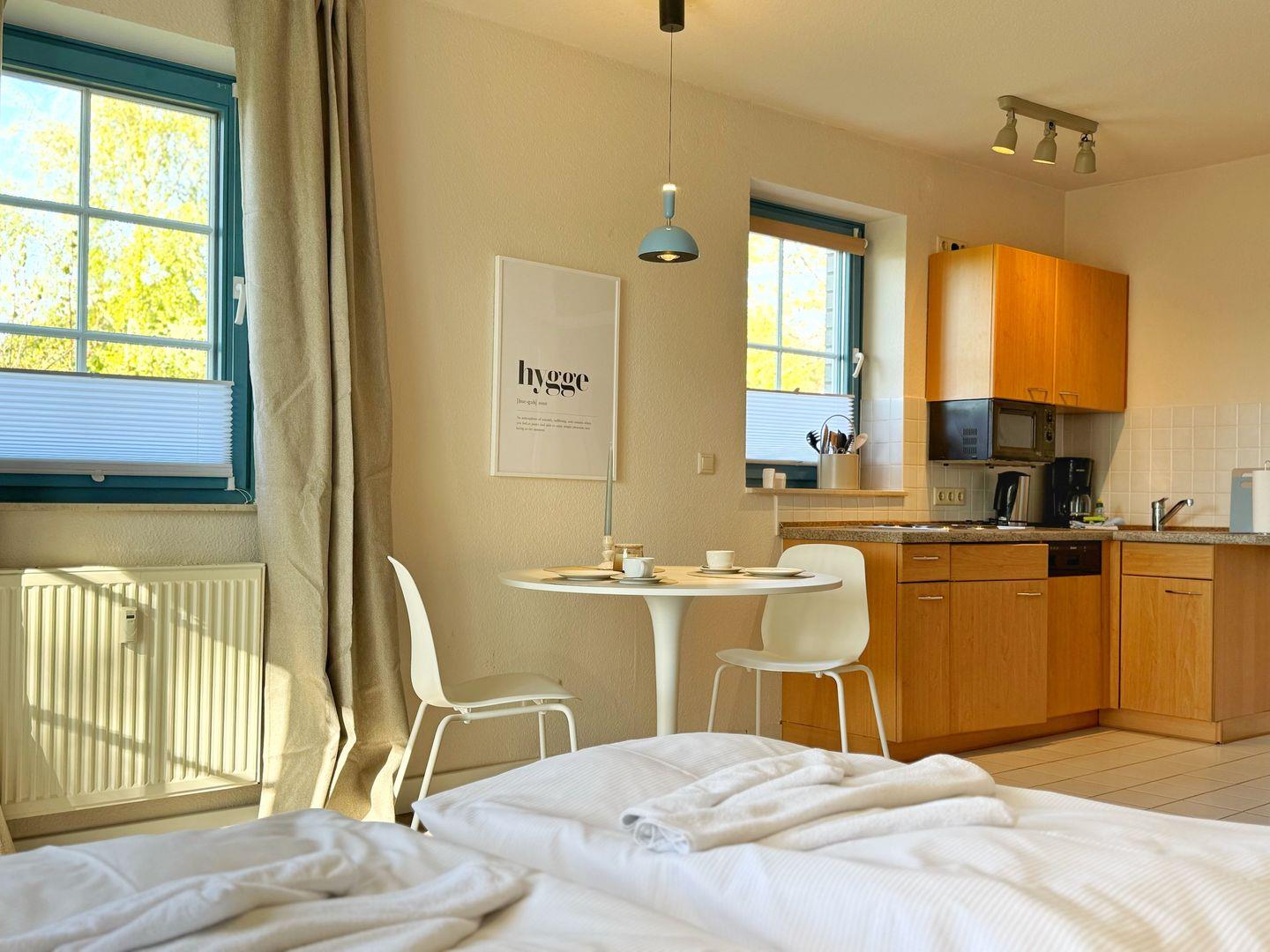 Das Ferienappartement 3 "Hygge" befindet sich in einem der aus 4 Häusern bestehenden Anlage "Am Neuensiener See" im Erdgeschoss und hat eine Terrasse mit Aussicht auf das Wasser. Es handelt sich hierbei um eine 1-Raum-Appartement für 2 Personen mit Bad. Der kombinierte Wohn-Schlafraum mit integrierter Küche bietet ein bequemes Doppelbett neben einem kleinen Sofa-Ecke und einen Essplatz. Die offene Küche ist ausgestattet mit einem Geschirrspüler, Kühlschrank, 4-Platten-Herd, Mikrowelle, Kaffeemaschine und Wasserkocher. Das helle Dusch-Bad hat ein Fenster.