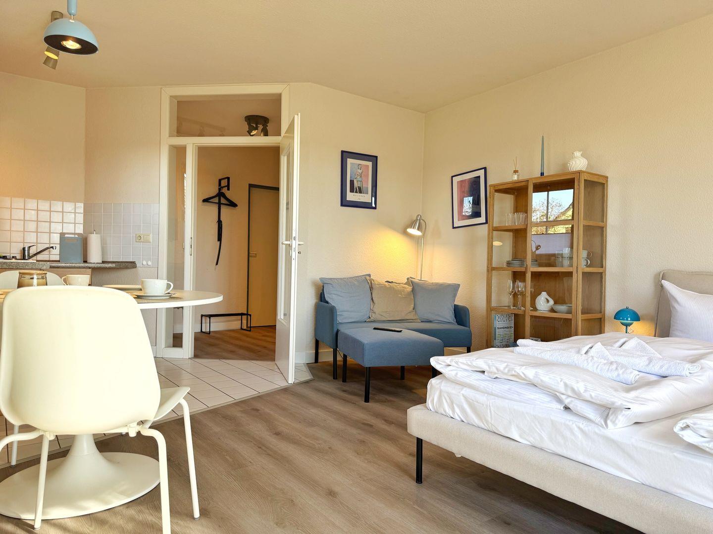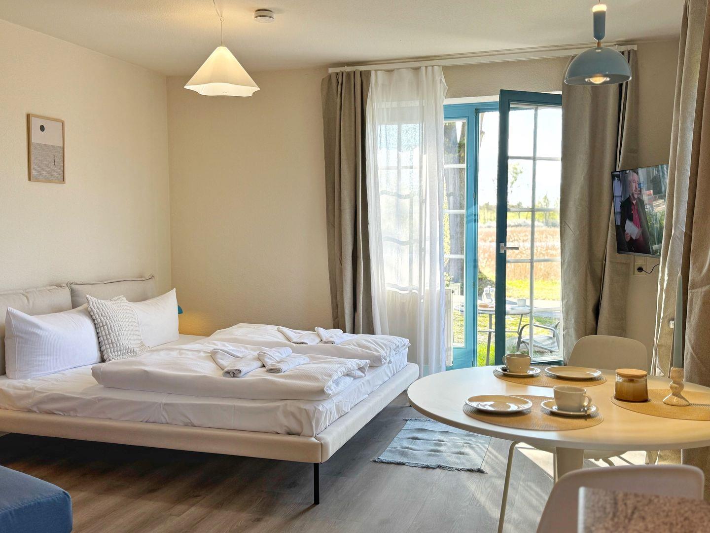 Unser gemütliches Apartment bietet alles, was Sie für einen erholsamen Aufenthalt an der Ostsee brauchen. Die stilvolle Einrichtung sorgt für eine entspannte Atmosphäre, die Sie direkt beim Betreten spüren werden. Das komfortable Bett lädt zu erholsamen Nächten ein, und die Nähe zum See bietet Ihnen jeden Morgen eine traumhafte Aussicht.