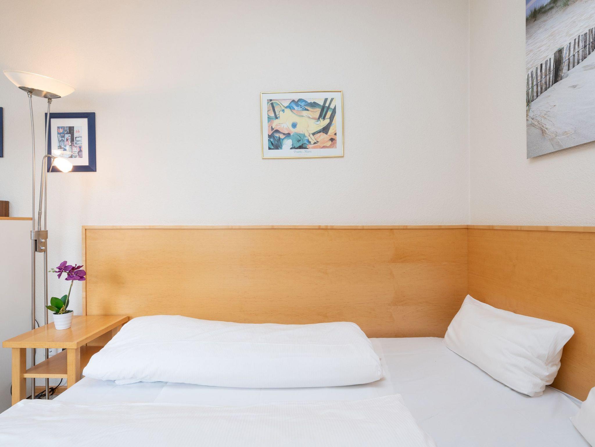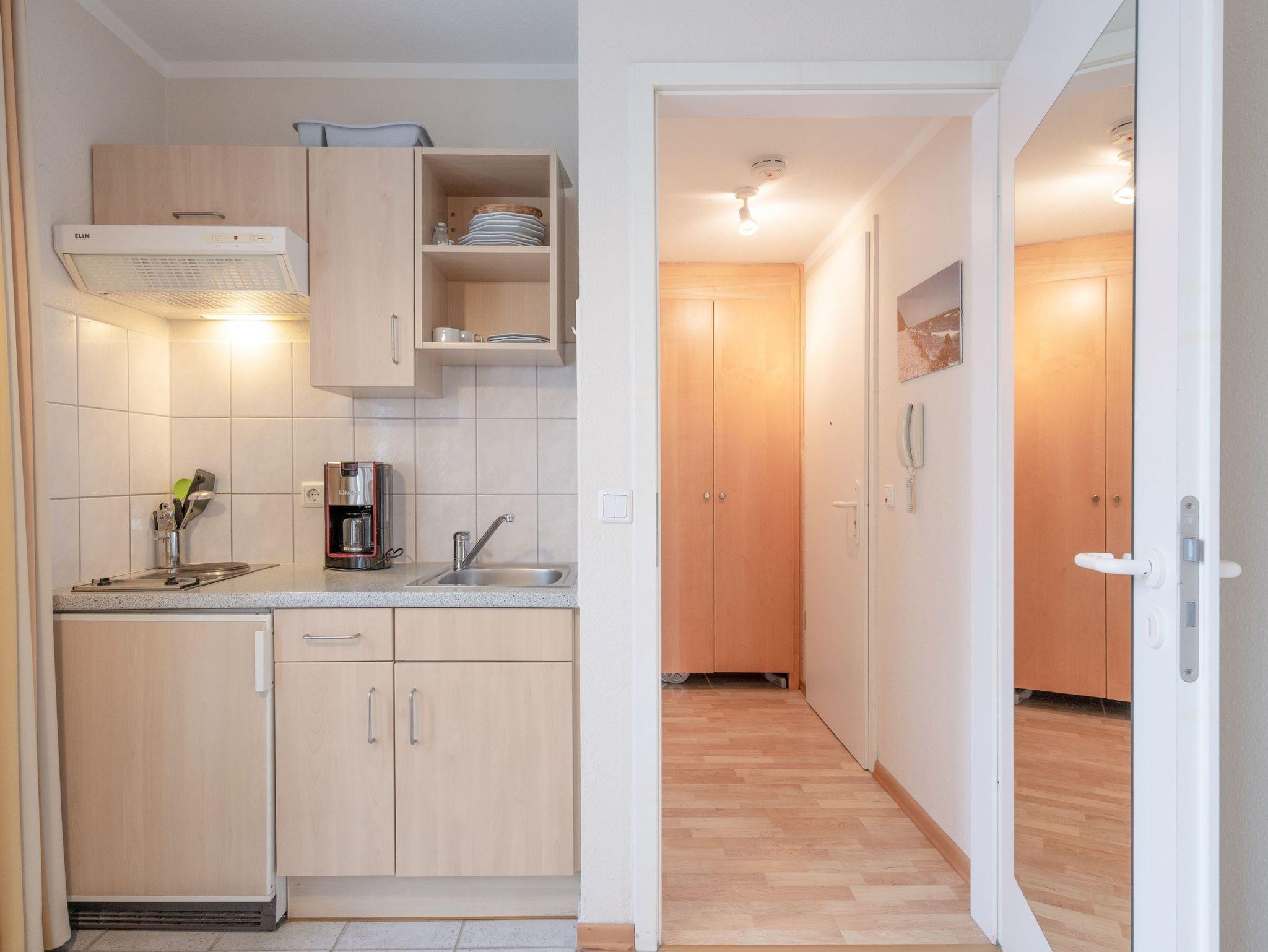 Die Ferienwohnung verfügt über kostenfreies WLAN und die Erstausstattung an Bettwäsche ist inklusive. Der kombinierte Wohn-/Schlafbereich mit Verdunklung verfügt über ein Schlafsofa. Darüber hinaus verfügt die Ferienwohnung über ein Bad mit Dusche/WC und Föhn. Die voll ausgestattete Pantry mit Kaffeemaschine und Toaster lässt keine Wünsche offen. Ein Fernseher inkl. 3 Sky-Sender rundet die gute Einrichtung ab.