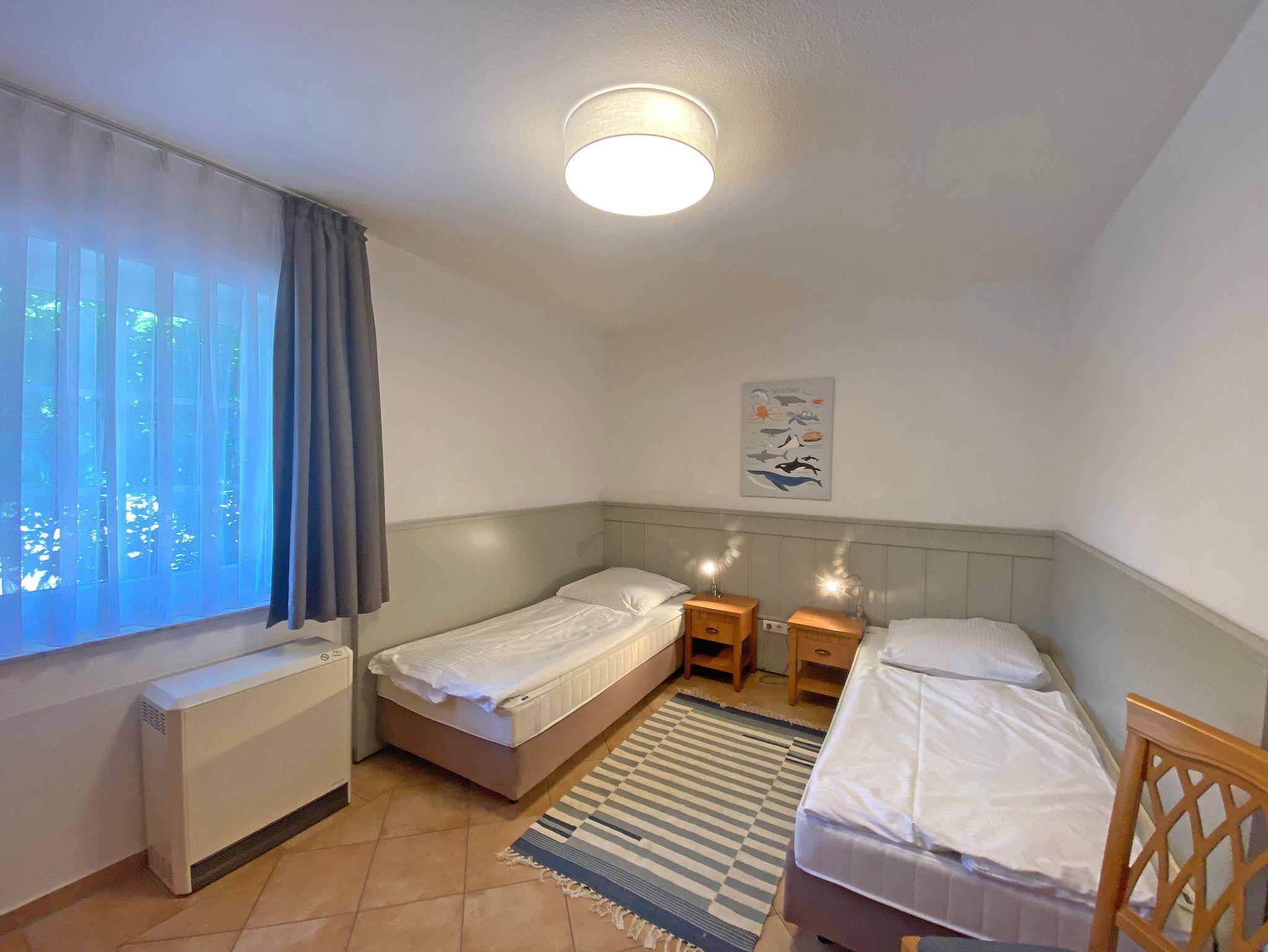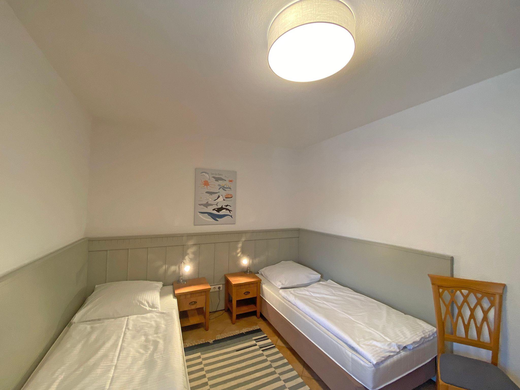 Die Nichtraucherwohnung mit ca. 77 qm besticht durch ihre komfortable Raumaufteilung. Die im Parterre liegende Ferienwohnung Nr. 1 bietet ausreichend Platz für max. 4 Erwachsene und 2 Kinder bis 17 Jahre. Im Wohnbereich wird die Unterhaltungstechnik durch Gesellschaftsspiele, einen modernen 42 Zoll LCD-TV und einen CD- bzw. DVD-Player abgerundet. Auch im Urlaub müssen Sie nicht auf einen Internetanschluss (W-LAN) verzichten. Dieser ist für Sie inklusive. Für die Gemütlichkeit wurde der Wohnbereich mit Massivmöbeln, einer Stehlampe, zwei Sesseln und zwei Schlafcouchen (Aufbettungsmöglichkeit, 1,90 m x 2,00 m) ausgestattet. Die bestuhlte und große Terrasse (Westen) mit Sonnenschirm können Sie vom Wohnbereich erreichen. Sie lädt bei einem Glas Wein zum Entspannen ein. Die angrenzende Küchenzeile verfügt über eine Spülmaschine, Mikrowelle, Ceranfeld mit Backofen, Kühlschrank mit Eisfach, Wasserkocher, Toaster, Kaffeemaschine und diverse Küchenutensilien. Bei Ihren Mahlzeiten können Sie vom Esstisch aus den Blick auf den Selliner See genießen. Das 1. Schlafzimmer wurde mit einem Doppelbett (1,80 m x 2,00 m), Nachtischablagen sowie einen Kleiderschrank ausgestattet. Das 2. Schlafzimmer verfügt über 2 Einzelbetten (0,90 m x 2,00 m) auch als Doppelbett stellbar, Nachttischablagen und einen Kleiderschrank. Im Tageslichtbad können Sie in einer Badewanne relaxen. Durch eine separate Dusche, einen großen Waschtisch, einen Fön und ein WC wird der Sanitärbereich abgerundet. Fensterläden und Vorhänge dienen zum Verdunkeln der Räumlichkeiten. In allen Räumlichkeiten finden Sie Nachtspeicheröfen. Im Abstellraum finden Sie unter anderem Strandutensilien, einen Wäscheständer, zwei Sonnenliegen sowie Reinigungsutensilien. Für unsere kleinen Gäste stehen 1x Kinderreisebett (ohne Matratze, ohne Bettinlett) sowie 1x Hochstuhl inklusive zur Verfügung. Haustiere sind in dieser Wohnung nicht erlaubt. Ein PKW-Stellplatz Nr. 01 befindet sich direkt auf dem Grundstück. Ihre mitgebrachten oder geliehenen Fahrräder können Sie nach Verfügbarkeit im abschließbaren Fahrradraum unterstellen. Die Erstausstattung eines Wäschepaketes (komplette Bettwäsche, 1 Duschhandtuch, 1 kleines Handtuch) können Sie bis 14 Tage vor Anreise gegen einen Aufpreis dazu buchen oder durch eigene ergänzen. Ab 2 gebuchten Paketen erhalten Sie einmalig 1 Geschirrhandtuch und 1 Duschvorleger hinzu.