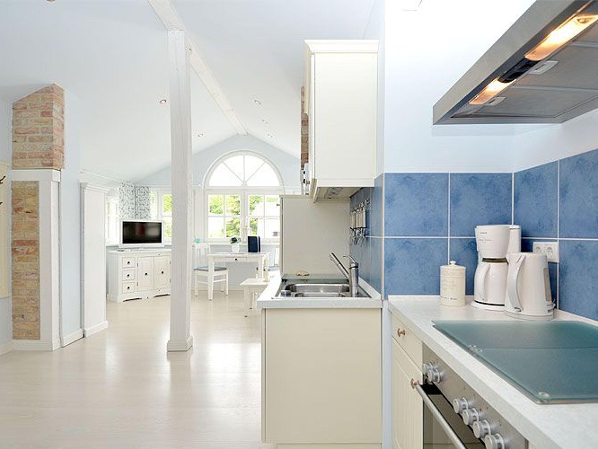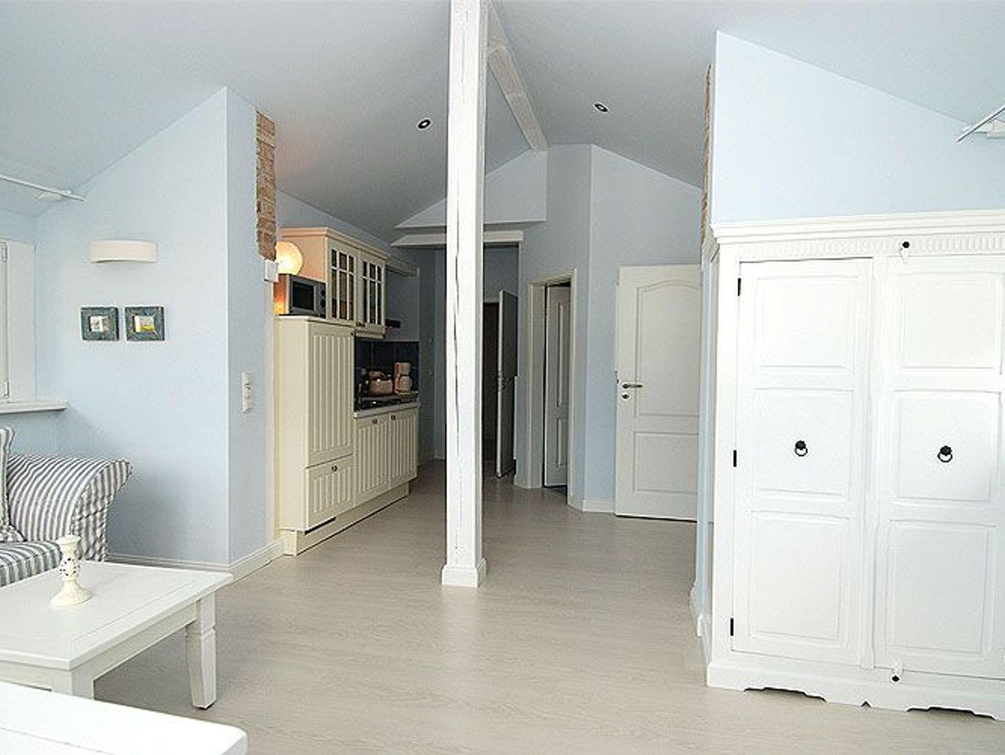 Wohnung 6: Dieses sehr schöne 2-Raum-Appartement im Dachgeschoss ist im weißen Landhausstil eingerichtet und hat eine Wohnfläche von ca. 48 m² sowie einen möblierten Balkon (ca. 5 m²) zur Abendsonne.