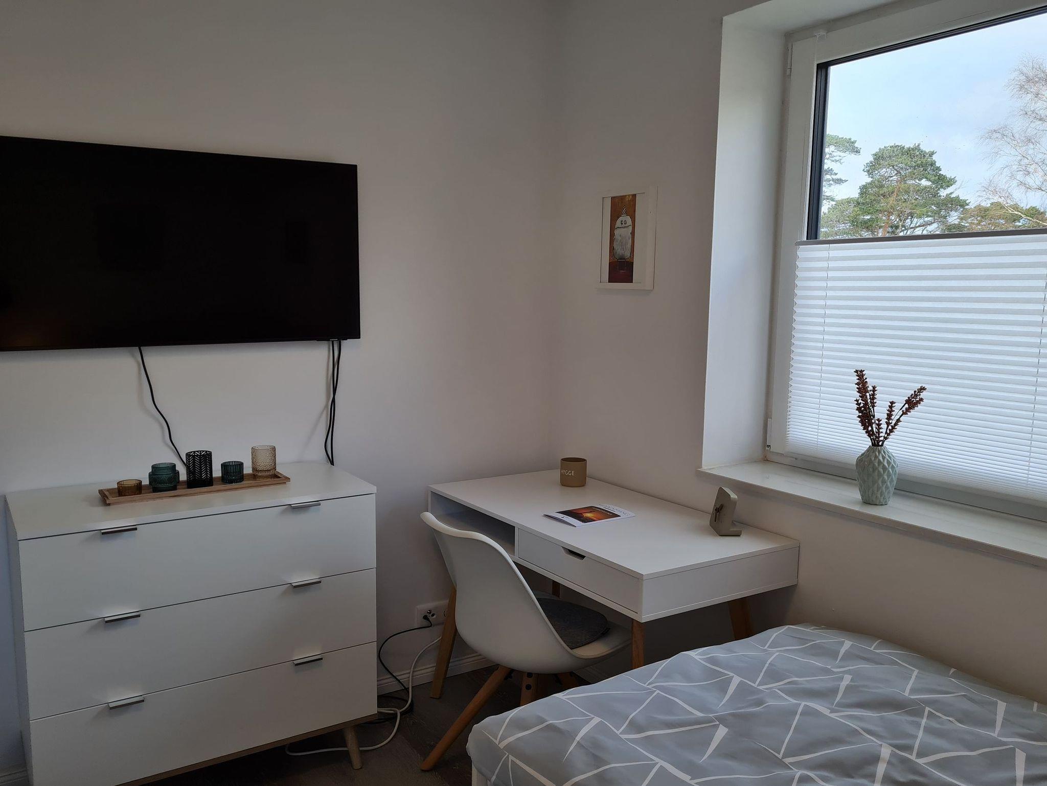 Ein Schlafzimmer mit Zugang zu einem kleinen Balkon ist mit einem gemütlichem Doppelbett(180x200m) und genügend Stauram eingerichtet . Im anderesn Schlafzimmer finden Sie zwei Einzelbetten und einen Flachbild TV.