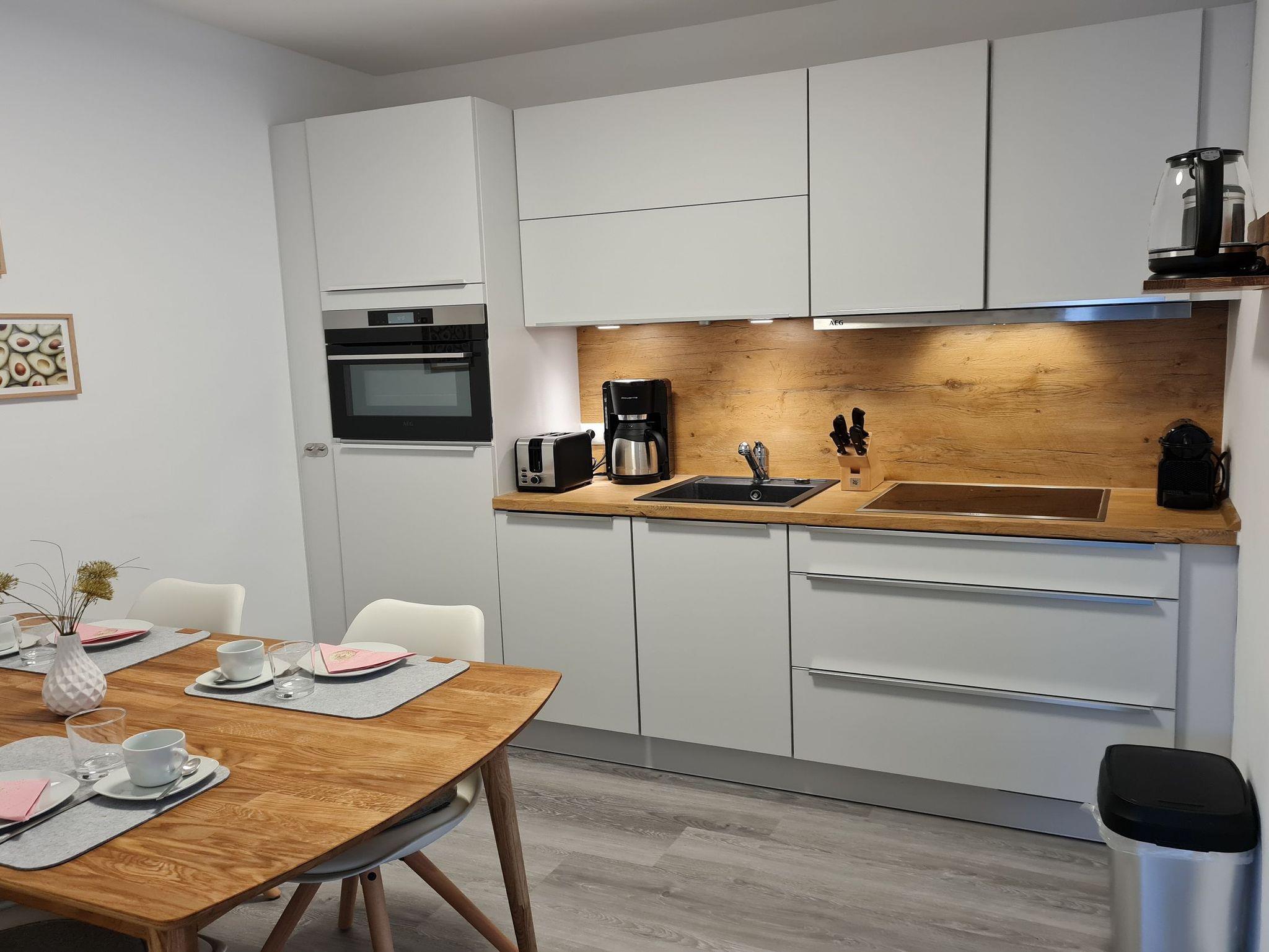 • KÜCHE: offene Küche, 4-FelderInduktionsherd mit Backofen, Kühlschrank mit Gefrierfach, Toaster, Wasserkocher, Kaffeemaschine, reichlich Besteck, Geschirr und Küchenutensilien