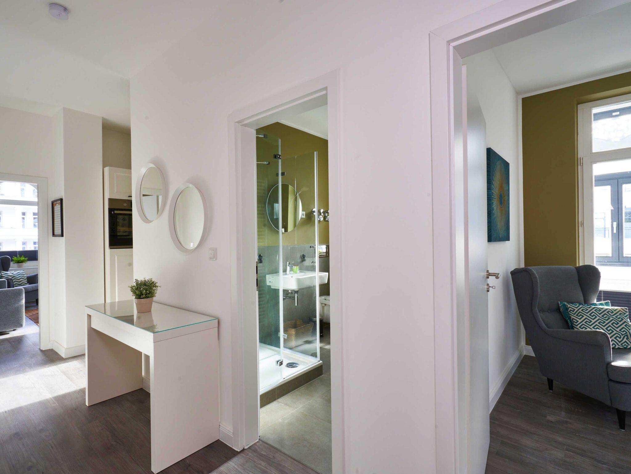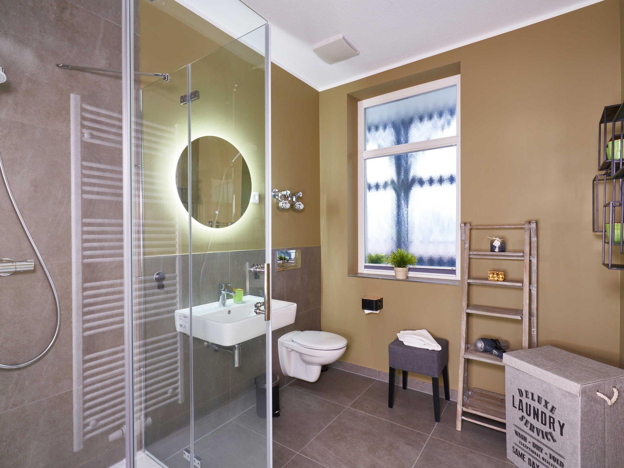 Weiterhin gibt es im Appartement ein geräumiges Badezimmer mit Dusche (Regendusche) und WC sowie ein weiteres separates Gäste-WC mit Handwaschbecken.