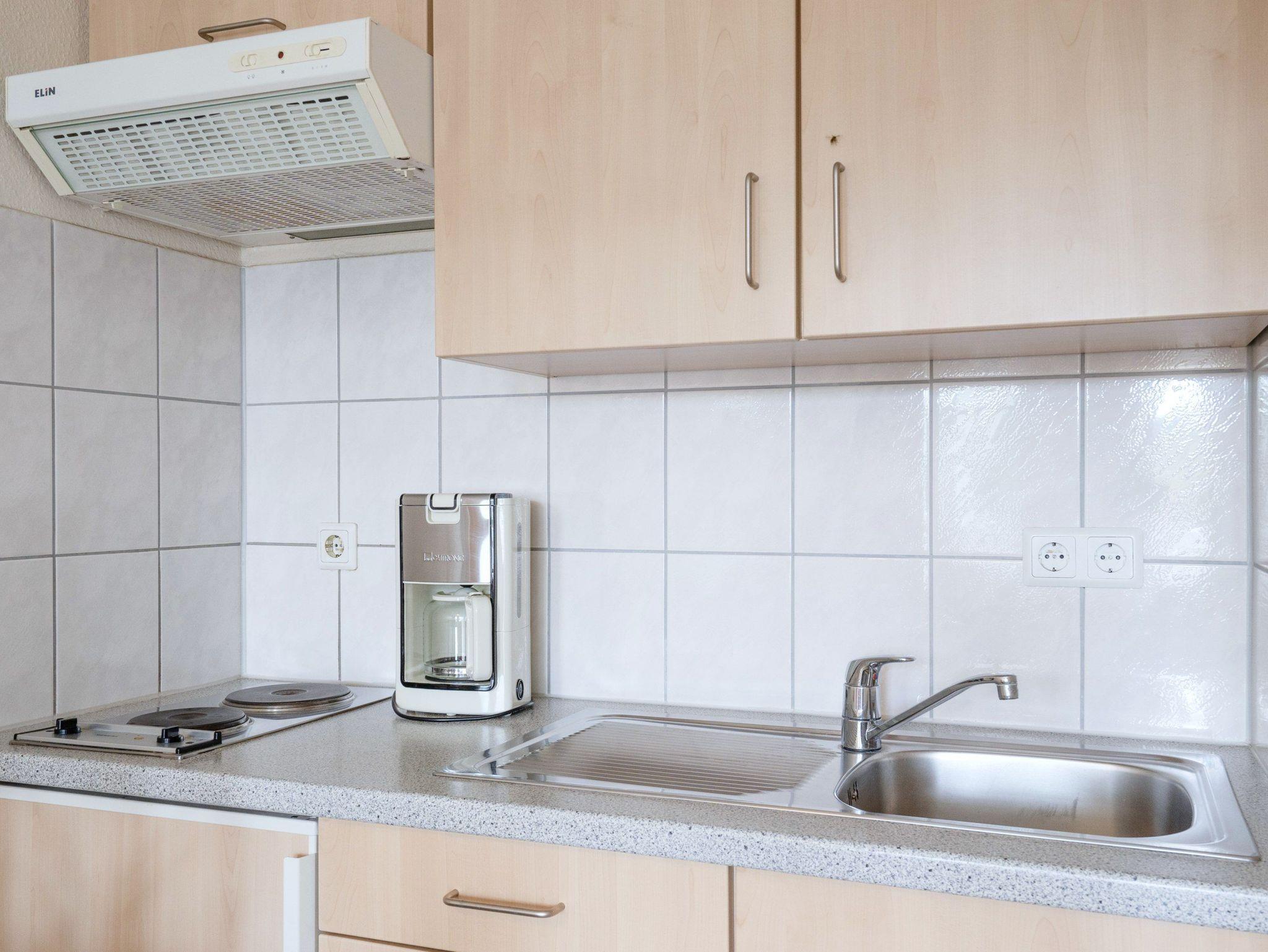 Zur Ausstattung der Ferienwohnung gehören kostenfreies WLAN und eine Erstausstattung an Bettwäsche. Das Schlafzimmer verfügt über ein Doppelbett und Verdunklungsmöglichkeiten. Im Wohnzimmer gibt es zusätzlich eine Doppelschlafcouch. Das Badezimmer ist mit einer Dusche, einem WC, einem Föhn und einem Kosmetikspiegel ausgestattet. Die offene Küche bietet alles, was man für die Zubereitung von Mahlzeiten benötigt, einschließlich einer Mikrowelle, einer Kaffeemaschine und einem Toaster. Ein Fernseher mit 3 Sky-Sendern rundet die Einrichtung ab. Auf dem Balkon in Südostlage können die Gäste den Ausblick und die Sitzmöglichkeiten genießen. Die Wohnung ist ein Nichtraucher-Apartment, in dem ein Haustier mitreisen darf.