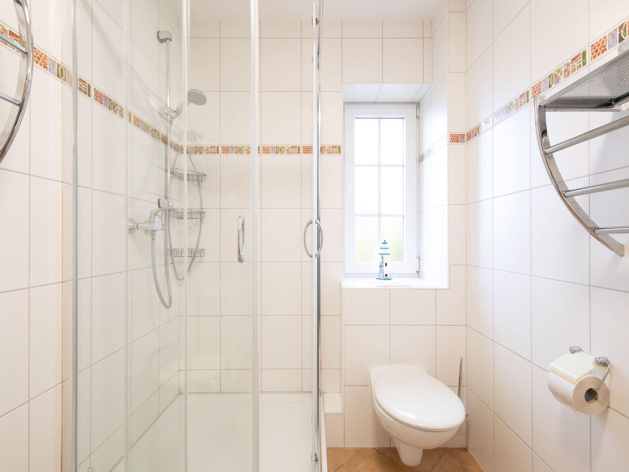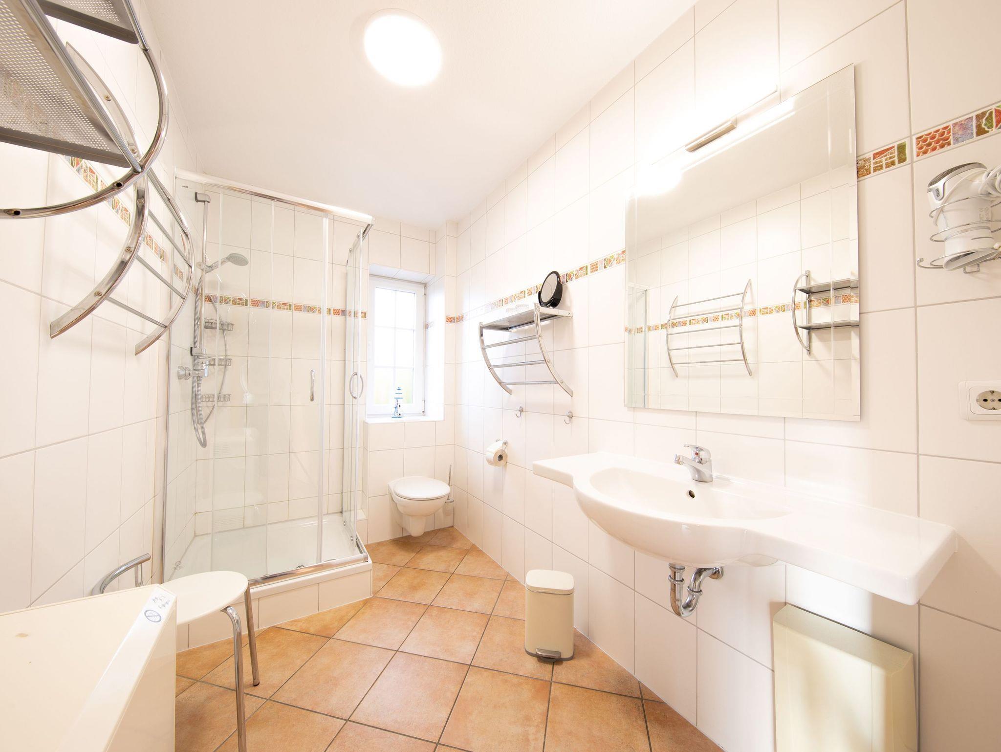 Im modernen Tageslichtbad befindet sich eine Dusche sowie [nbsp]ein Spiegel. Fön, WC und ein Waschtisch runden den Sanitärbereich ab.