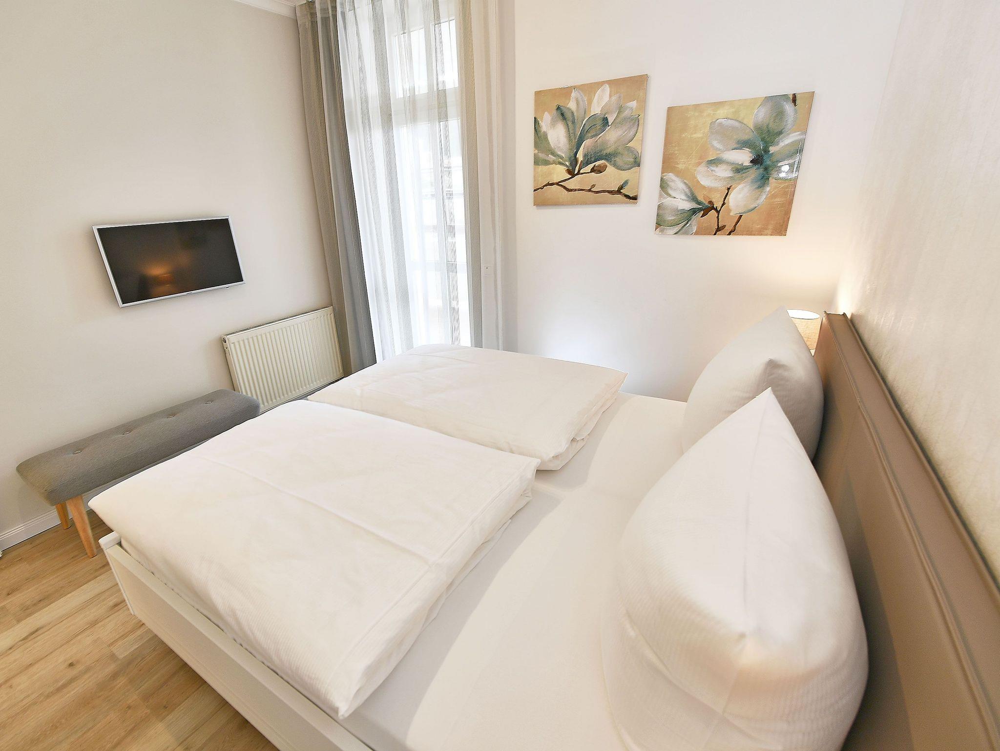 Im ersten Schlafzimmer finden Sie ein komfortables Doppelbett (1,80 x 2,00 m) für einen erholsamen Schlaf, einen Kleiderschrank für Ihre Urlaubsgarderobe sowie einen 32” Flachbild-Fernseher. Das zweite Schlafzimmer ist mit einem Bett, welches noch über ein Ausziehunterbett (0,90 x 2,00 m) verfügt, sowie einem Kleiderschrank eingerichtet. Ein Kinderreisebett erhalten Sie auf Anfrage und gegen Gebühr.