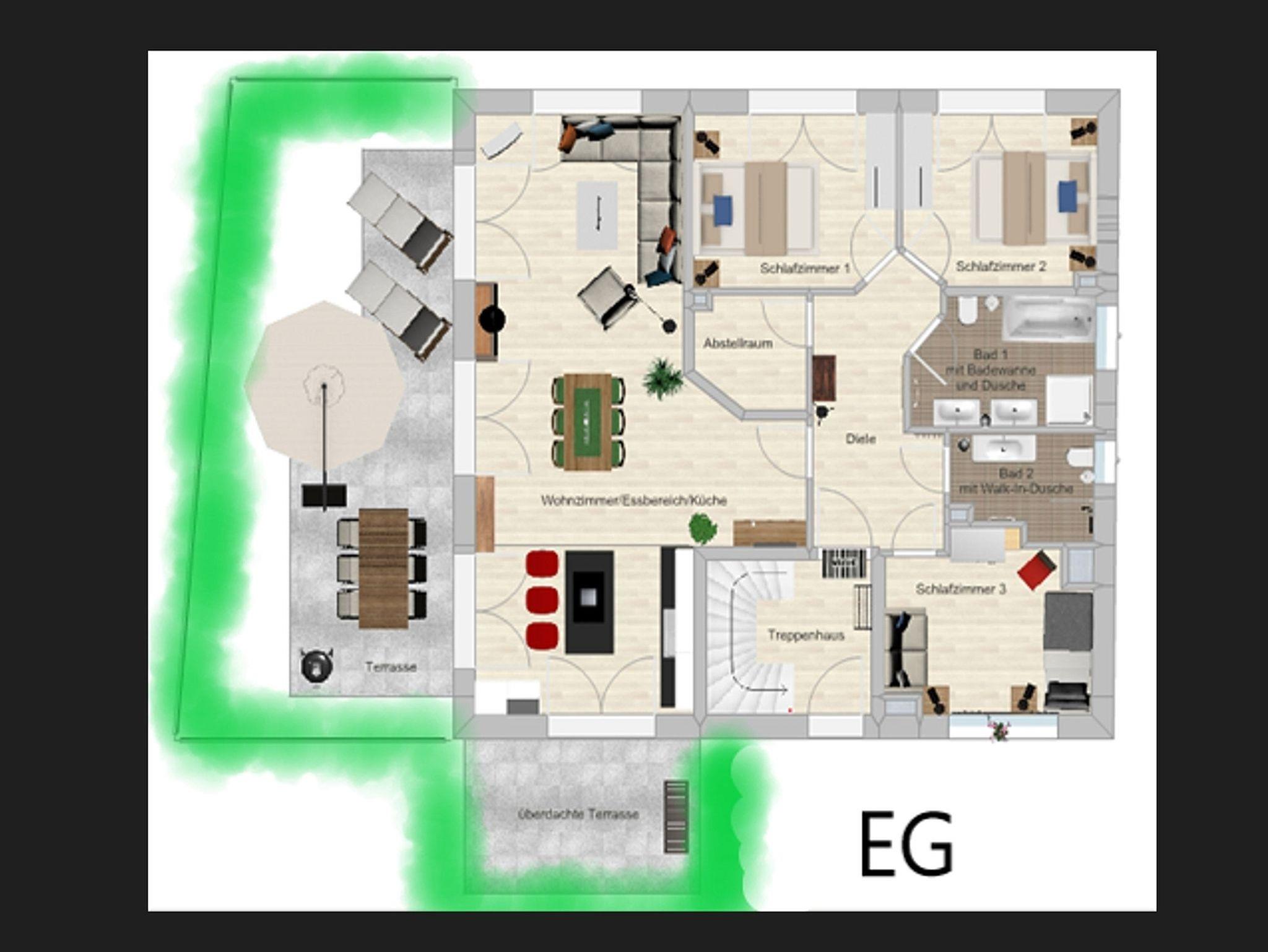 Die komfortabel eingerichtete Ferienwohnung 1 in der Villa Gina mit ca. 108 m² bietet Ihnen ausreichend Platz für 2 bis 6 Erwachsene + 1 Kleinkind bis 3 Jahre im Kinderreisebett. Bereits in der großzügigen Diele erwarten Sie 2 Garderoben. Anschließend kommen Sie in den lichtdurchfluteten Wohn-/Essbereich mit großen bodentiefen Fensterelementen mit einer perfekt geplanten Markenküche. Mit der Kücheninsel mit angrenzendem Tresen und Barhockern werden Sie Freude am gemeinsamen Kochen mit Familie und Freunden haben. Zur Ausstattung gehören ein großer Kühlschrank, Gefrierschrank, Geschirrspüler, Backofen, Ceranfeld sowie eine Mikrowelle. Zu den weiteren kleinen und großen Küchenhelfern gehören Kaffeemaschine, Senseo-Kaffeeautomat, Wasserkocher, Eierkocher, Toaster, elektrische Zitruspresse, Standmixer, Hand- und Stabmixer. Die LED-Beleuchtung an Sockeln und Tresen machen die Küche zu einem gemütlichen Aufenthaltsort. Im angrenzenden Essbereich haben 6 Personen auf bequemen Schwingstühlen ausreichend Platz, ihre Mahlzeiten zu genießen. Im Wohnbereich können Sie es sich auf der großen Ledercouch oder dem Ledersessel bequem machen. Mit einem guten Buch können Sie sich hier entspannen oder auf dem 55 Zoll Smart-TV in Full-HD-Qualität mit Sky (Auswahl von Sport, Film, Dokumentation), LED-Hintergrundbeleuchtung und Netflix Ihre Lieblingssendung anschauen. Auf dem Blu-Ray Player mit USB können Sie Ihre mitgebrachten Filme abspielen. Eine Stereoanlage mit CD, USB und Bluetooth, die auf einem großen Sideboard steht sowie WLAN runden das Entertainmentequipment ab. Die Fußbodenheizung sorgt in Kombination mit den exklusiven Designböden für ein sehr angenehmes Raumklima. Eine automatische Be- und Entlüftungsanlage sorgt zudem für einen hohen Wohnkomfort. Der elektrische Kaminofen bringt Behaglichkeit an kühleren Tagen. Die Terrasse in Südausrichtung mit Ampelschirm sowie eine überdachte Ost-Terrasse sind vom Wohnbereich zu erreichen und bieten zudem einen Kugelgrill. Falls Sie mit Ihrem vierbeinigen Freund gegen eine Gebühr anreisen, ist selbstverständlich in dem rund 47 m² großen Wohn-/Essbereich ausreichend Platz vorhanden für den mitgebrachten Schlafplatz. Elektrische Rollläden befinden sich an der Süd- und Westseite des Raumes. Ein paar Gesellschaftsspiele, Holzspielzeug für die kleinen Gäste sowie einige Bücher finden Sie ebenfalls vor. Kindersicherungen an den zugänglichen Steckdosen sind vorhanden. Für Ihren erholsamen Schlaf stehen Ihnen insgesamt 3 komfortable Schlafzimmer zur Verfügung. In 2 Schlafzimmern finden Sie jeweils ein Boxspringbett mit Taschenfederkernmatratzen und Komfort-Topper in der Größe 1,60m x 2,00m, Nachttischablagen mit dimmbarer Beleuchtung und USB zum Aufladen von Handys oder E-Books, Radiowecker, einen Kleiderschrank sowie einen 32 Zoll-Flachbild-TV mit Smart-TV. Beide Schlafzimmer haben elektrische Rollläden. Im 3. Schlafzimmer befindet sich ein Boxspring-Einzelbett (1,00m x 2,00m) sowie eine bequeme Schlafcouch (1,50m x 2,00m), die tagsüber als Sofa dient. Abgerundet wird das Schlafzimmer mit einem 32 Zoll-Flachbild-TV mit Smart-TV sowie einem Kleiderschrank und 2 Nachttischablagen mit dimmbarer Beleuchtung sowie Radiowecker. Verdunklungsvorhänge sorgen für einen ungestörten Schlaf. Die beiden hochwertigen Tageslicht-Bäder mit Fußbodenheizung sorgen dafür, dass es zu keinem morgendlichen Stau kommt. Das eine Badezimmer ist ausgestattet mit einer bodentiefen Echtglasdusche, Badewanne, 2 Waschplätzen und Spiegelschrank, WC, Kosmetikspiegel, Handtuchtrockner und Fön. Das zweite Bad hat eine Walk-In-Dusche, 1 Waschtisch und Spiegelschrank, WC sowie ebenfalls Handtuchtrockner und Fön. Zusätzlich gibt es in der Wohnung noch einen Abstellraum. Hier befinden sich ein Hochstuhl für die kleinen Gäste sowie Staubsauger und Reinigungsutensilien. Im Untergeschoss befindet sich ein Wirtschaftsraum mit Waschmaschine und Trockner, die kostenfrei genutzt werden können. Ein Wäschetrockner, Bügelbrett und ein Bügeleisen stehen Ihnen ebenfalls zur Verfügung. Des Weiteren finden Sie hier die gemeinschaftliche Sauna mit einer separaten Walk-In-Dusche mit Waschbecken und WC sowie einen angrenzenden Ruheraum mit Liegen und Relax-Stühlen, außerdem ein elektrischer Wandkamin und eine atemberaubende Fototapete. Lassen Sie sich überraschen. Im Außenbereich finden Sie jeweils einen Parkplatz (Nr.01) sowie einen abschließbaren Fahrradschuppen mit Steckdose zum Aufladen für Ihr E-Bike für jede Wohnung. Darin befinden sich auch die kostenlos zur Verfügung gestellten Bollerwagen für Ihre Strandutensilien. Die Erstausstattung eines Wäschepaketes (komplette Bettwäsche, 1 Duschhandtuch, 1 kleines Handtuch) können Sie bis 14 Tage vor Anreise gegen einen Aufpreis dazu buchen oder durch eigene ergänzen. Ab 2 gebuchten Paketen erhalten Sie einmalig 1 Geschirrhandtuch und 1 Duschvorleger hinzu. Wir wünschen Ihnen einen erholsamen und erlebnisreichen Urlaub!