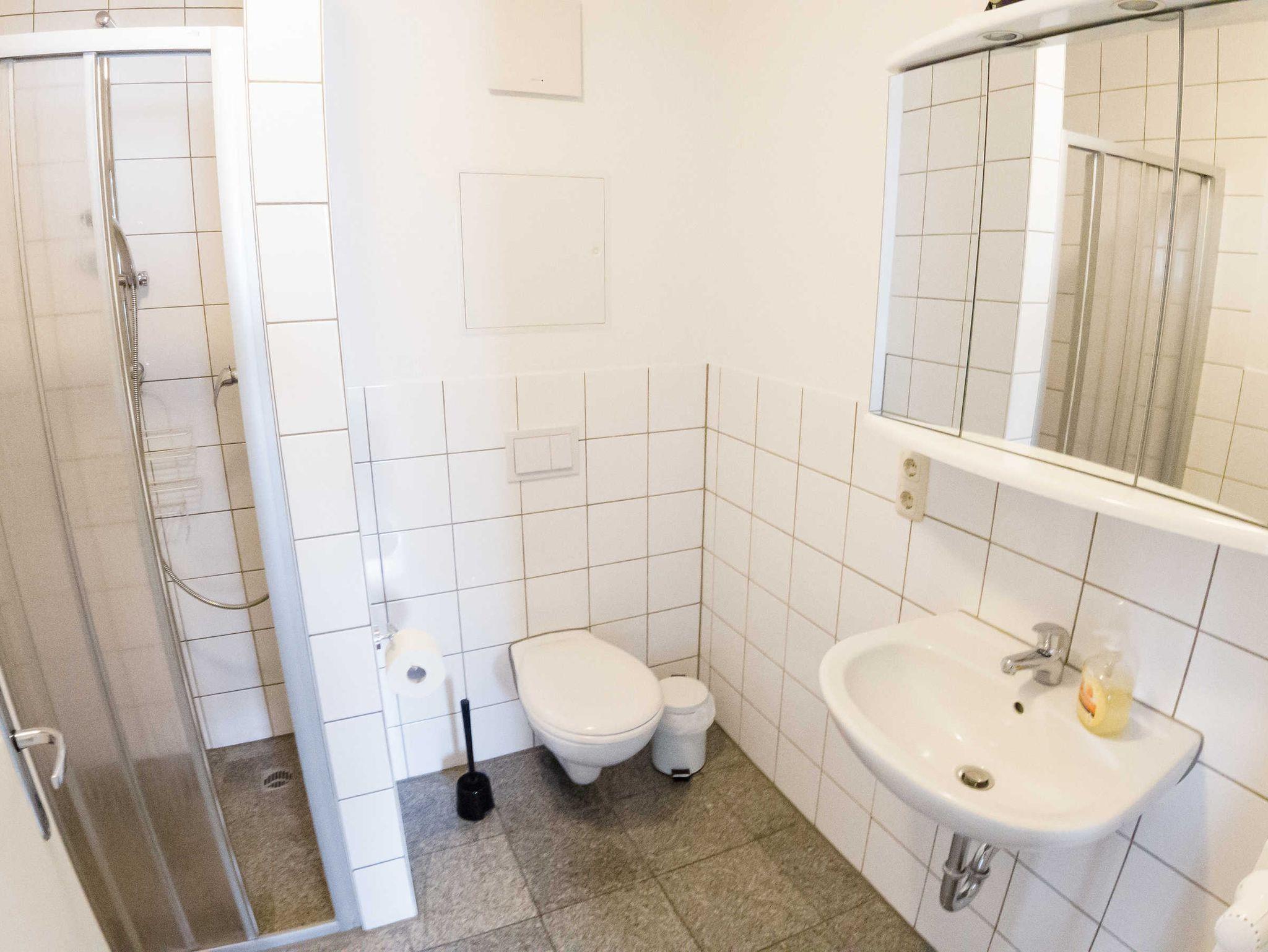 Das moderne Bad ist mit Waschbecken, Spiegel, Föhn, Dusche, WC und Waschmaschine ausgestattet.