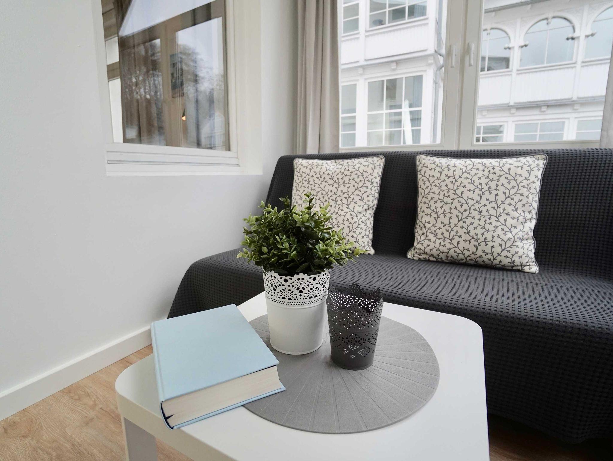 Diese Ferienappartements Vilm für 1 bis 2 Personen, verfügen über einen Wohn-Schlafraum mit Doppelbett, Einbauküche sowie einen separaten hellen Wintergarten mit Schlafsofa. Vom Wintergarten aus haben Sie einen schönan Ausblick zur Hofseite mit Blick zum Laubwald und Abendsonne. Die 49 qm großen Ferienwohnungen liegen im Erdgeschoss (2), im 1. Obergeschoss (5) und im 2. Obergeschoss (8). Ausstattung des Appartements: Küchenzeile, Kühlschrank, Spülmaschine, Heizung, Flachbild-TV, Backofen, Handtücher, Hochstuhl, Schlafsofa, SodaStream