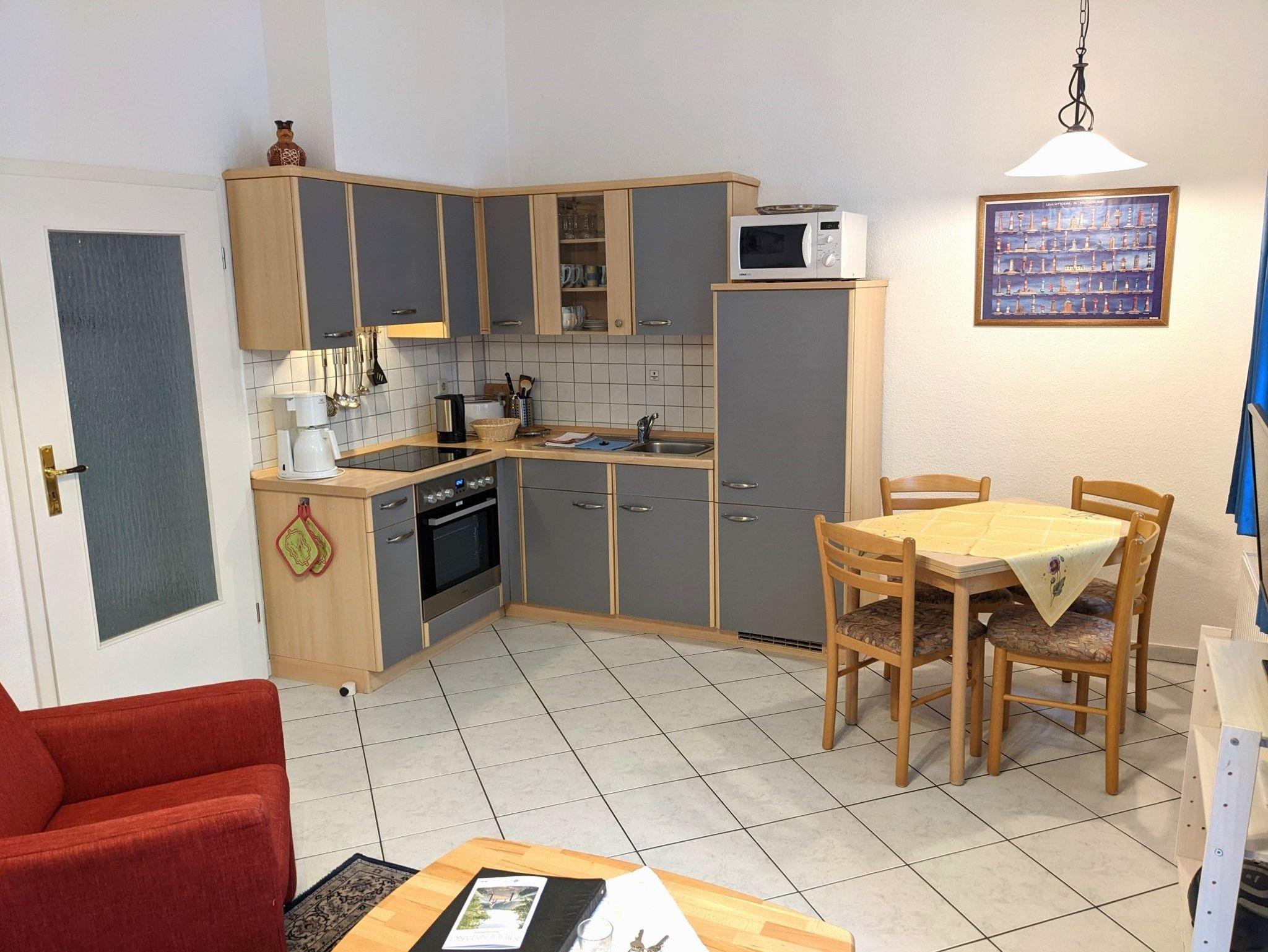 • offene Küche mit E-Herd, Backofen, Kühlschrank, Mikrowelle uvm.