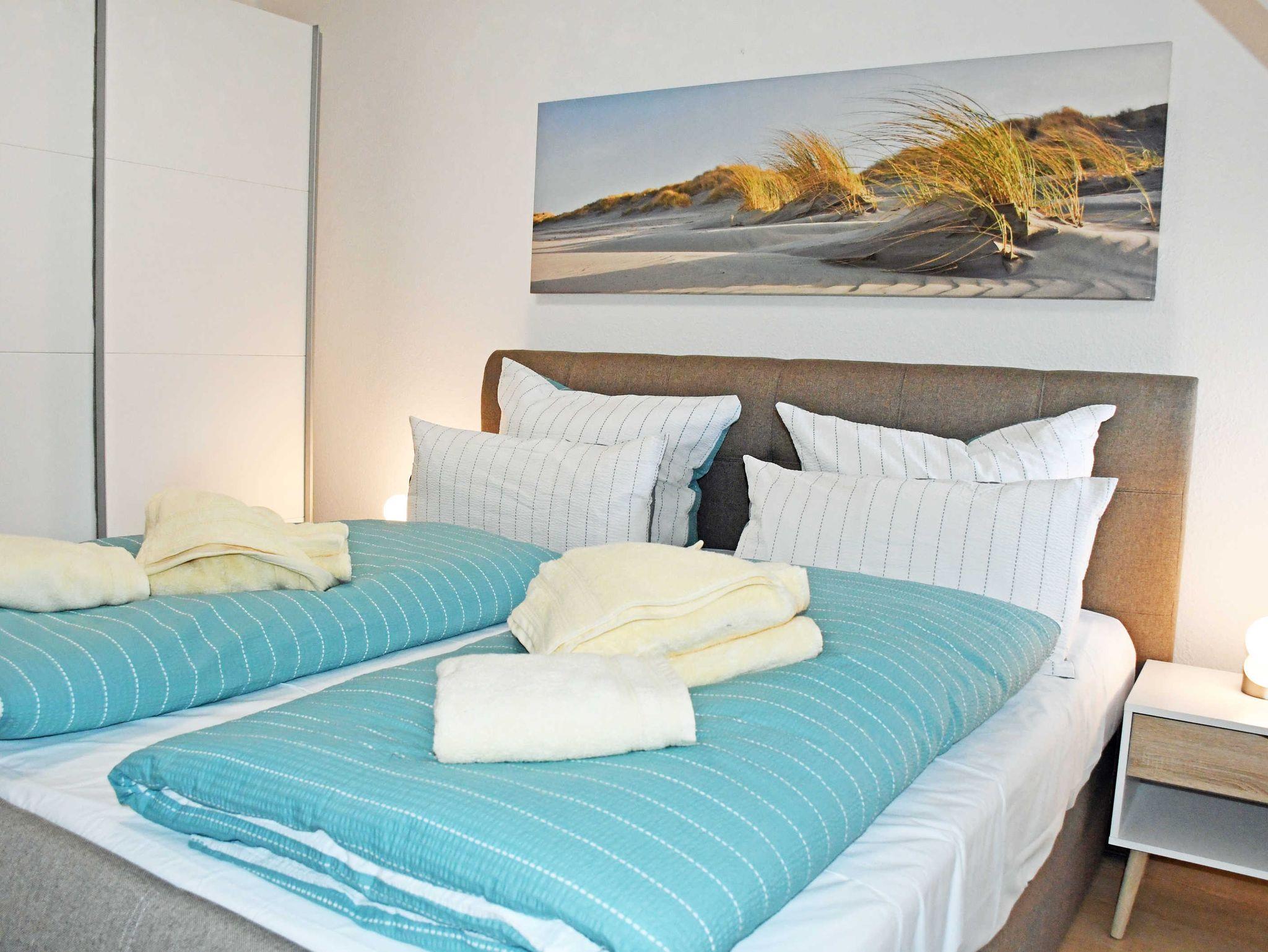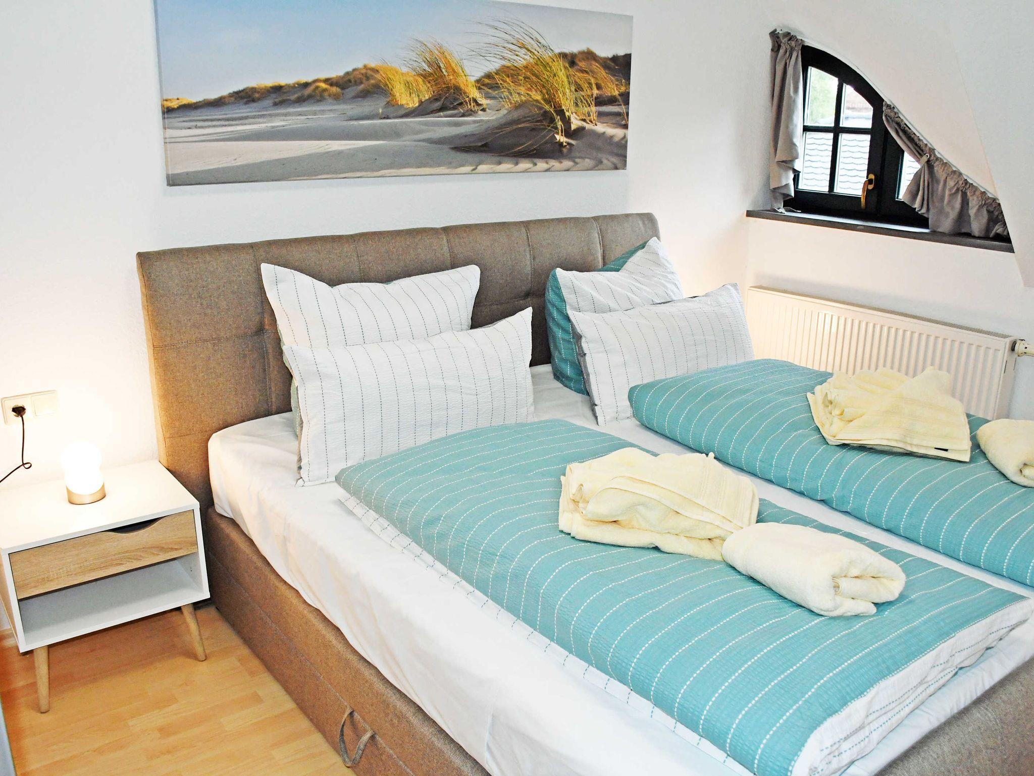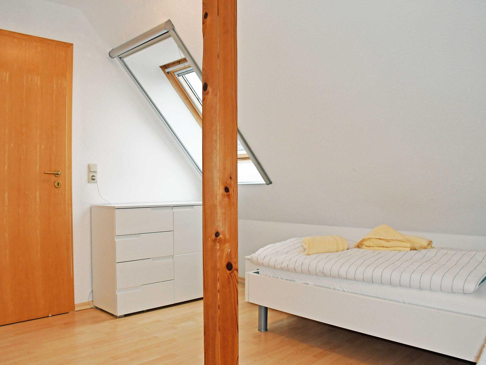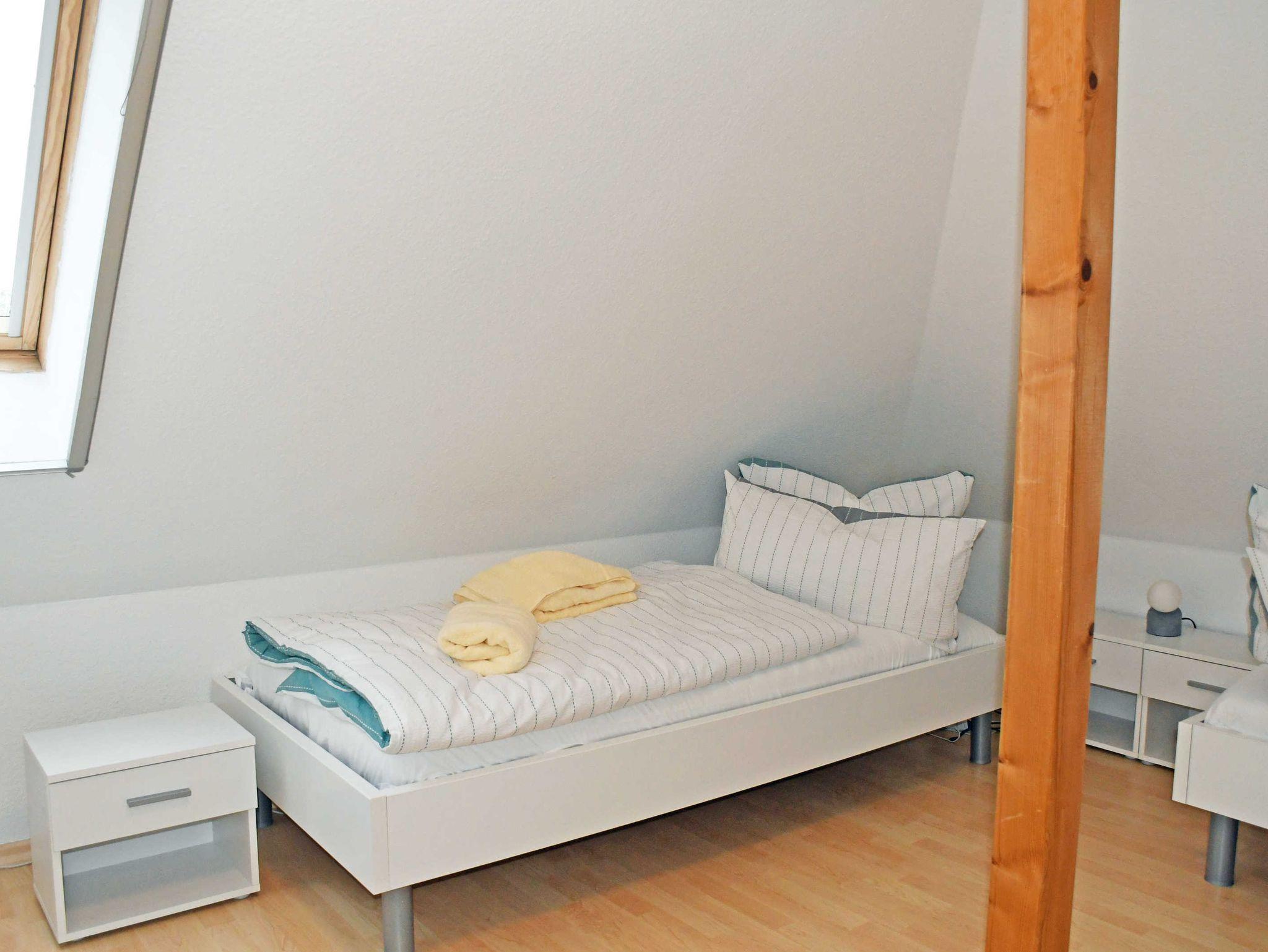 Im 1. Schlafzimmer befinden sich ein bequemes Doppelbett mit Nachttischen und Leselampen sowie einem Kleiderschrank. Auf Wunsch kann hier ein Kinderreisebett und ein Hochstuhl bereit gestellt werden. Das 2. Schlafzimmer befindet sich im Dachgeschoss, hier stehen 3 Einzelbetten.