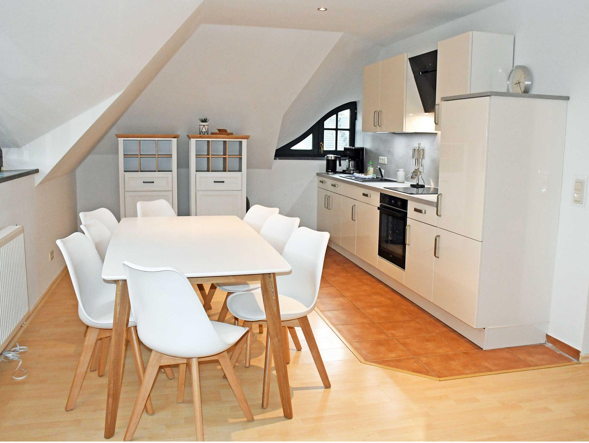 Im Wohnraum (1. OG) stehen eine große Couch, ein Tisch mit Sesseln und ein modernes Flachbild-TV-Gerät. Die Küchenzeile im Wohnbereich, ist mit Elektroherd mit Ceranfeld, Backofen, Kühlschrank mit Gefrierfach, Kaffeemaschine, Wasserkocher, Toaster komplett ausgestattet. Hier steht auch ein großer Esstisch mit Stühlen.