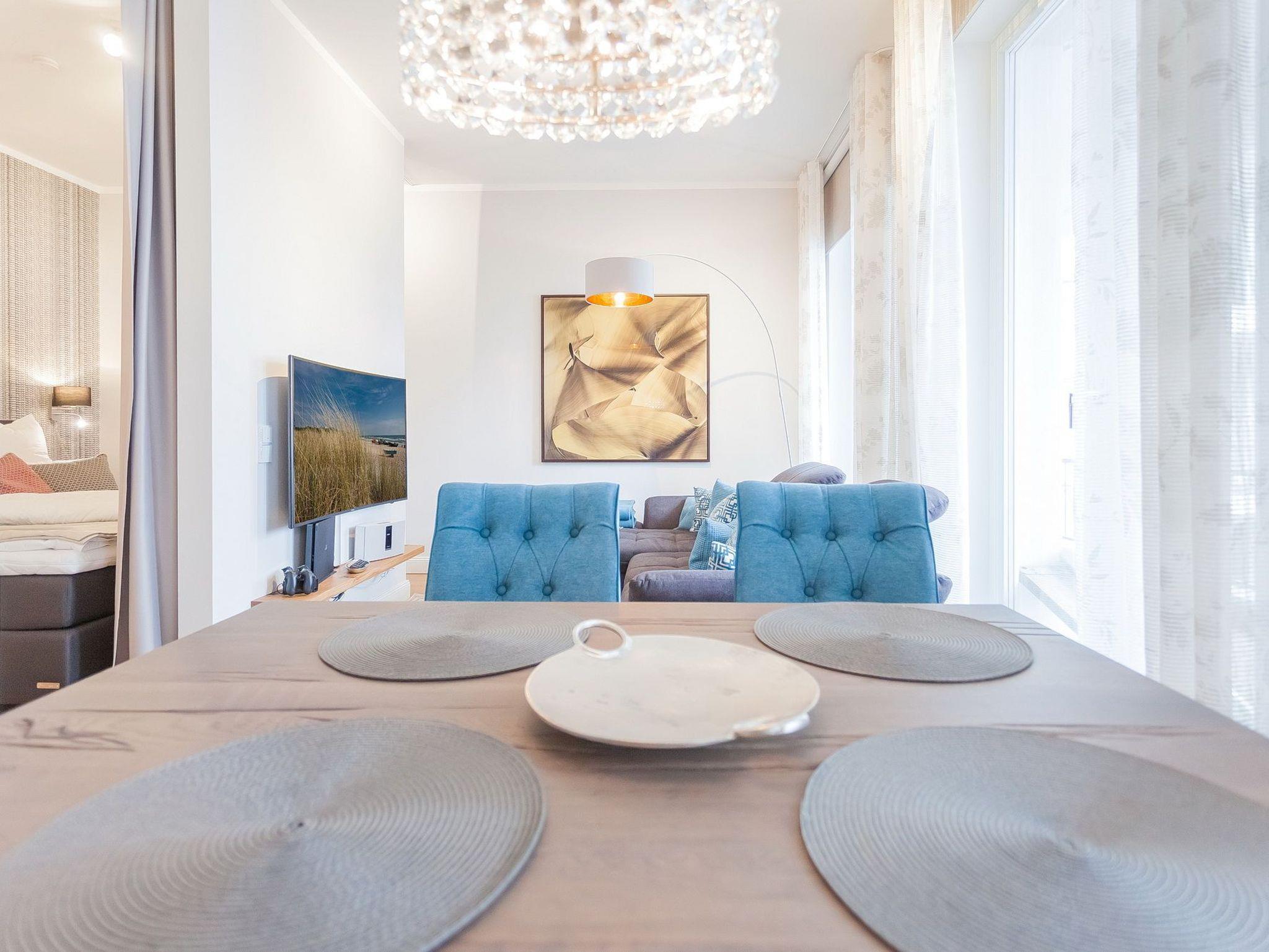 White Pearl - das klingt nach exklusiver Leichtigkeit, Eleganz und perfektem Urlaubsfeeling. Und genau das erwartet Sie, wenn Sie die Schwelle zu dieser Luxus-Ferienwohnung im zweiten OG des FIRST Sellin, direkt am Hochufer über der Seebrücke überschreiten werden. Als Gast im FIRST steht Ihnen exklusiv ein Hallenschwimmbad auf dem Dach mit fantastischem Meerblick samt Saunabereich zur Verfügung. Sonnen Sie sich auf der Dachterrasse im Strandkorb (saisonal) und genießen Sie von dort den Blick auf Seebrücke, Strand und Meer. Wenn Sie Ihre gut 53 qm große Ferienwohnung betreten, empfängt Sie herrliche Ruhe, denn Ihre Ferienwohnung ist vom geschäftigen Treiben abgewandt und hat vom sonnigen Balkon eine schöne Aussicht auf das gepflegte Grundstück im Stile einer Dünenlandschaft, auf den solarbeheizten Außenpool und auf das Grün des angrenzenden Küstenwaldes. Hier - an einem der absoluten Hotspots der Insel Rügen - lässt es sich Urlaub machen!