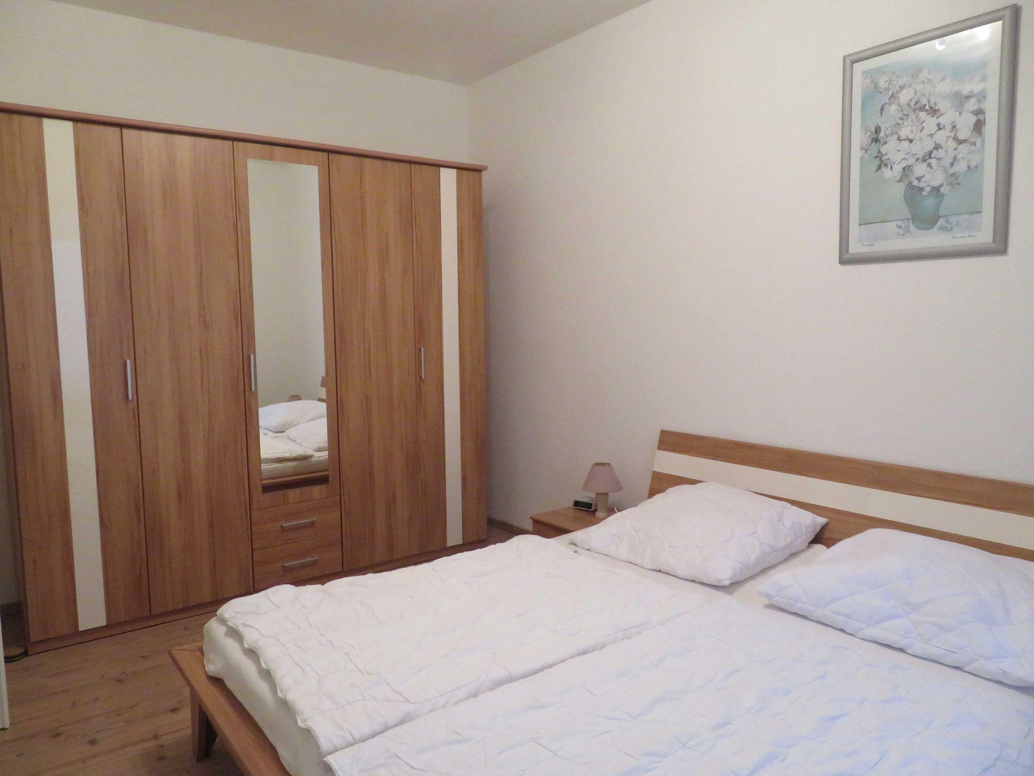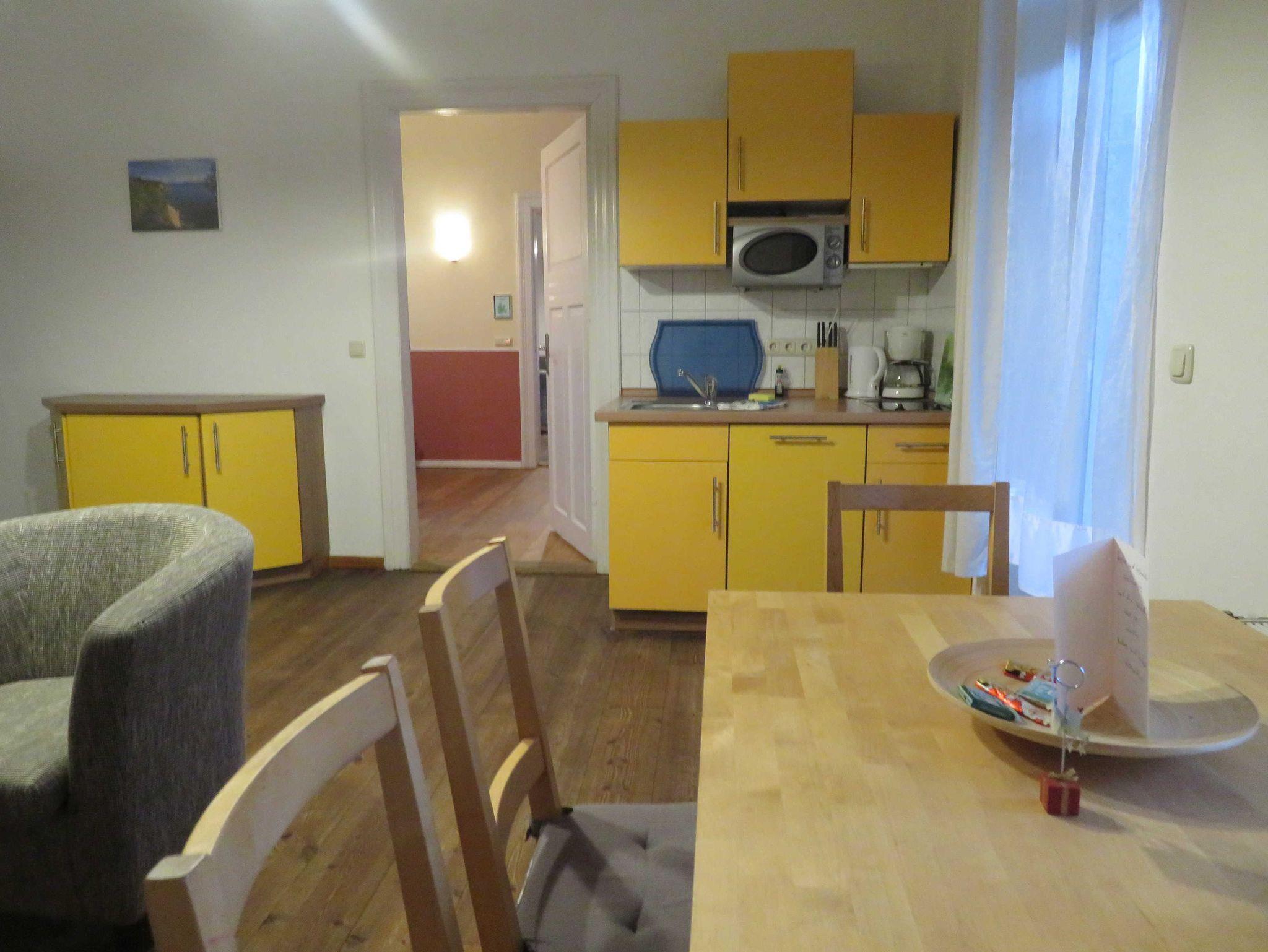 Die 2- Raum- Ferienwohnung hat ein Schlafzimmer mit einem Doppelbett und im Wohnzimmer ein Schlafsofa mit zwei weiteren Schlafplätzen. Im Wohnzimmer befindet sich die Küche mit Kühlschrank, Geschirrspülmaschine, Mikrowelle, Kaffeemaschine, Toaster und Wasserkocher. Die Ferienwohnung ist mit Kabel- TV ausgestattet und hat einen Balkon.
