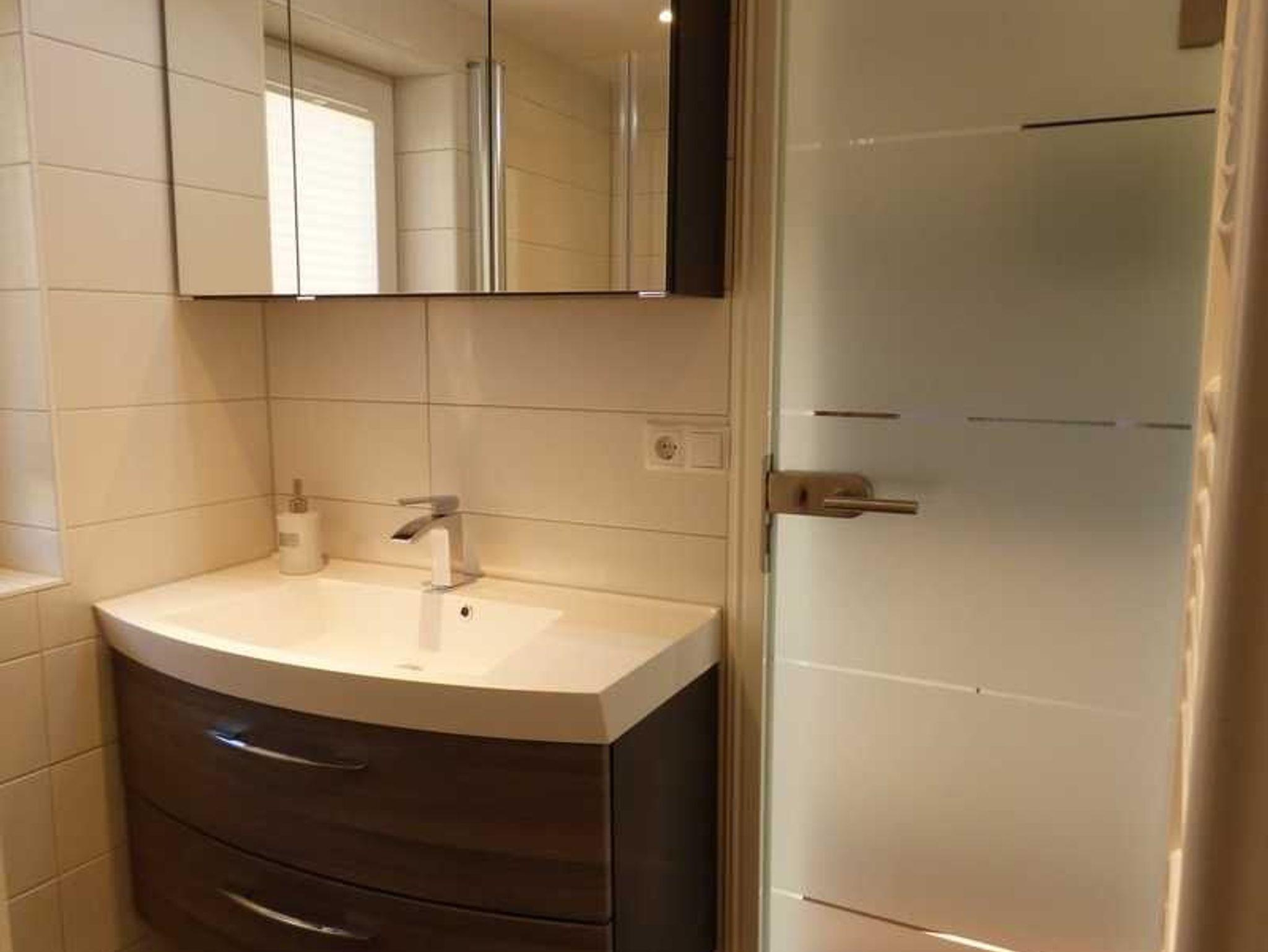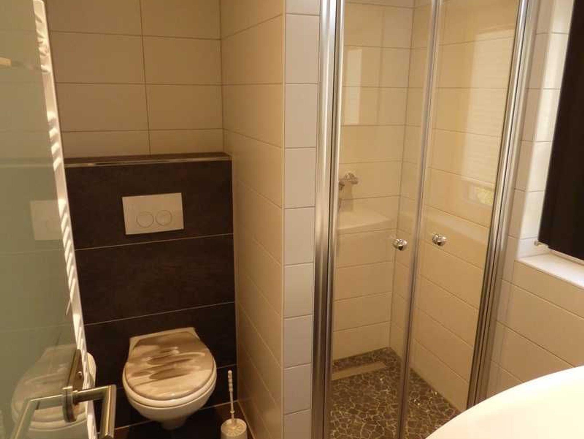 Unser modernes Bad verfügt über Tageslicht, ebenerdiger Dusche, Waschtisch und WC.