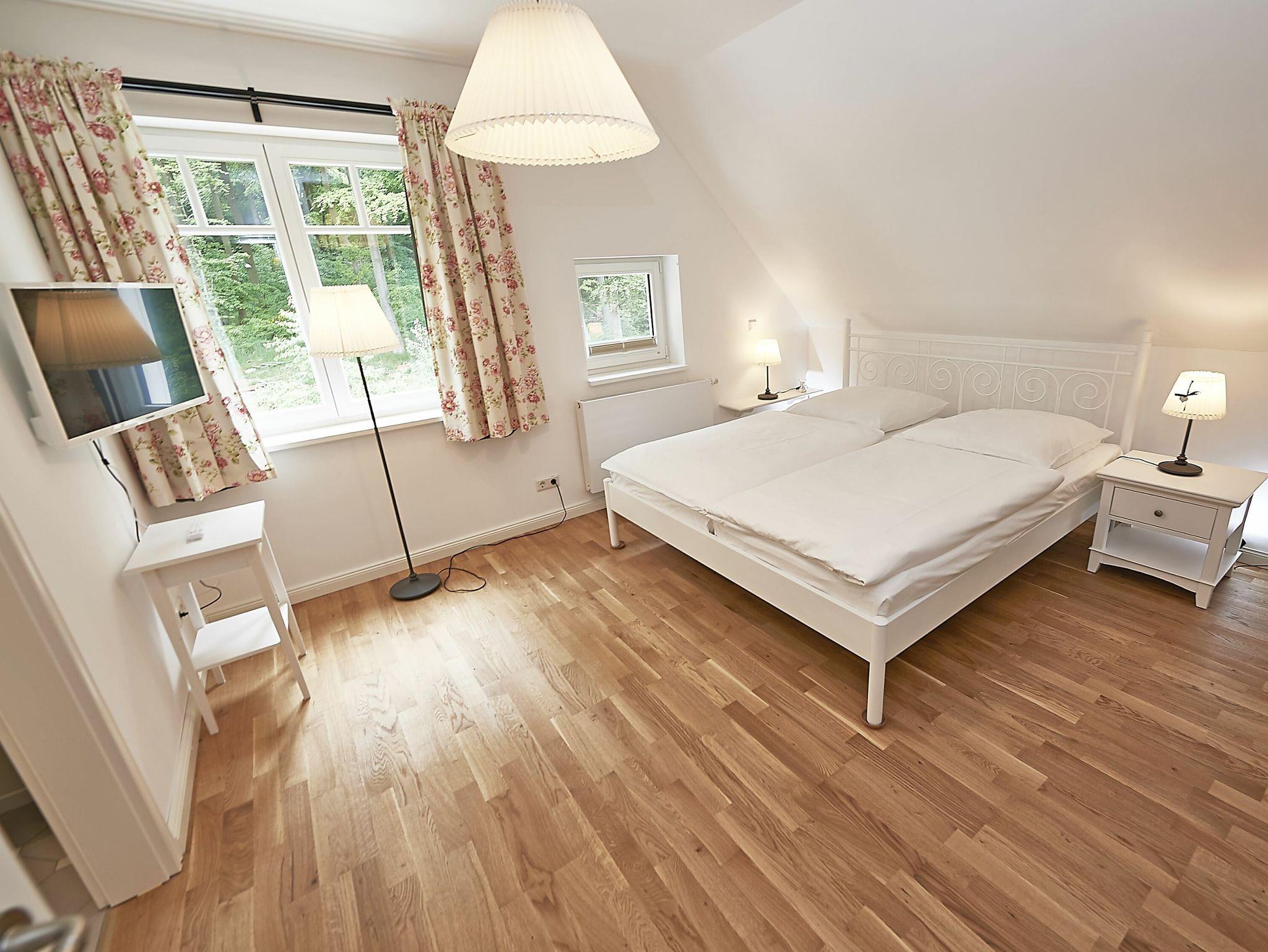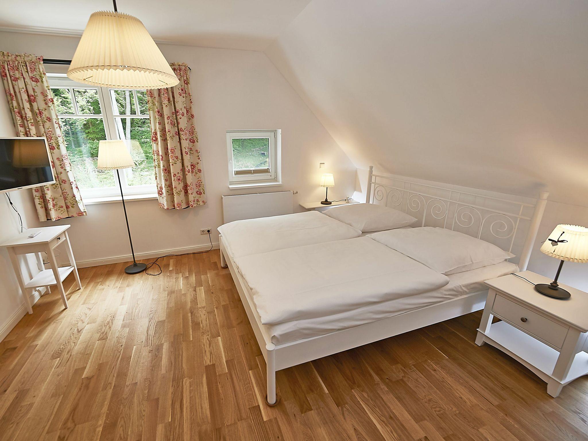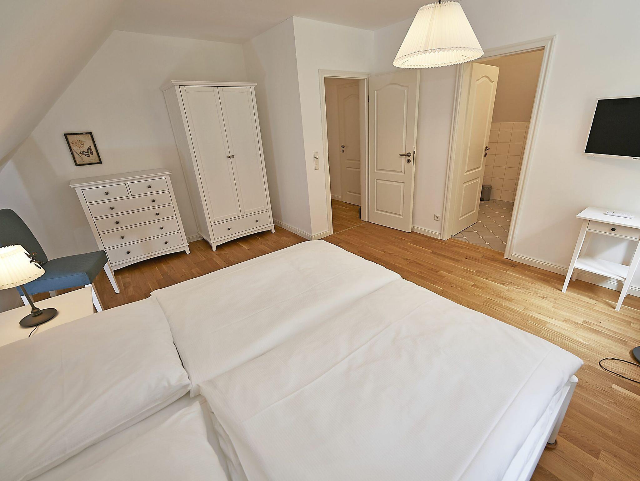 Im Dachgeschoss sind die beiden Schlafzimmer mit je einem großen Doppelbett und je einem separaten Bad untergebracht. Beide Bäder verfügen über eine Dusche und ein Bad zusätzlich über eine Badewanne. Der Fußboden ist mit einem Eichenparkett belegt. Die Heizung erfolgt über Wandheizkörper, welche sich individuell regeln lassen.