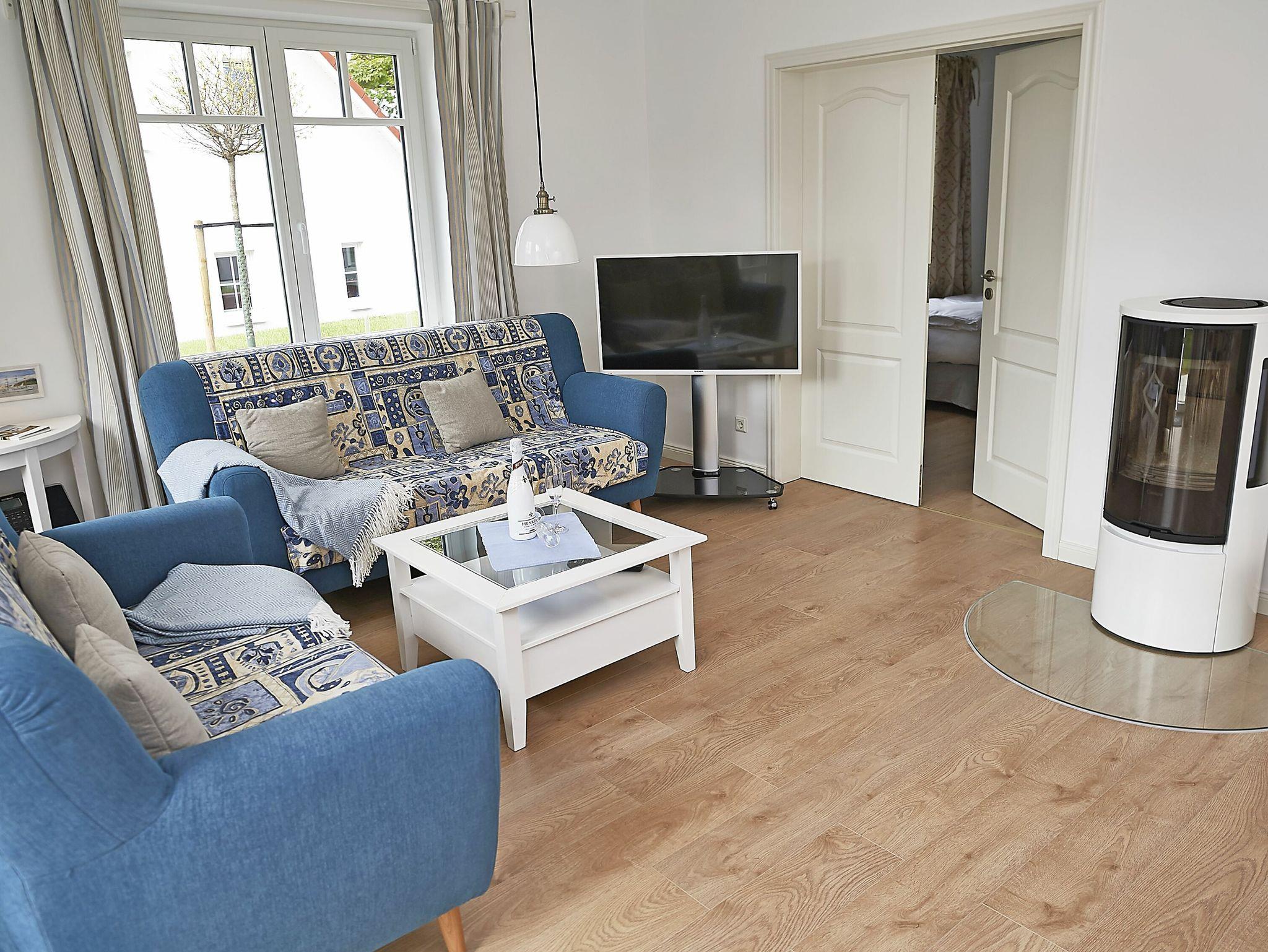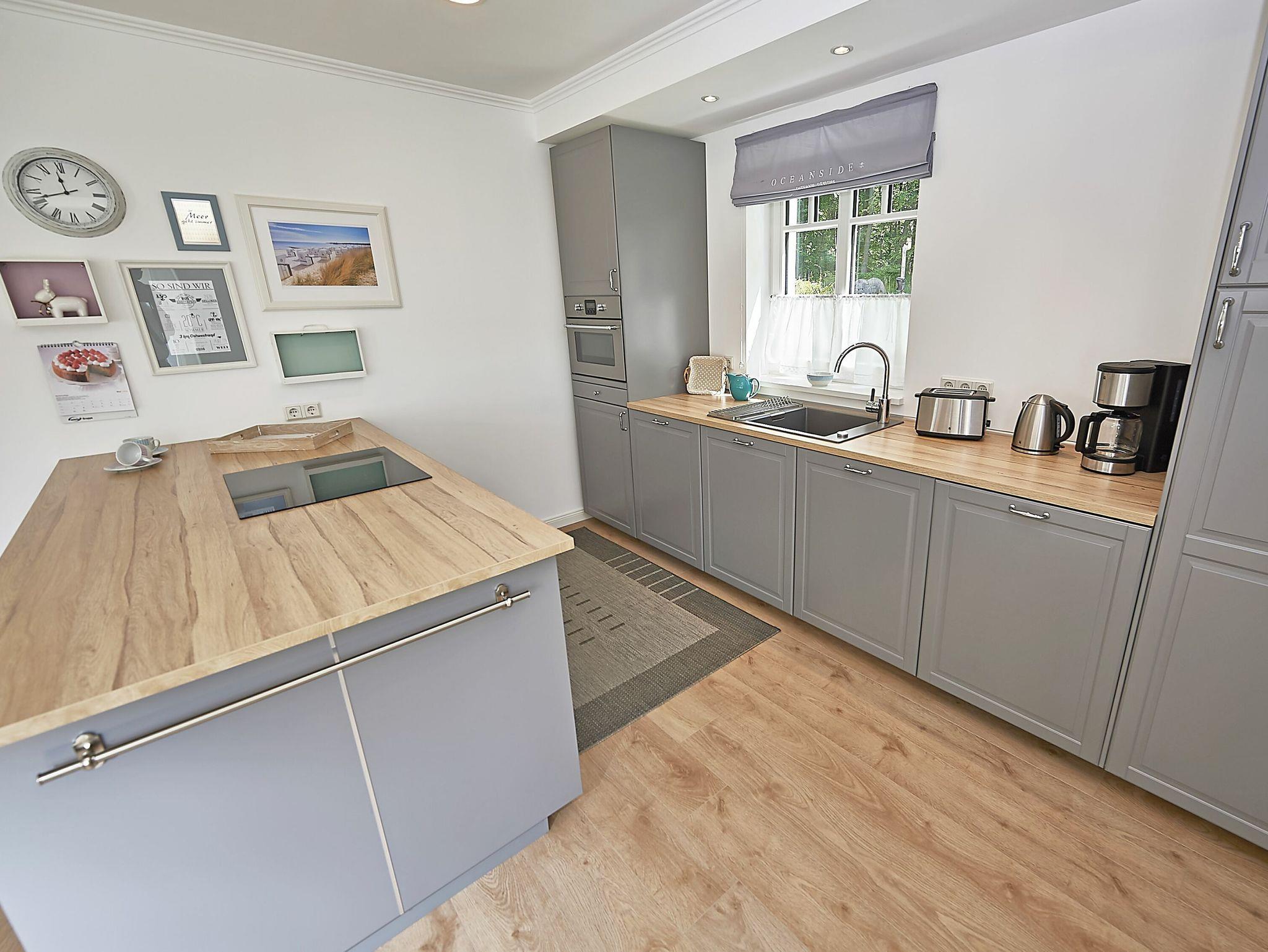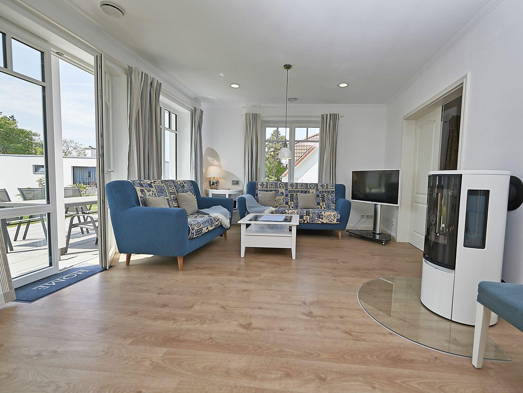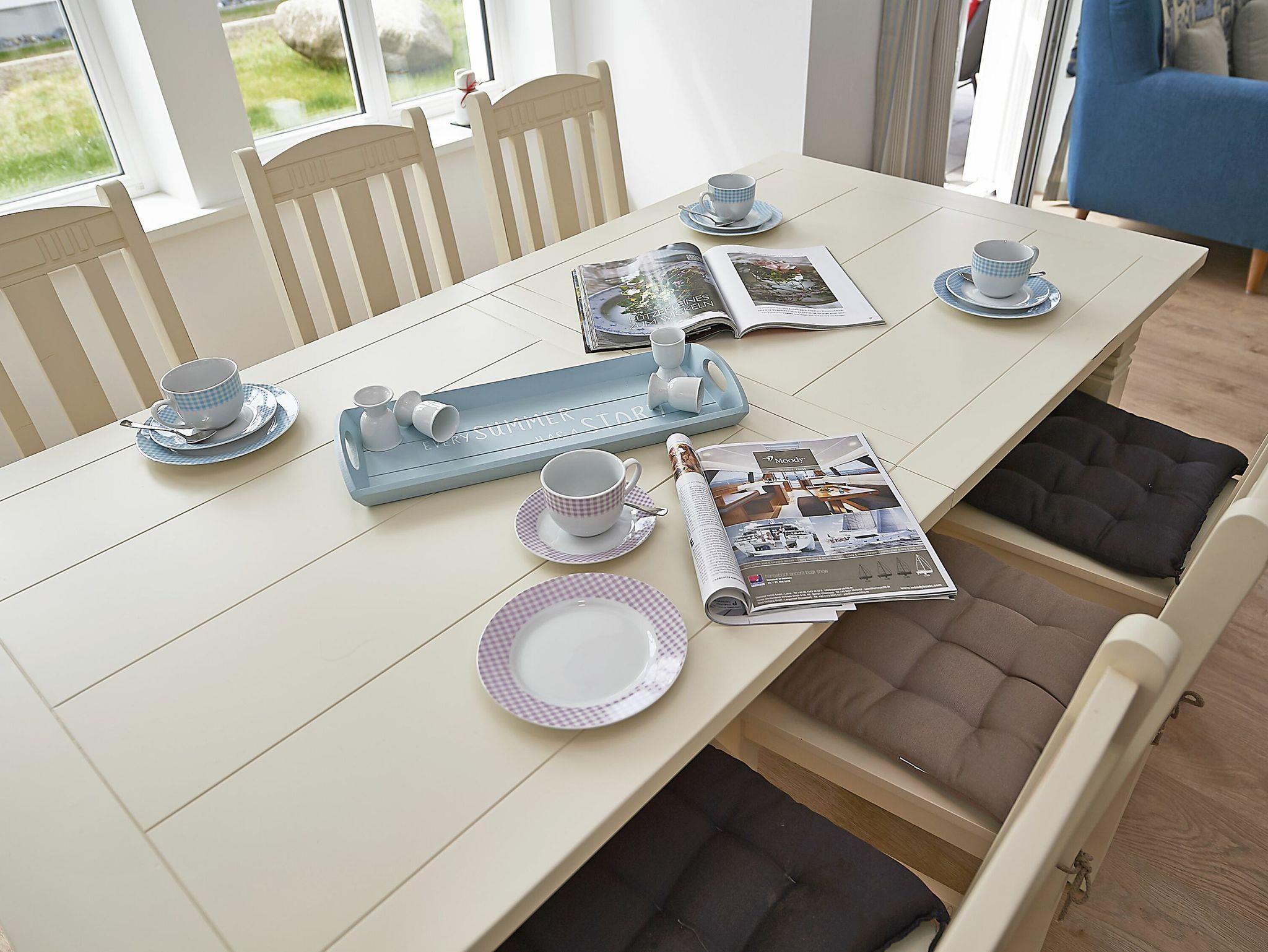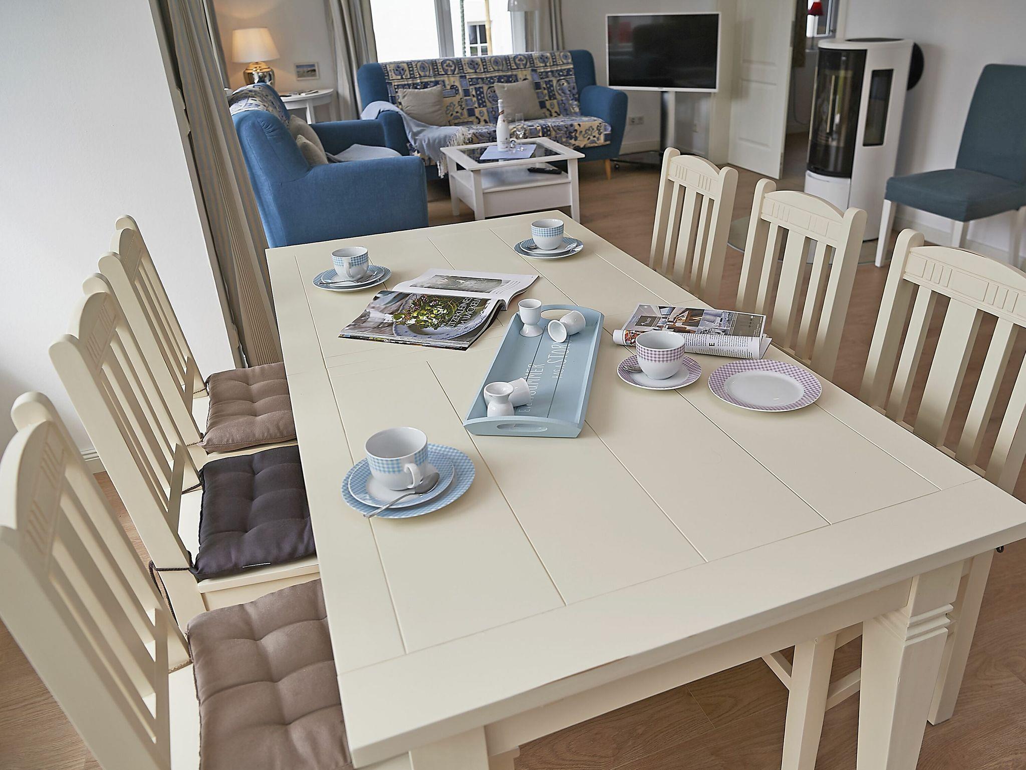 Die Wohnfläche beträgt mehr als 120 Quadratmeter und der großzügige Wohnraum, inklusive Küche und Essbereich garantiert einen entspannten Aufenthalt mit der Familie oder mit Freunden. Die Einrichtung besteht aus hochwertigen Möbeln im Landhausstil, die dazu passende Farbpalette findet sich vor allem in den Tönen weiß, grau, mauve und meerblau wieder.
