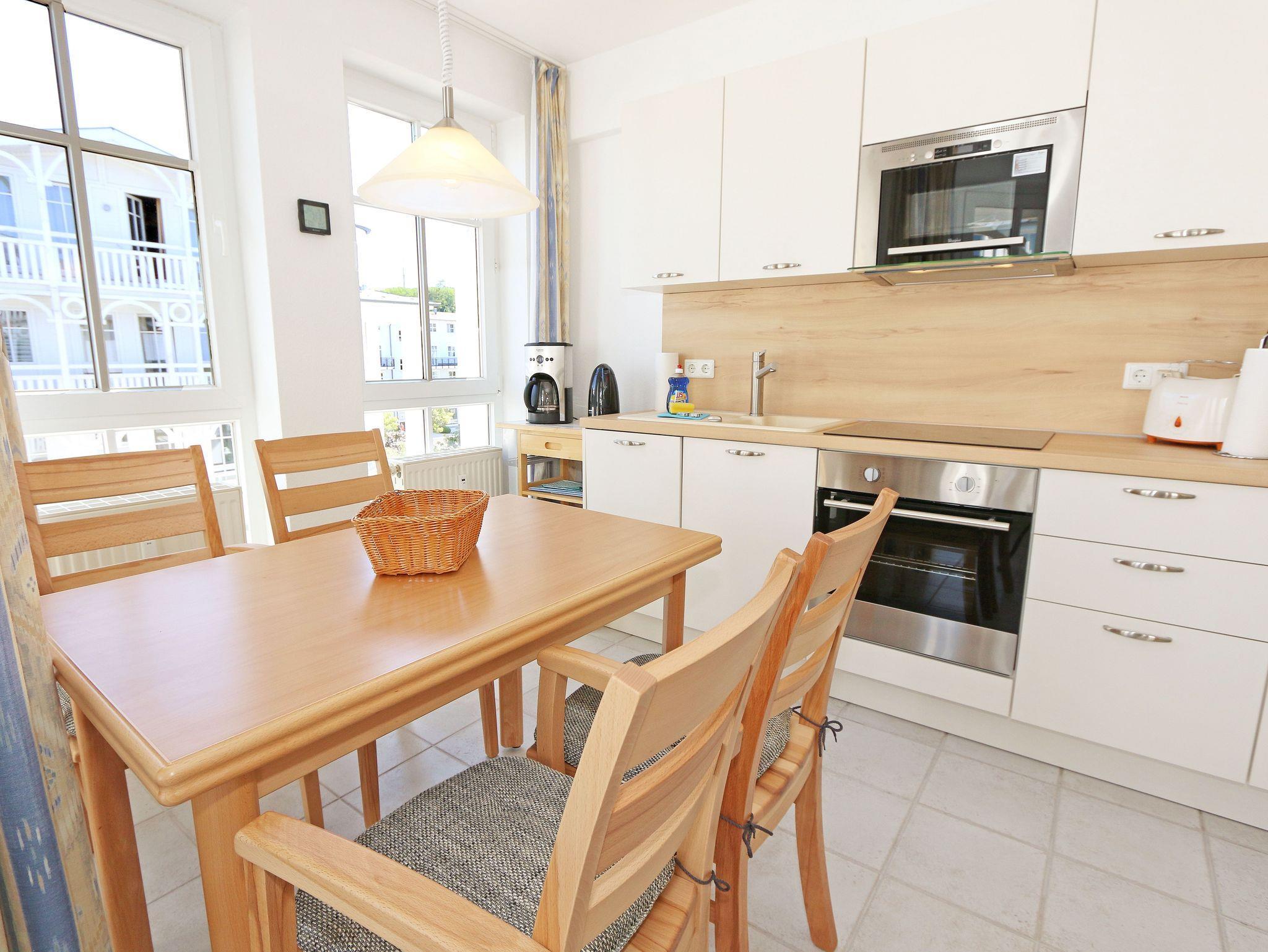 Die helle und gemütlich eingerichtete Nichtraucherwohnung befindet sich in der 2. Etage des Hauses Moritzdorf im Seepark Sellin. Die ca. 48 m² große Wohnfläche bietet ausreichend Platz für 2 bis 3 Personen. Der Essbereich verfügt über eine moderne Küchenzeile mit Induktions-Ceranfeld, Spüle, Kühlschrank, Spülmaschine, Mikrowelle, Backofen, Kaffeemaschine, Toaster, Wasserkocher sowie diverse Küchenutensilien. Ein heller Esstisch mit 4 Stühlen lädt Sie zu den Mahlzeiten ein. Im vollständig gefliesten Wohnbereich können Sie es sich in einem Relaxsessel ? vielleicht nach einer längeren Strandwanderung ? bequem machen. Eine Couch (Aufbettungsmöglichkeit für die 3. Person/ 1,20 m x 1,90 m) komplettiert das Angebot. Flachbildfernseher, DVD-Player und Mini-Stereoanlage gehören zur technischen Wohnungsausstattung genauso dazu wie ein für Sie kostenfrei nutzbarer WLAN-Anschluss. Vom Wohnbereich aus erreichen Sie den großen bestuhlten Balkon (Westen). Eine Zigarette oder eine Zigarre lassen sich durchaus auch hier genießen. In der Wohnung bitten wir mit Rücksicht auf andere Gäste darum, nicht zu rauchen. Zwischen Wohn- und Schlafzimmer liegt das Badezimmer. Es ist mit einer ebenerdigen Dusche, einem WC, einem Waschbecken und einen Fön ausgestattet. Das mit Vinyl ausgelegte Schlafzimmer bietet Ihnen ein Doppelbett (2 x 0,90m x 2,00m), Nachttischablagen und einen geräumigen Kleiderschrank. Für unsere kleinen Gäste steht 1x Kinderreisebett (ohne Zusatzmatratze, ohne Bettinlett) und 1x Hochstuhl inklusive zur Verfügung. Ein eigener PKW-Stellplatz (Nr. 86) steht in der Tiefgarage (Höhe 1,80m) zu Ihrer ausschließlichen Nutzung kostenfrei zur Verfügung. Fahrräder können Sie im Keller sicher abstellen. Haustiere sind nicht erlaubt. Die Erstausstattung eines Wäschepaketes (komplette Bettwäsche, 1 Duschhandtuch, 2 kleine Handtücher) können Sie bis 14 Tage vor Anreise gegen einen Aufpreis dazu buchen oder durch eigene ergänzen. Ab 2 gebuchten Paketen erhalten Sie einmalig 1 Geschirrhandtuch und 1 Duschvorleger hinzu. Wir wünschen Ihnen einen erholsamen Urlaub auf der schönen Insel Rügen in Sellin!