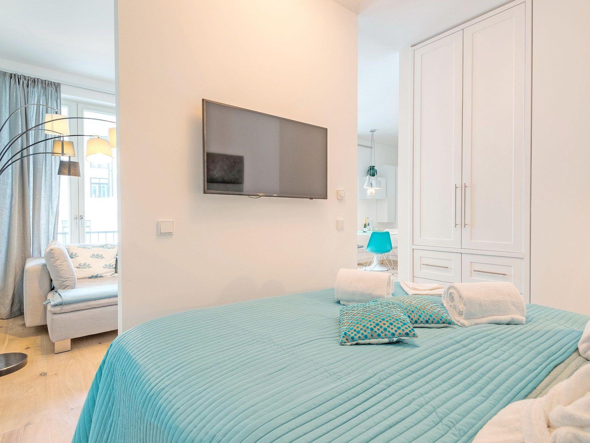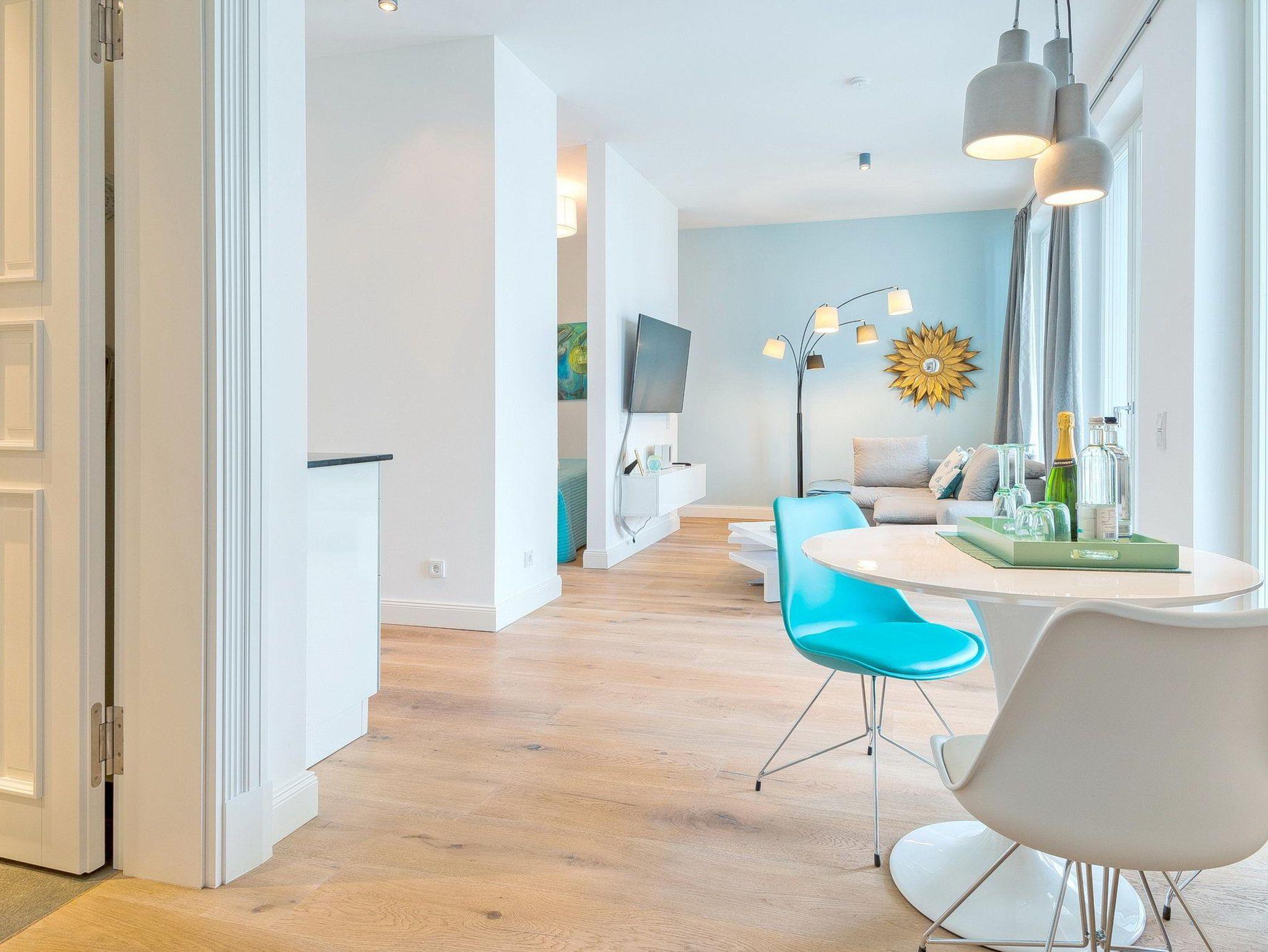 Die Ferienwohnung ist wie das gesamte Haus sehr hochwertig eingerichtet. Das Wohnzimmer ist mit einem Schlafsofa auf dem eine 3. Person schlafen kann, großem Flatscreen, Bluetooth-Tower von Bose und kostenfreiem WLAN einer offenen Küche die mit hochwertigen Markenprodukten ausgestattet ist. Das Schlafzimmer überzeugt mit einem gemütlichen Boxspringbett (180 x 200 cm) und einem Flachbildfernseher.