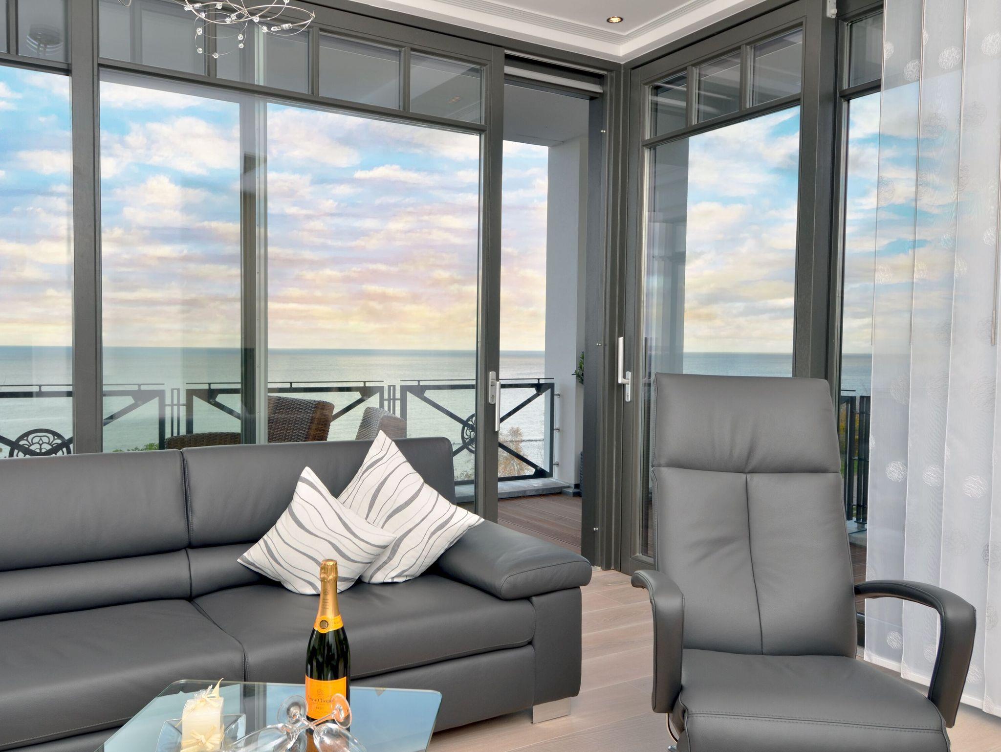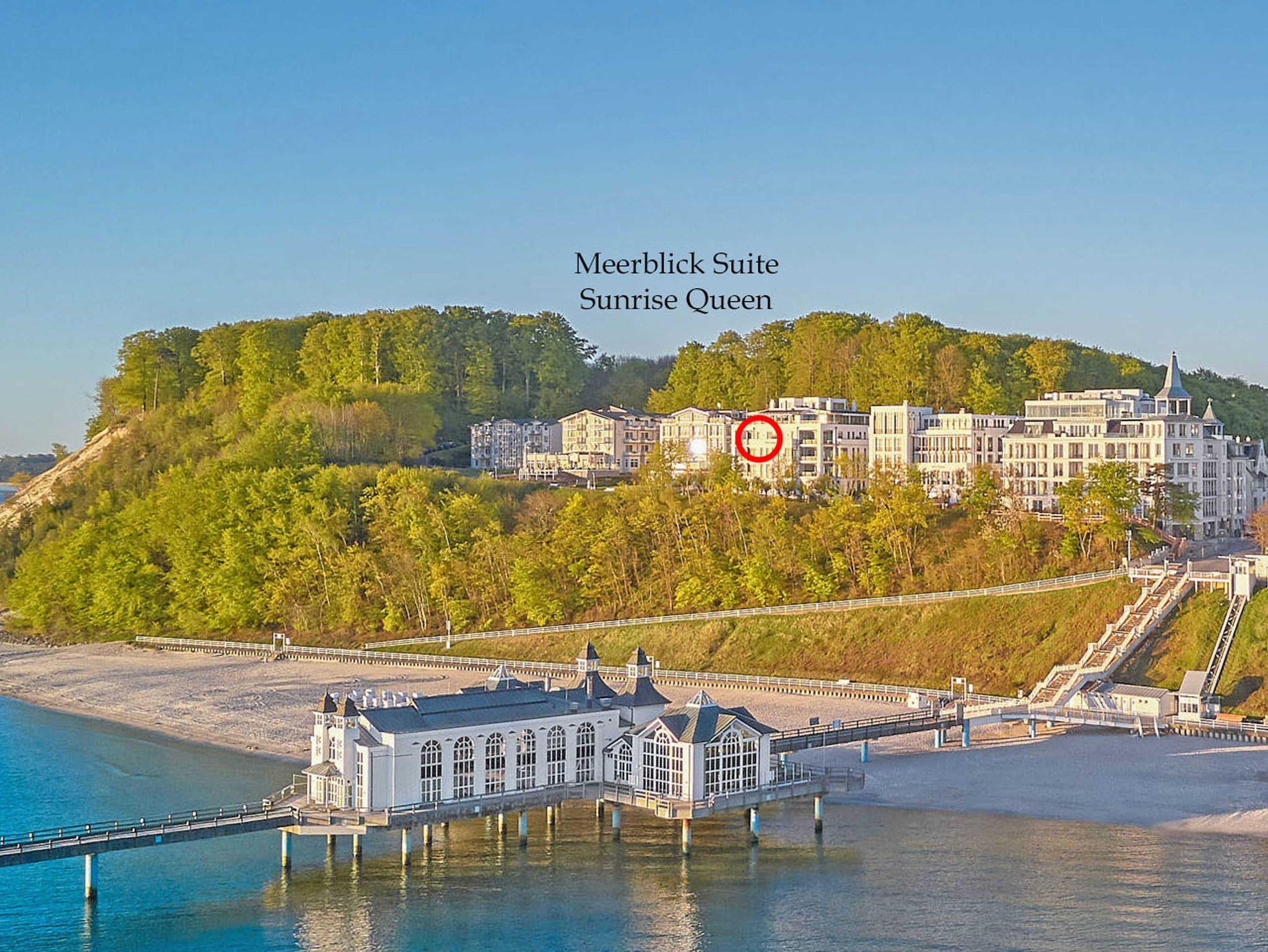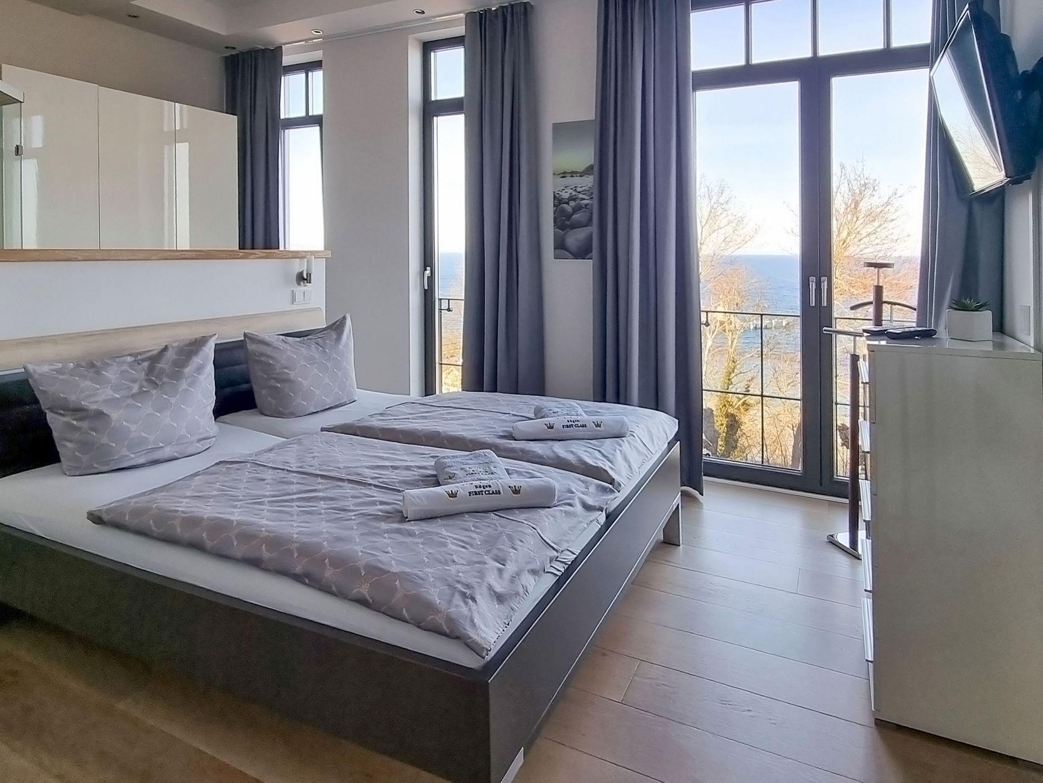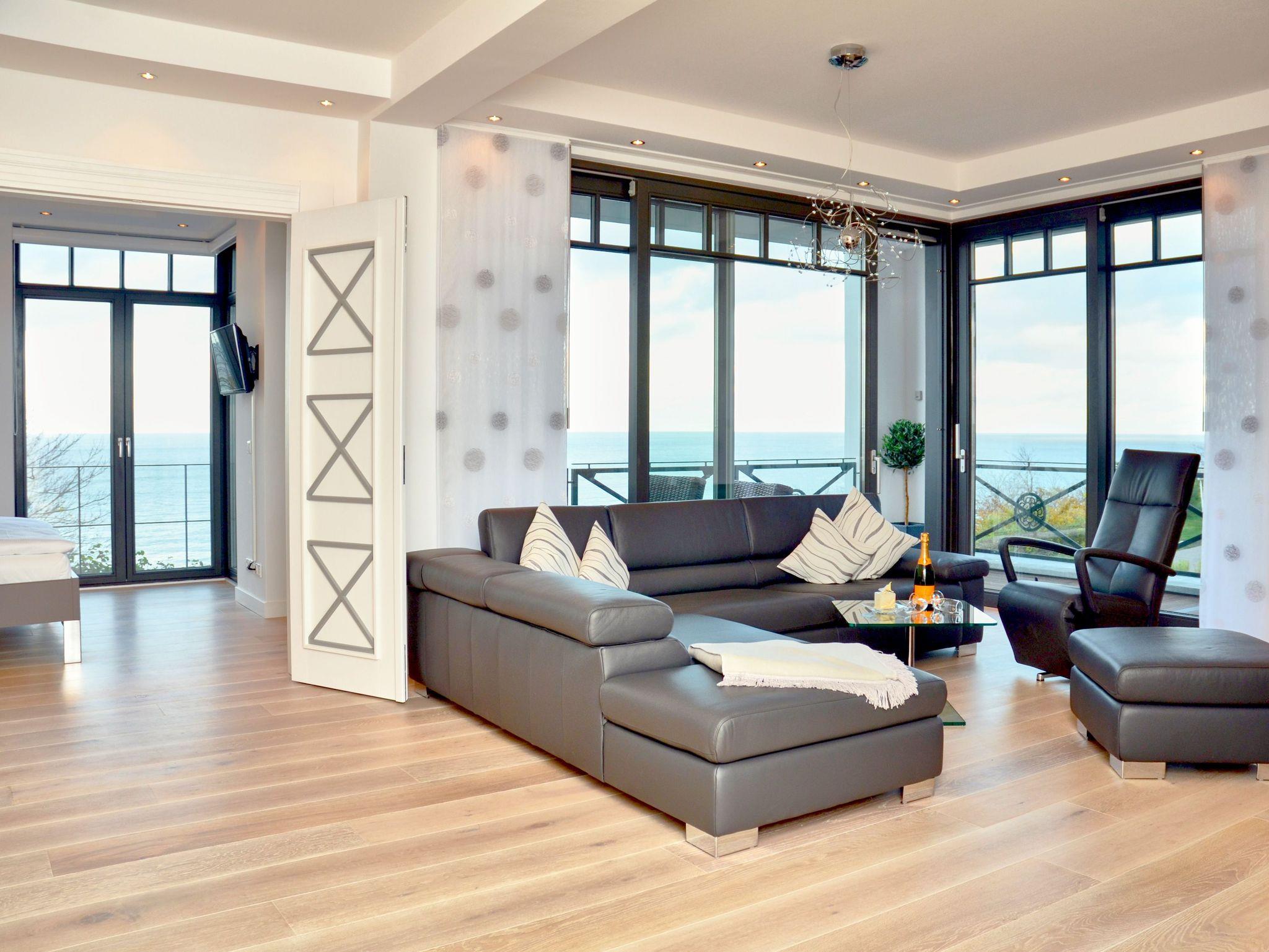 Luxuriöse Meerblicksuite Sunrise Queen in Sellin mit 5-Sterne-Ausstattung, großem Balkon und privater Infrarotsauna.