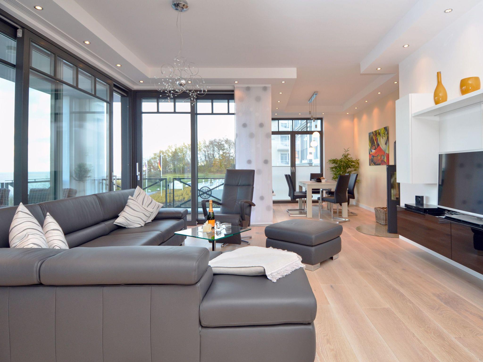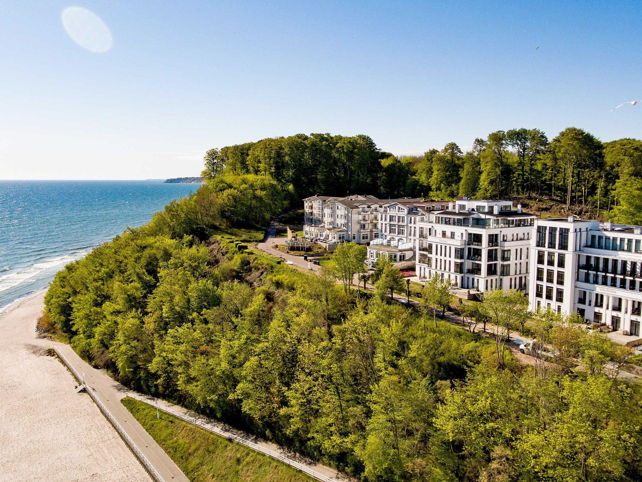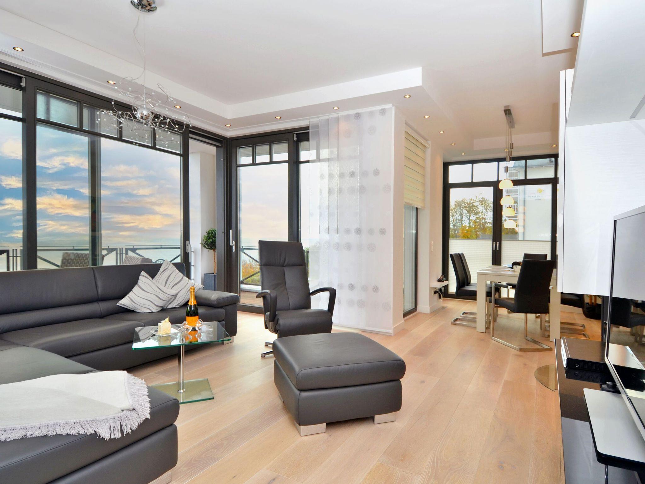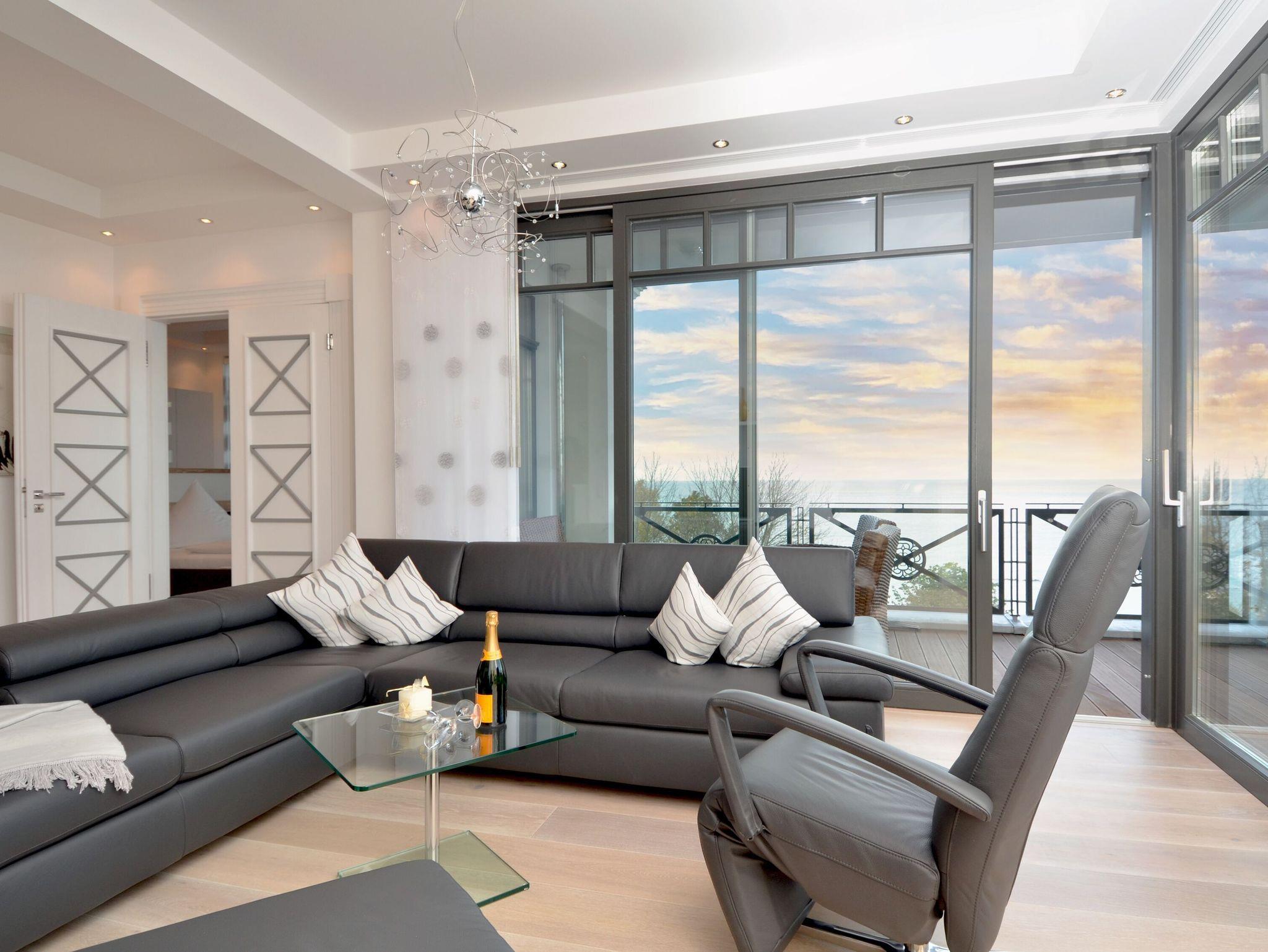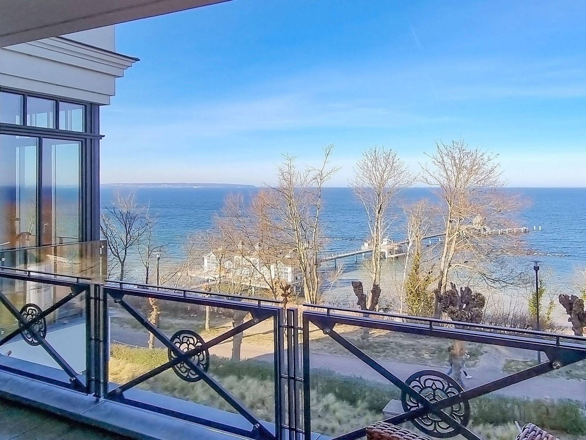 Luxuriöse Meerblicksuite Sunrise Queen in Sellin mit 5-Sterne-Ausstattung, großem Balkon und privater Infrarotsauna.