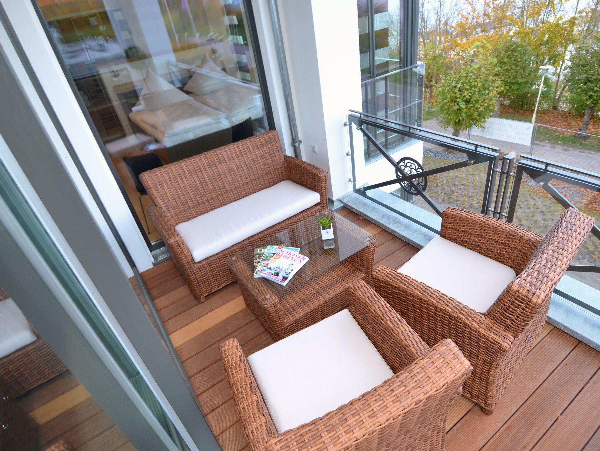 Der 21 qm große, nach Osten ausgerichtete Balkon, den man vom Wohnbereich aus betreten kann, ist mit ausgesuchten, bequemen Balkonmöbeln ausgestattet und sorgt für unvergessliche Urlaubsmomente auf der Insel Rügen.