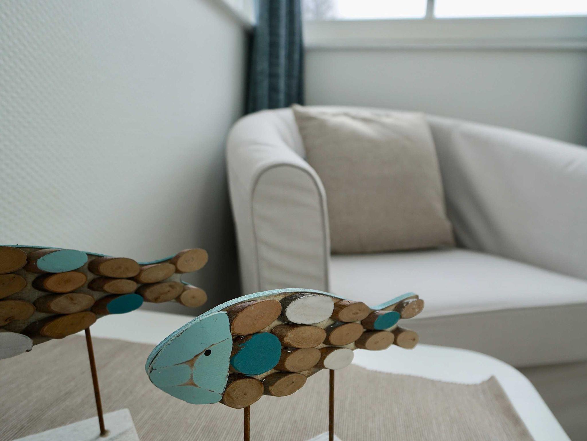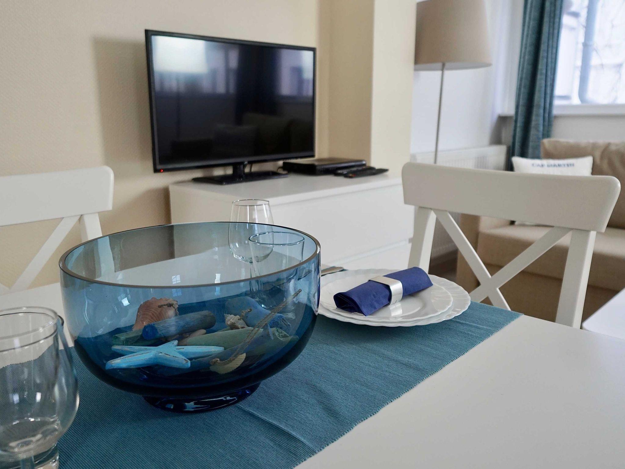 Das komfortable Ferienappartement bietet auf 44 m² Platz für 4 Personen. Gemütliche Schlafplätze bieten in dieser Wohnung ein Doppelbett und ein Schlafsofa, das für 2 Personen aufgebettet werden kann. Beides befindet sich im Wohn- und Essbereich des Appartements mit integriertem Wintergarten, der Ihnen mit dem bequemen Lesesessel Platz zur Entspannung bietet. In diesem Raum finden Sie ebenfalls eine Küchenzeile, die Ihnen im modernen Landhausstil allen Komfort bietet, den Sie im Urlaub zum Kochen benötigen. Neben einem Wasserkocher und einer Kaffeemaschine stehen Ihnen auch ein Backofen sowie ein Cerankochfeld zur Verfügung. Der WLAN-Zugang und ein SodaStream steht Ihnen kostenfrei zur Verfügung. Ein modernes Tageslicht-Badezimmer mit WC und Dusche mit Fön ist ebenfalls vorhanden. Ein Kinderbett (bis zwei Jahre) kann bei Bedarf bereitgestellt werden.