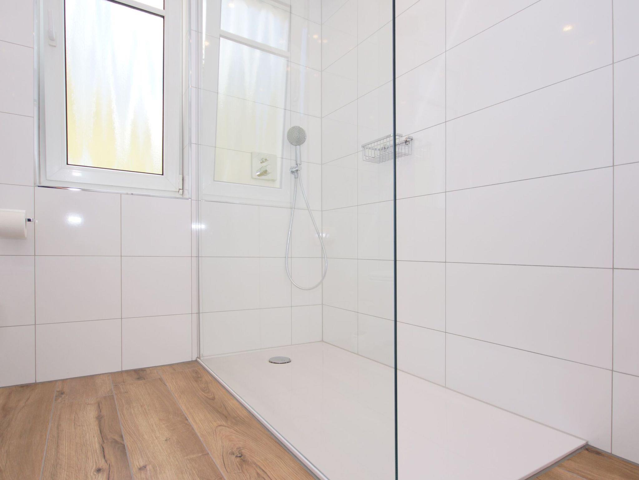 Das moderne Badezimmer ist mit einer Dusche, einem Waschbecken mit großem Spiegel und einer Toilette ausgestattet.