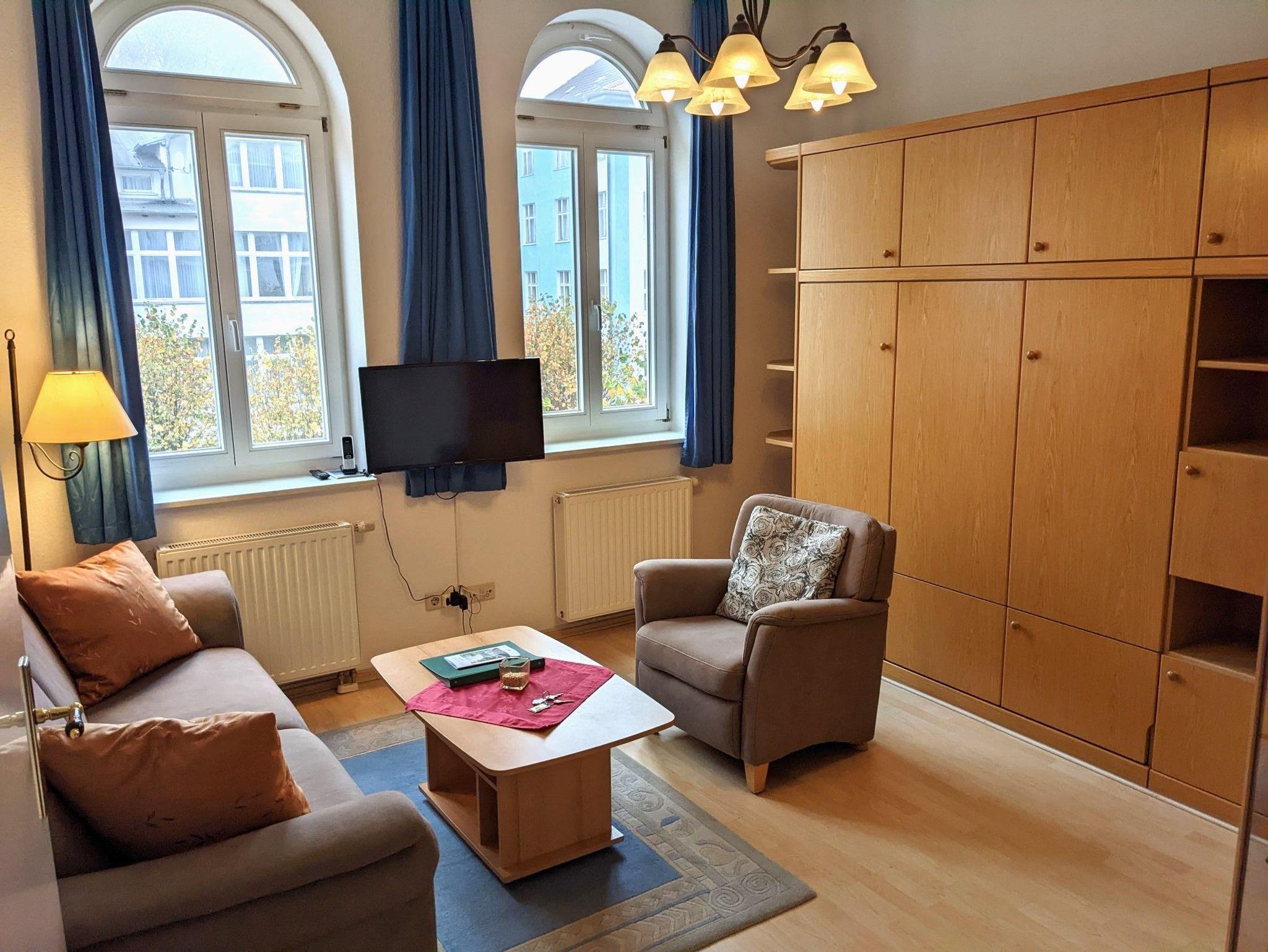 • Wohnzimmer mit Schrankbett, Couch sowie Flachbild-TV