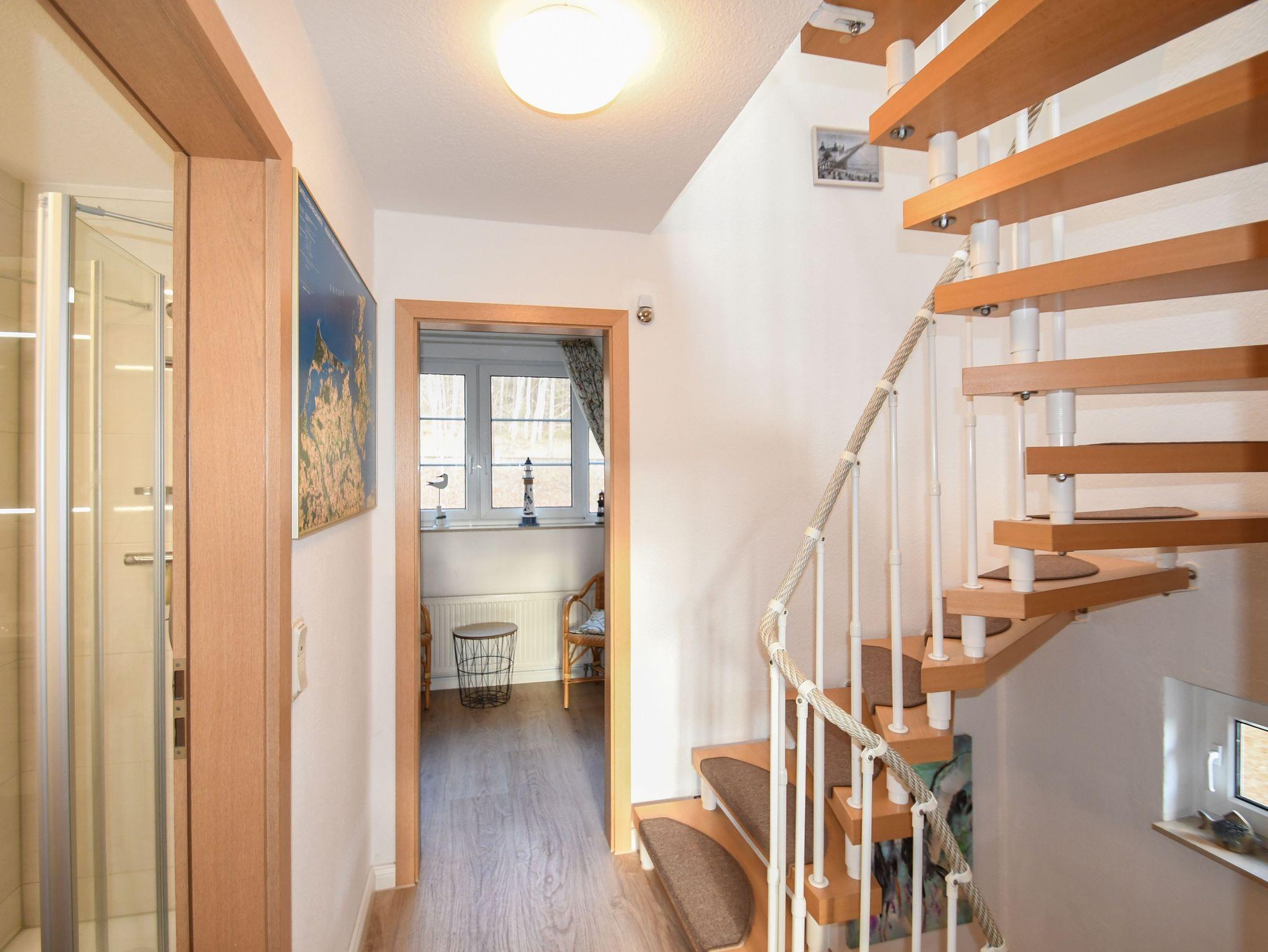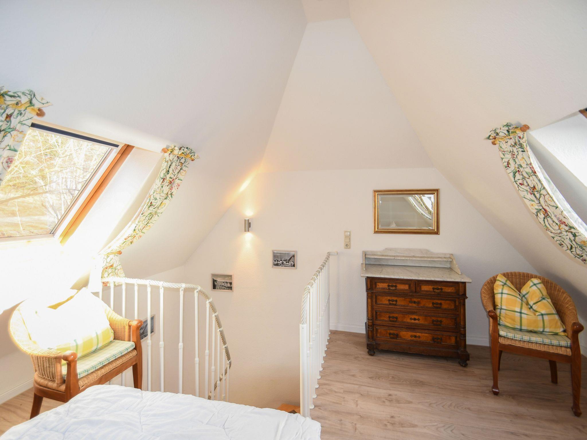 Eine Treppe führt vom Wohnbereich im 1. OG. als auch in das Schlafzimmer mit Doppelbett im Dachgeschoss