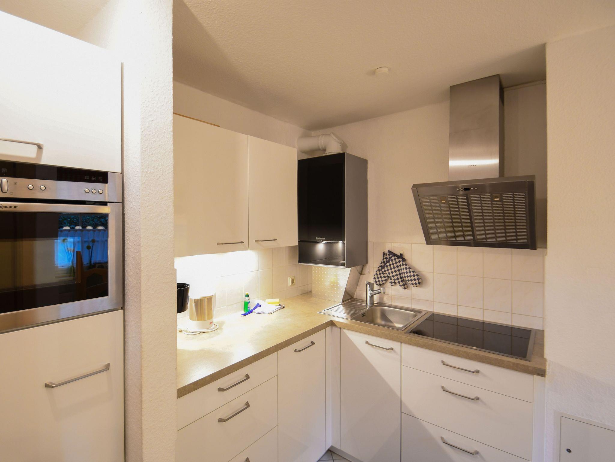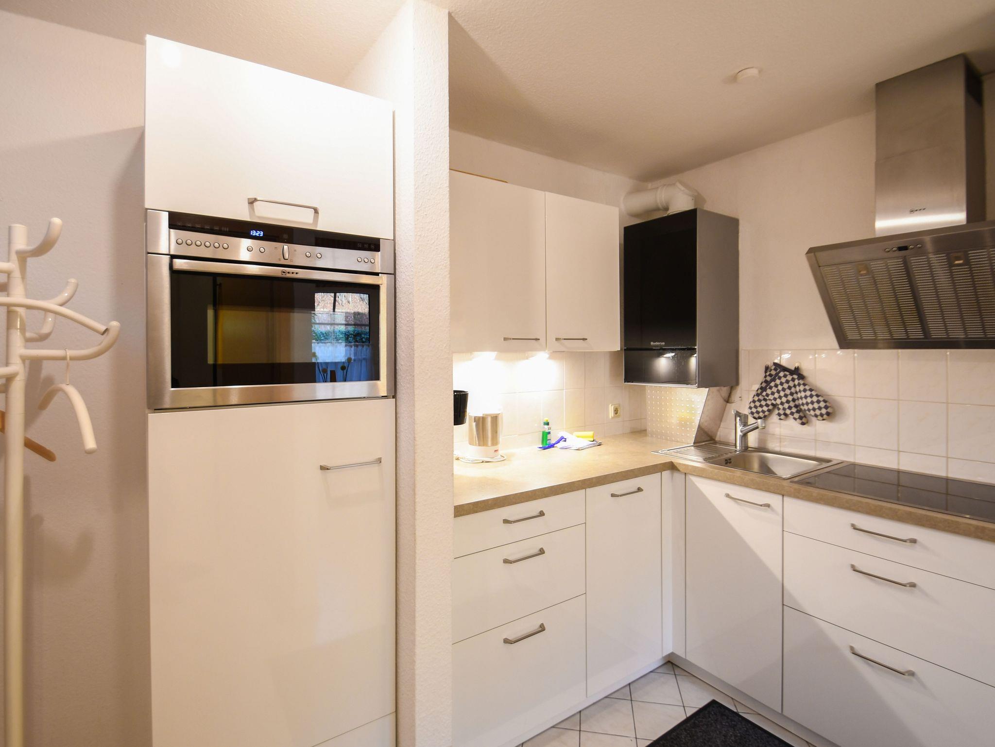 Die Einbauküche ist komfortabel ausgestattet mit Geschirrspüler, Ceran-Kochfeld, Backofen, Mikrowelle und Kühlschrank. Toaster, Wasserkocher und Kaffeemaschine.