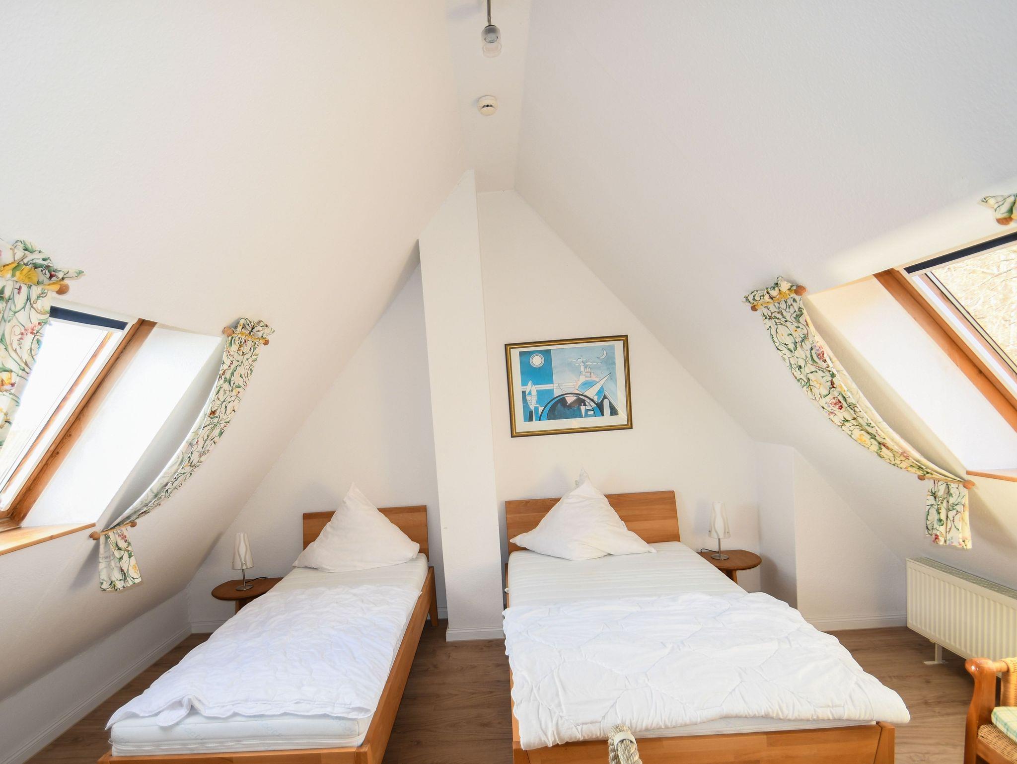 Auf der gleichen Ebene im 1. OG wie der Wohnbereich befinden sich das Badezimmer, separates Schlafzimmer mit 2 Einzelbetten.