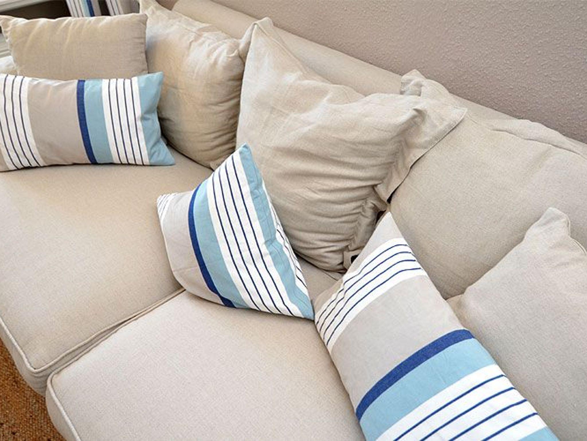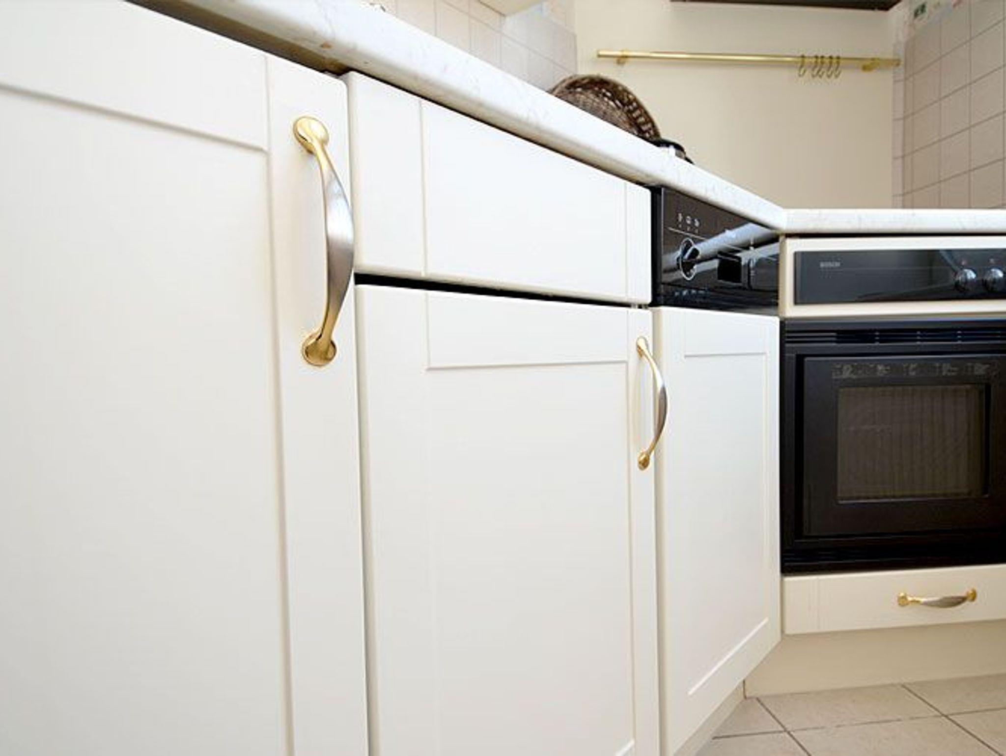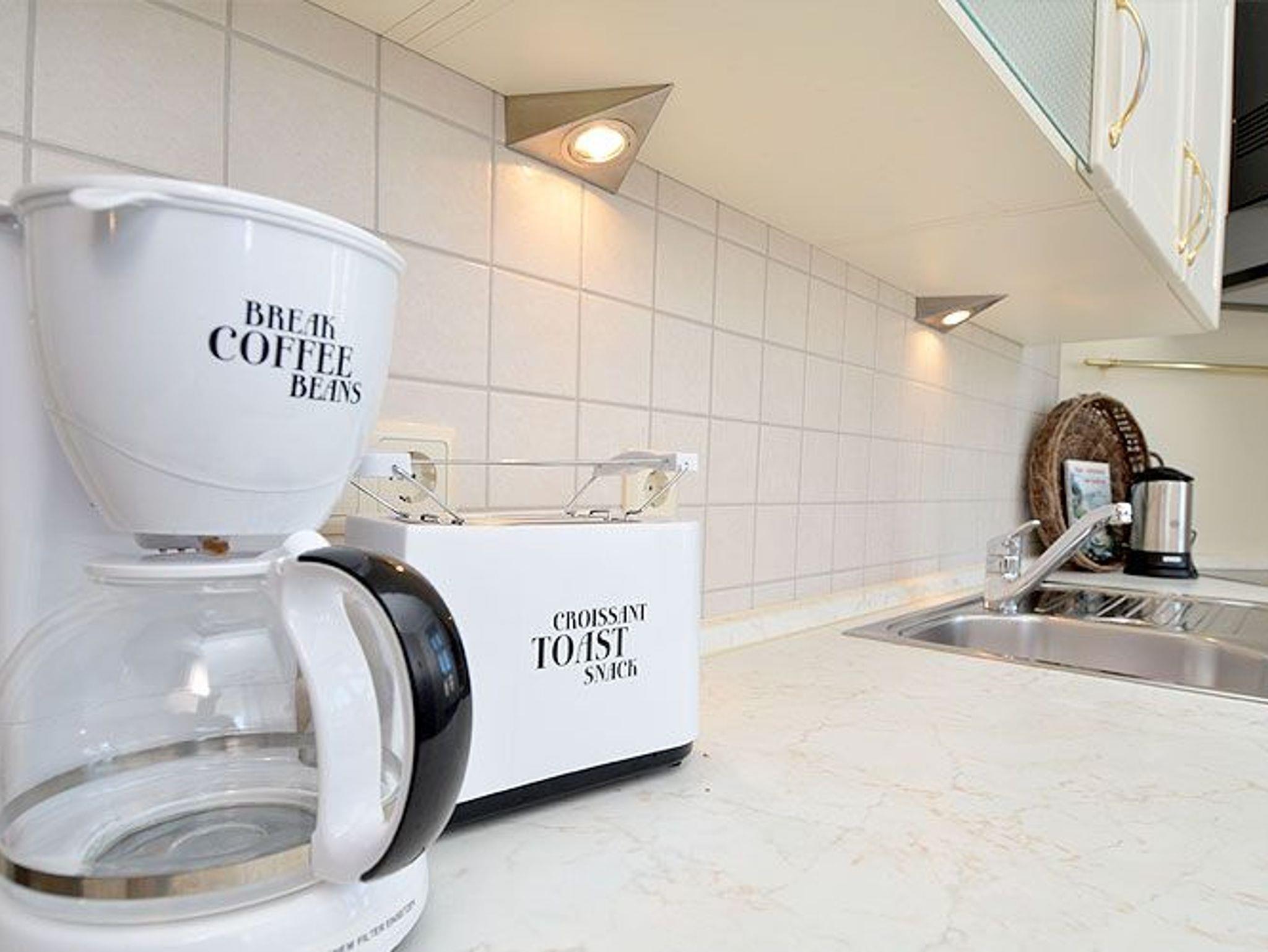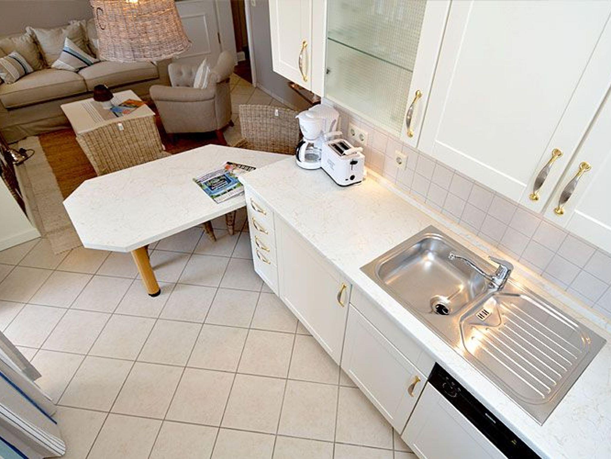 Die harmonisch im Wohnbereich integrierte Küchenzeile ist ausgestattet mit einem Kühlschrank mit Gefrierfach, einem 4-Platten-Ceranfeld, einer Spülmaschine, einer Mikrowelle mit Grillfunktion und diversem Kleininventar, das die Küchenausstattung komplettiert.