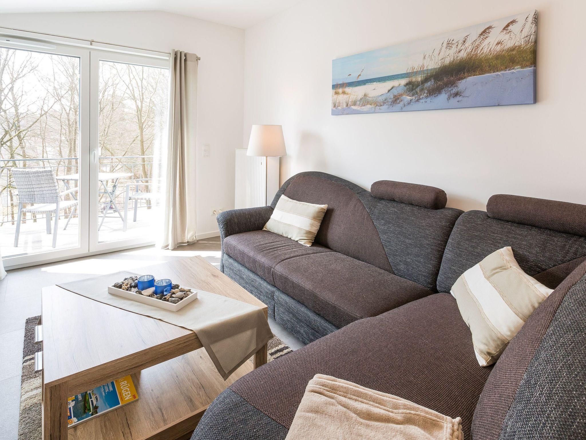 Vom Wohn- und Essbereich aus erreicht man den sonnigen Balkon. Lassen Sie Ihren Blick über die Rügener Natur schweifen und genießen Sie die Idylle auf den hochwertigen Gartenmöbeln.