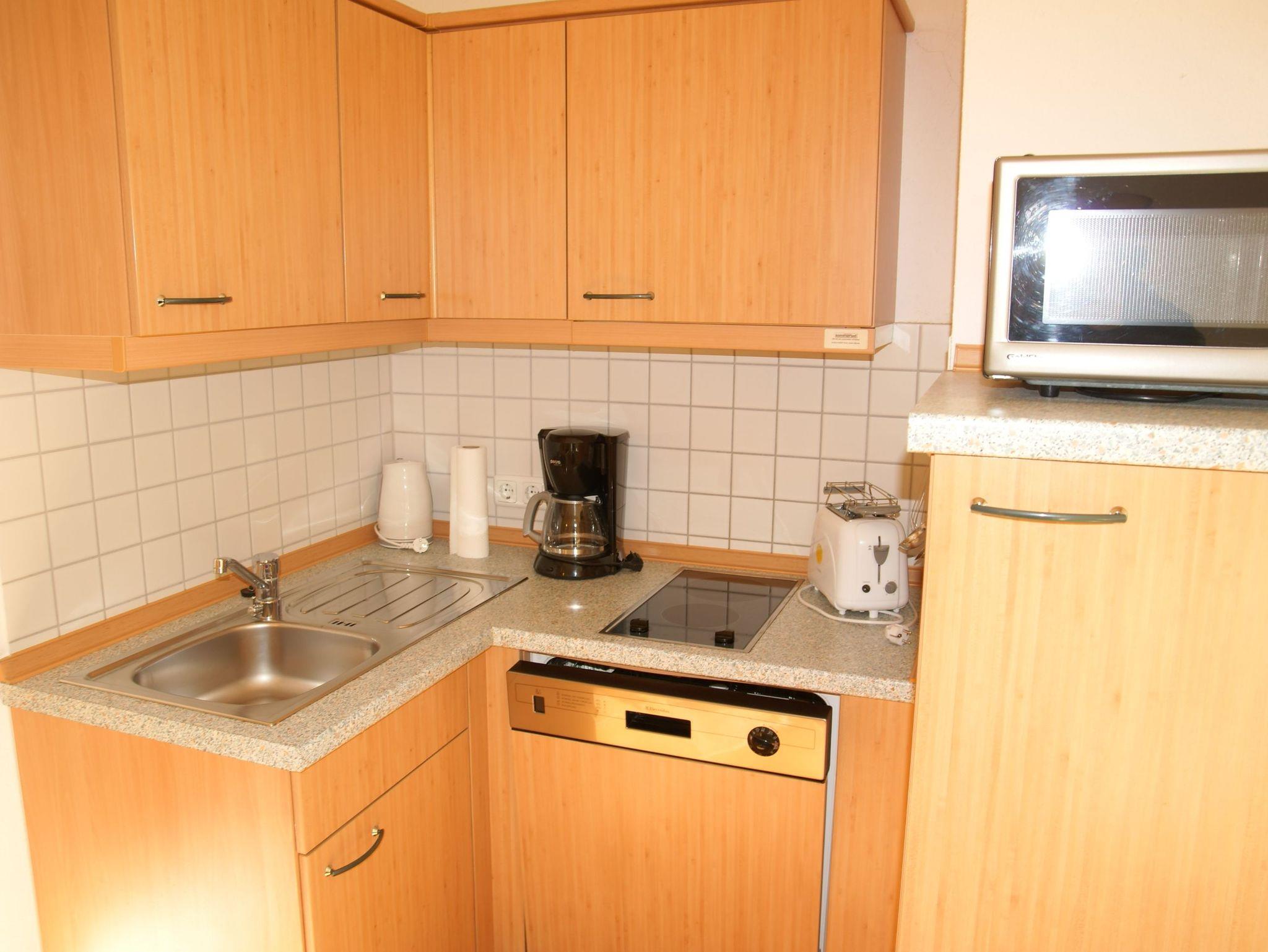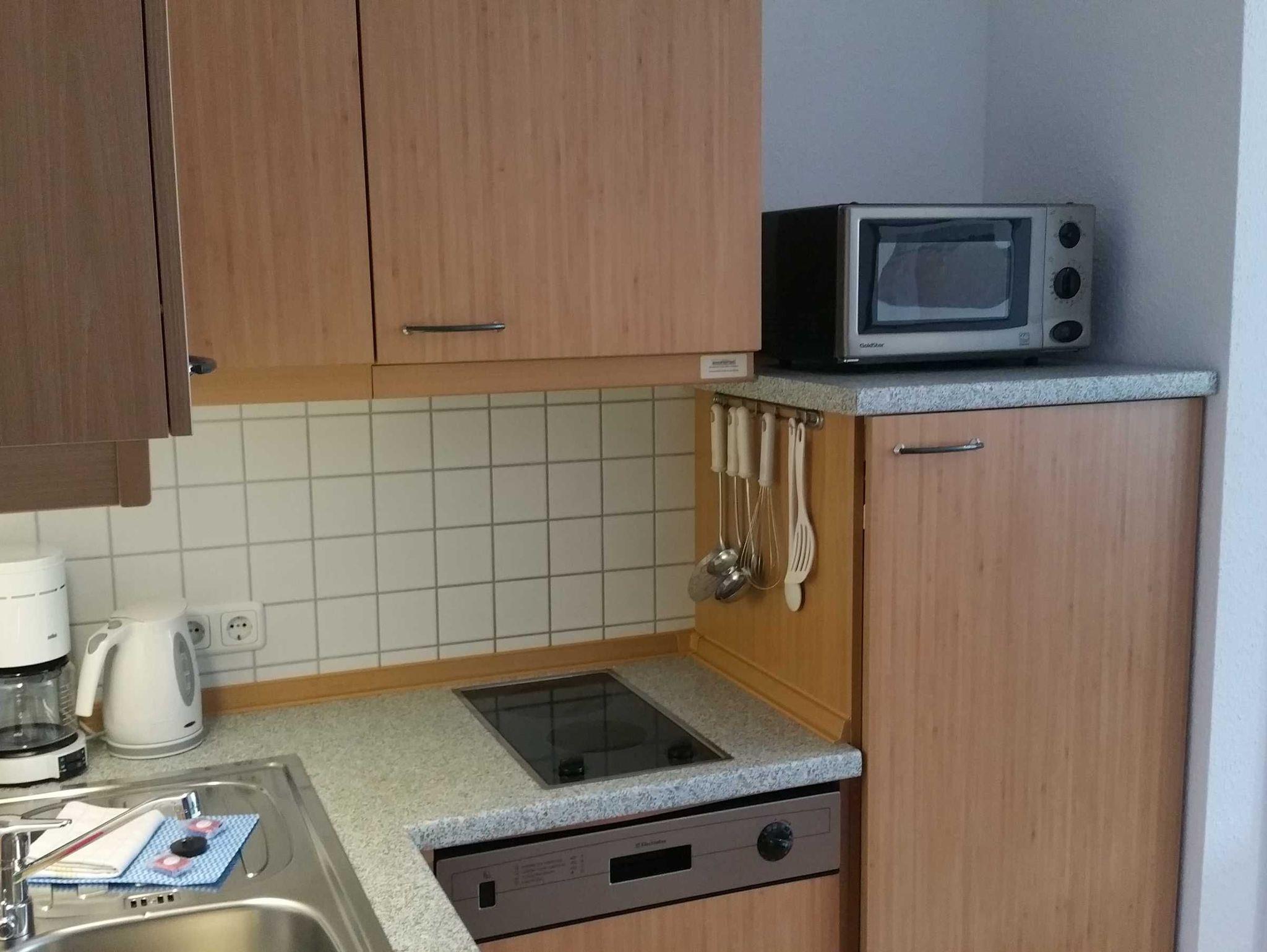 • Küche mit Ceranfeld, Geschirrspüler, Mikrowelle, Geschirrspüler, Toaster, Wasserkocher, Kaffeemaschine.