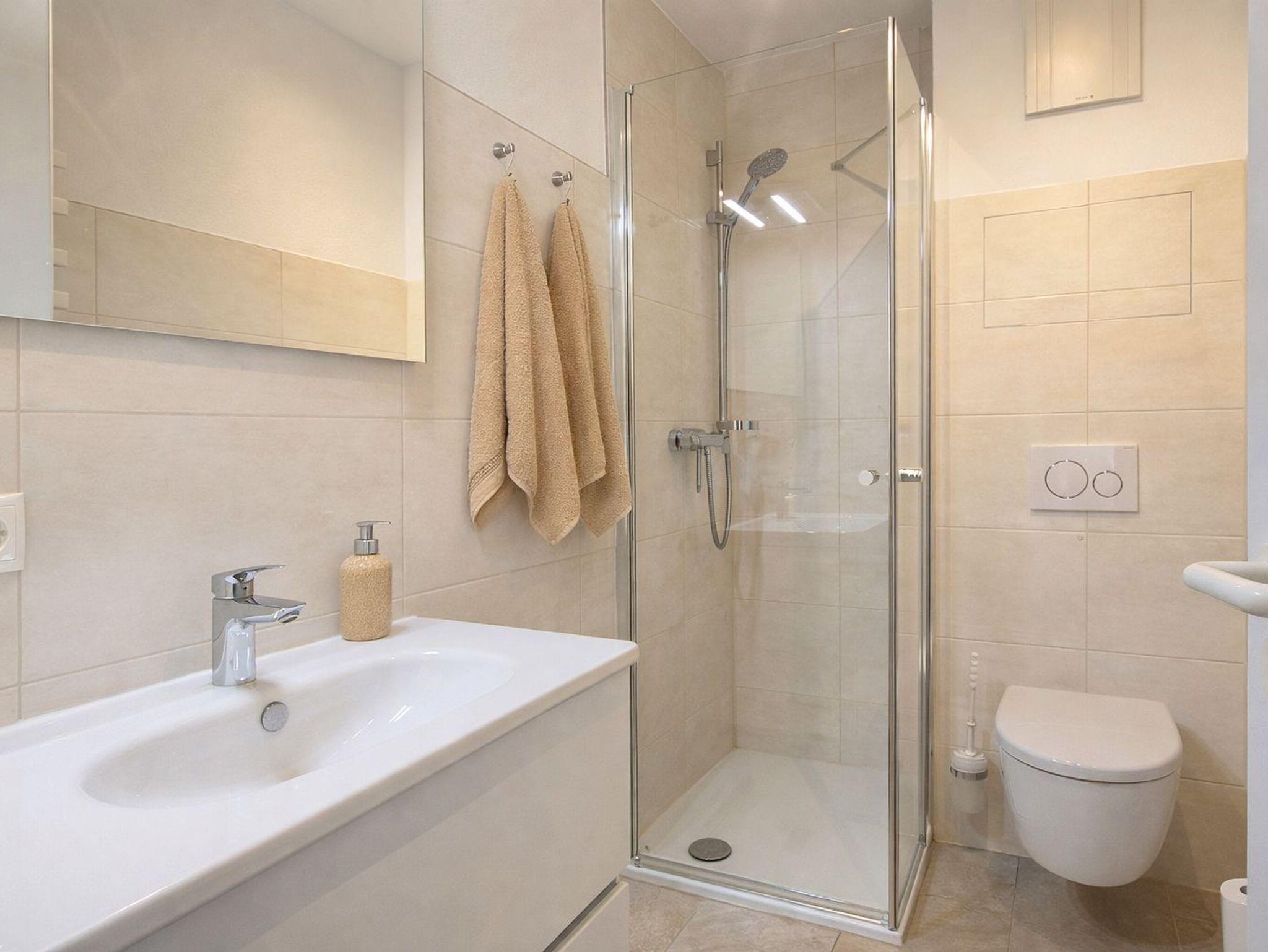 Im Schlafzimmer befindet sich ein Doppelbett und Kleiderschrank. Auch ein Kinderreisebett findet ausreichend Platz. Das moderne Bad ist mit einer ebenerdigen Dusche und WC versehen.