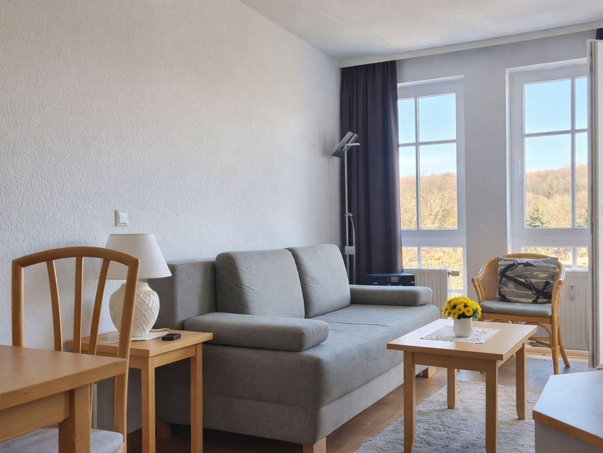 • WOHNEN: Wohnraum mit bequemer Schlafcouch, Smart-TV
