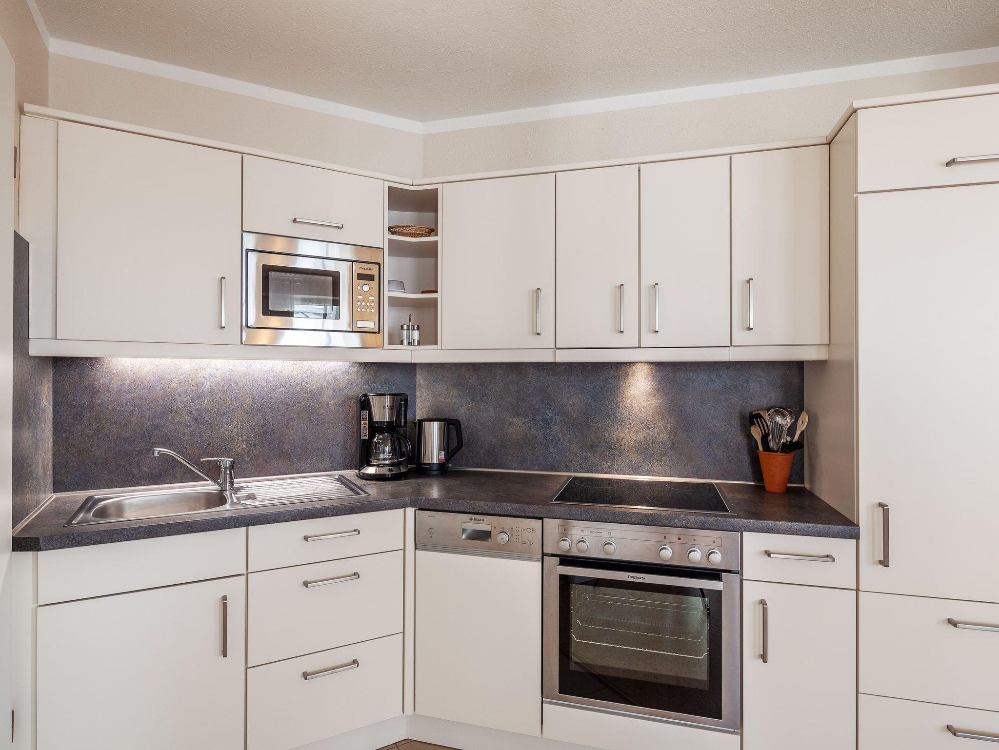 Die Ferienwohnung verfügt über kostenfreies WLAN und die Erstausstattung an Bettwäsche ist inklusive. Das Schlafzimmer mit Verdunklung verfügt über ein Doppelbett, im Wohnzimmer befindet sich zusätzlich eine Doppelschlafcouch. Darüber hinaus verfügt die Ferienwohnung über ein Bad mit ebenerdiger Dusche, Föhn und Kosmetikspiegel sowie ein separates WC. Die voll ausgestattete, offene Küche mit Backofen, Mikrowelle, Geschirrspüler, Kaffeemaschine und Toaster lässt keine Wünsche offen. Ein Fernseher inkl. 3 Sky-Sender rundet die hochwertige Einrichtung ab.