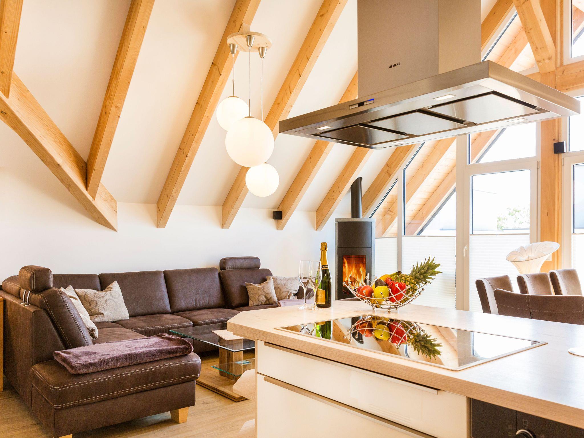 Schon in der großzügigen Diele erwartet Sie eine helle Leseecke mit Relaxstuhl. Im großen Wohn- und Küchenbereich mit direkter Sicht auf die hohe Kathedralen-Decke befindet sich die offene, voll ausgestattete Küche mit vielen Extras. Perfekt geplant lädt diese Freunde der kulinarischen Unabhängigkeit zu ausgiebigen Kochabenden ein.