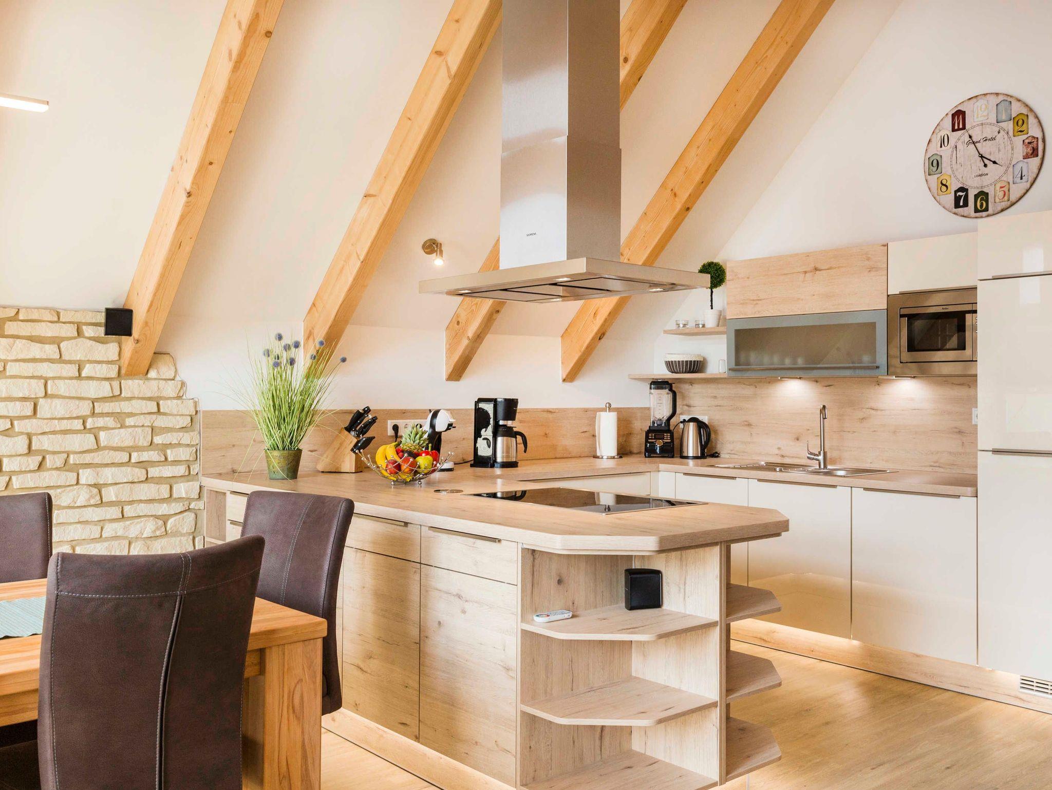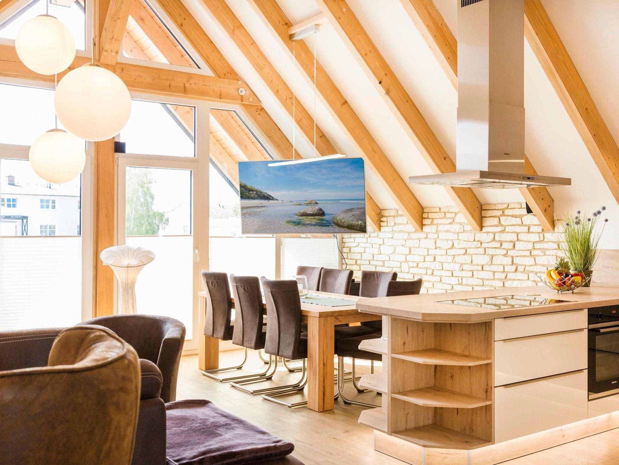 Schon in der großzügigen Diele erwartet Sie eine helle Leseecke mit Relaxstuhl. Im großen Wohn- und Küchenbereich mit direkter Sicht auf die hohe Kathedralen-Decke befindet sich die offene, voll ausgestattete Küche mit vielen Extras. Perfekt geplant lädt Freunde der kulinarischen Unabhängigkeit zu ausgiebigen Kochabenden ein.